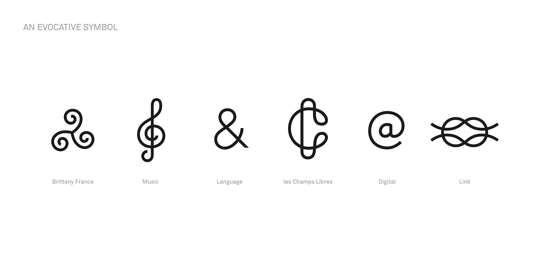 Une certaine rondeur qui correspond mieux à la Bretagne et à l’imaginaire du triskèle, des nœuds marins… Le bâtiment caché par la gare, doit s’ouvrir vers le cœur de ville. Pour cela, Les Champs Libres devaient se doter d’une identité visuelle mémorable et reconnaissable qui permette d'affirmer le lieu.