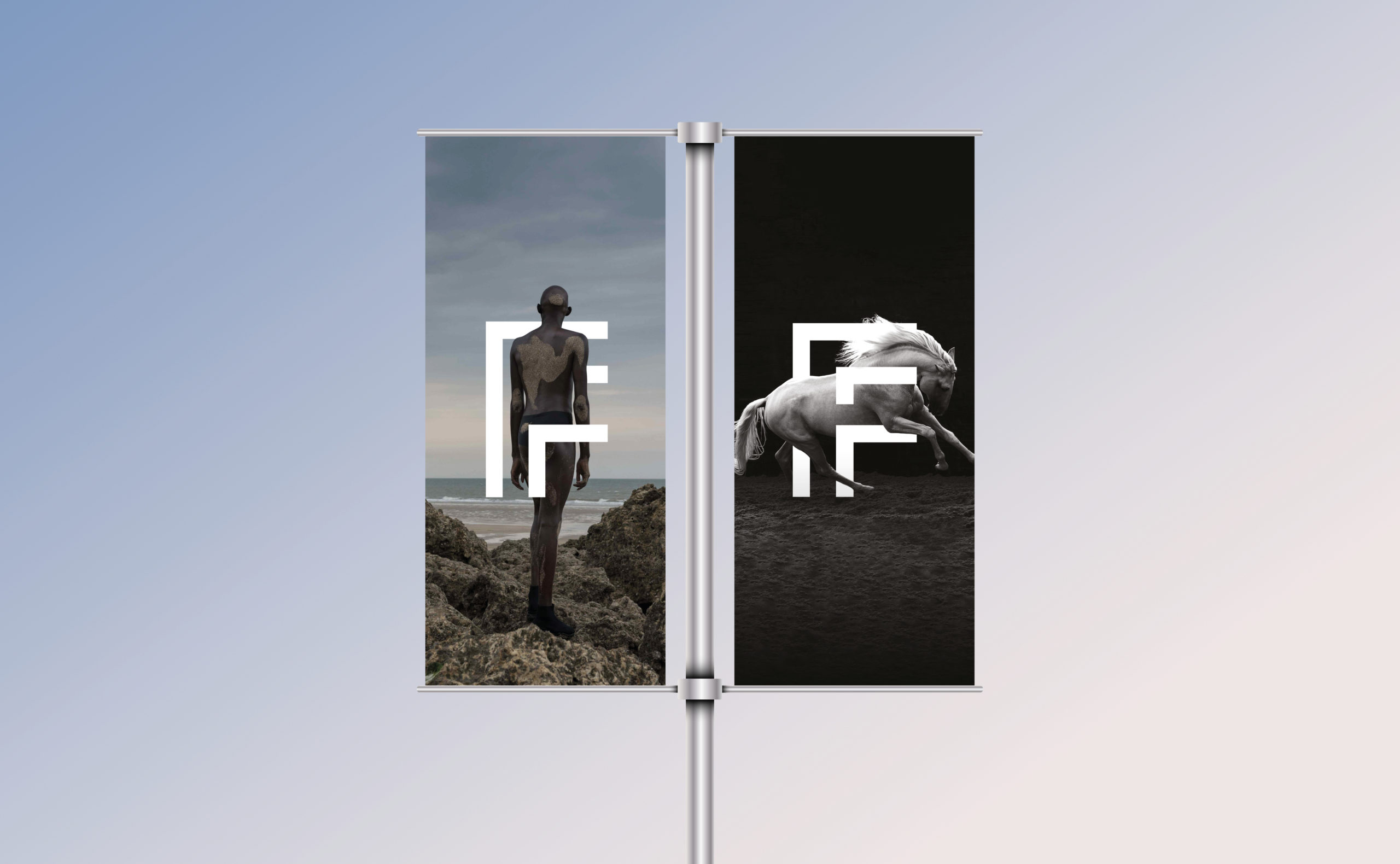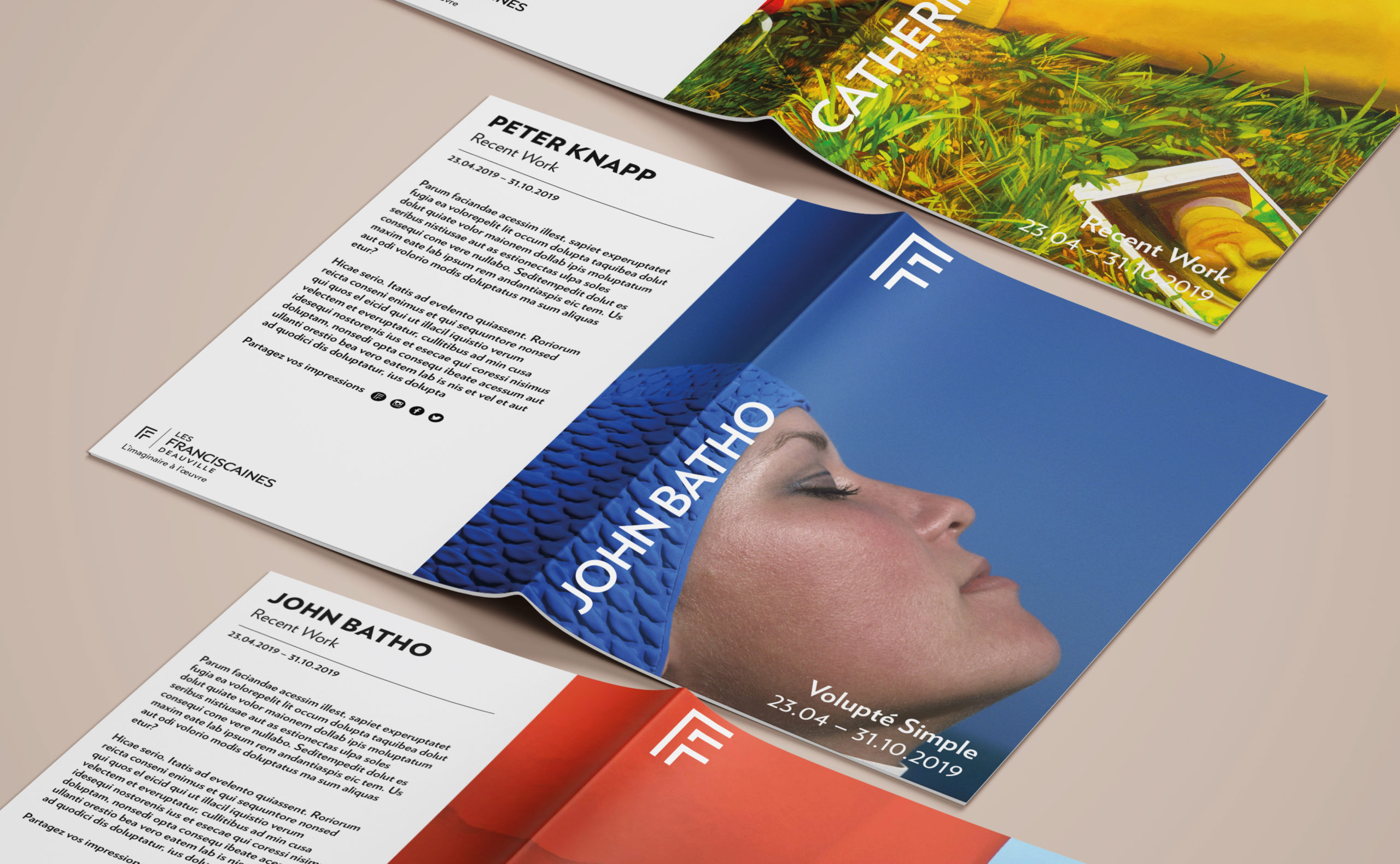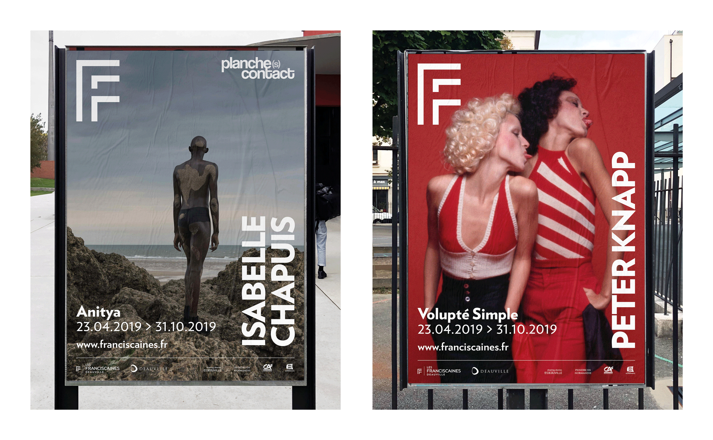 Afin de traduire la richesse culturelle des Franciscaines de Deauville, la charte graphique fait la part belle à l’image pour exprimer les artistes et les domaines de prédilection du territoire. Le monogramme joue avec l’image et s’entrelace à l’iconographie, apportant un relief supplémentaire aux visuels. L’interaction du logotype avec la programmation exprime l’échange et le partage qui se créé entre le public et la culture. C’est l’iconographie qui prend vie pour un lieu de vie. Les visuels s’additionnent parfois comme une pellicule photographique afin de représenter la diversité des univers.