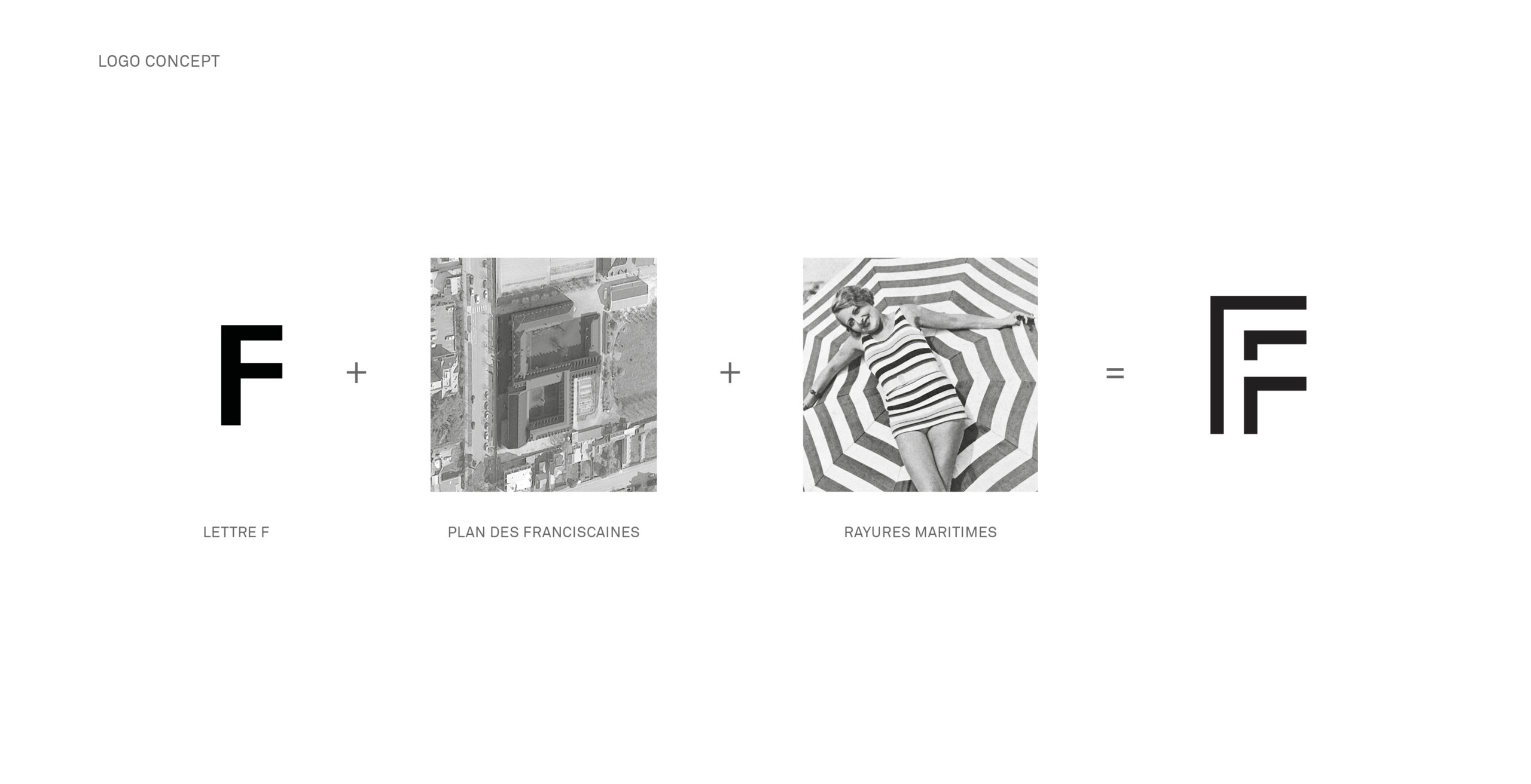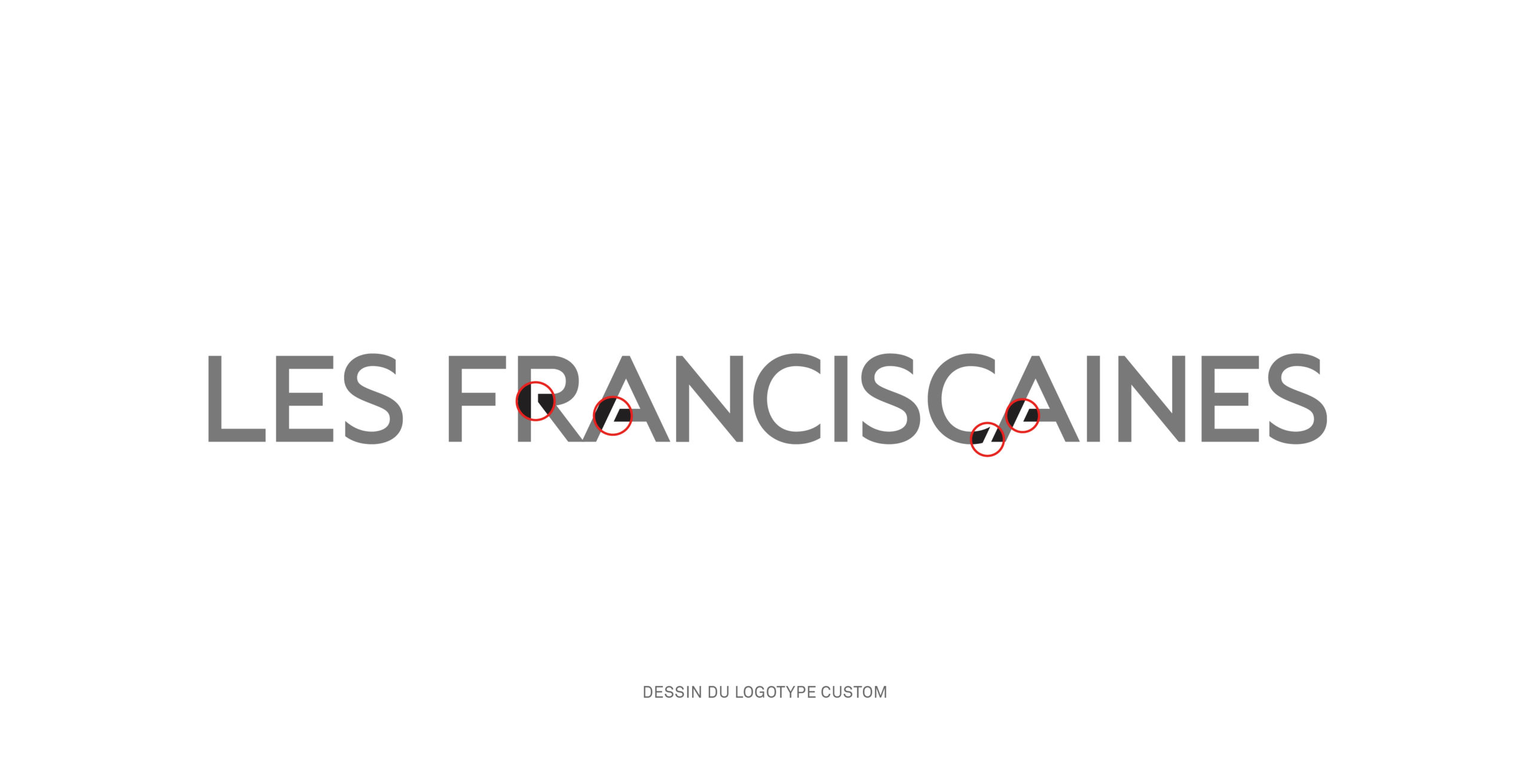 Le style géométrique « Belle Époque » et l’ouverture du monogramme communiquent l'ambition du lieu : un espace de circulation où la curiosité et le partage s’expriment. Le bloc typographique « Les Franciscaines » a été pensé avec une typographie inspirée de l’Art Déco, et adaptée pour le traitement en pochoir que nécessite la signalétique. L’ouverture des lettres A et R permet d’opérer une filiation graphique avec le style ouvert du monogramme. Il en résulte un logotype contemporain et statutaire.