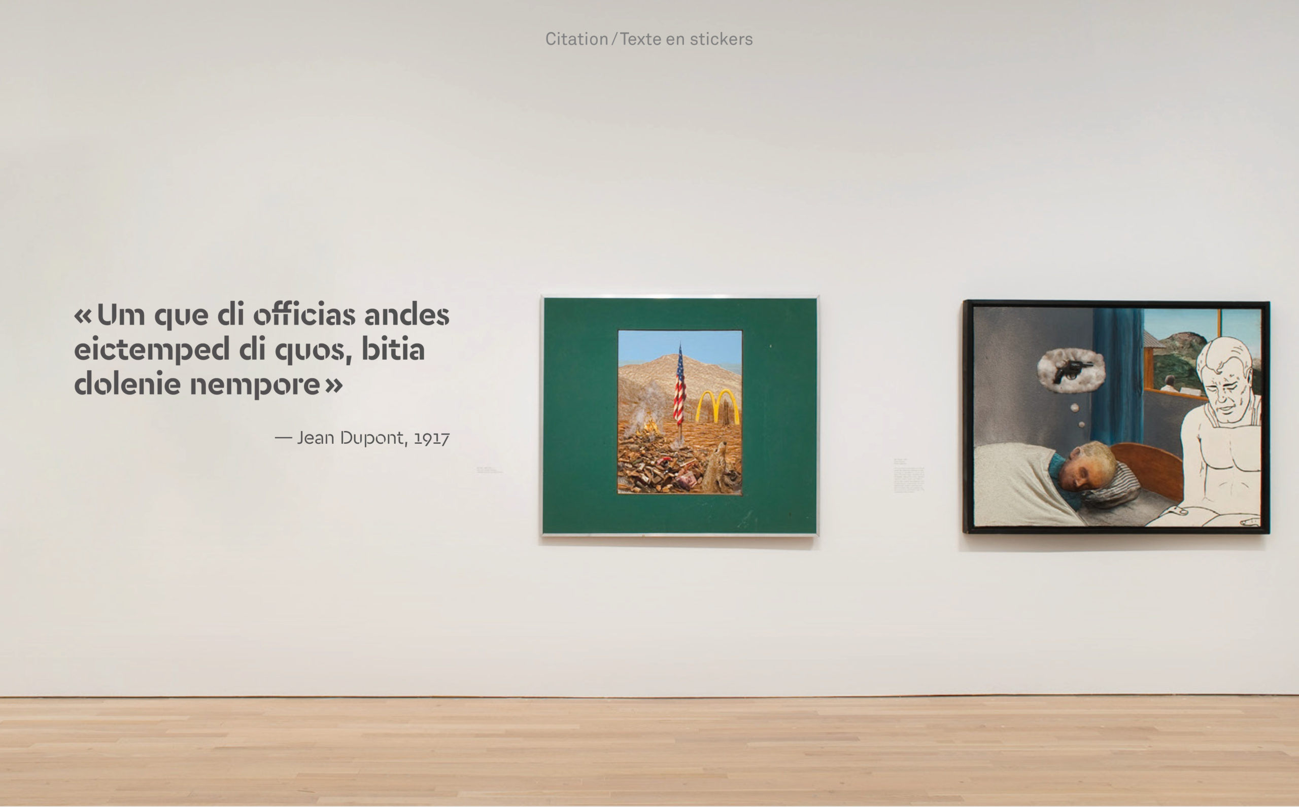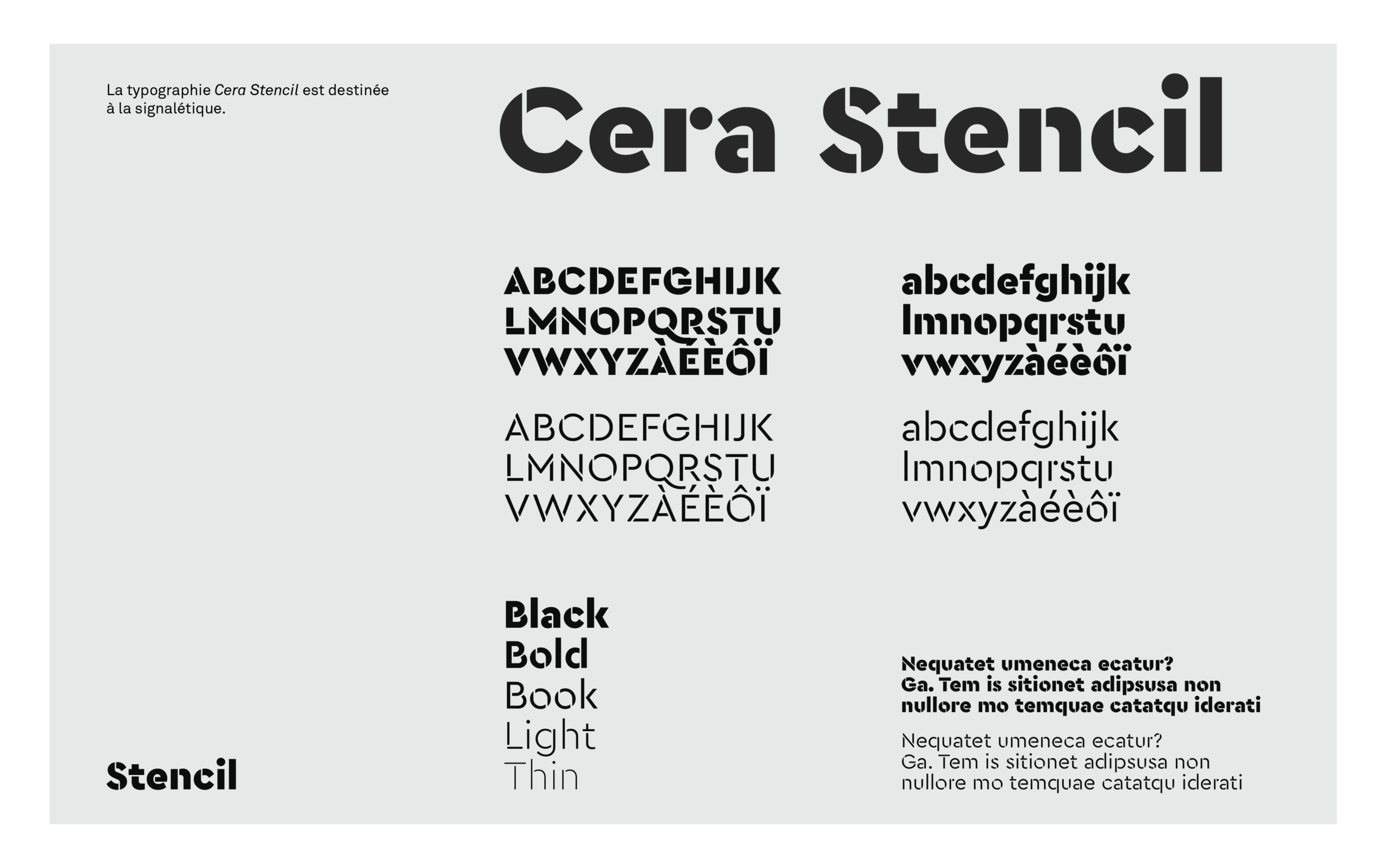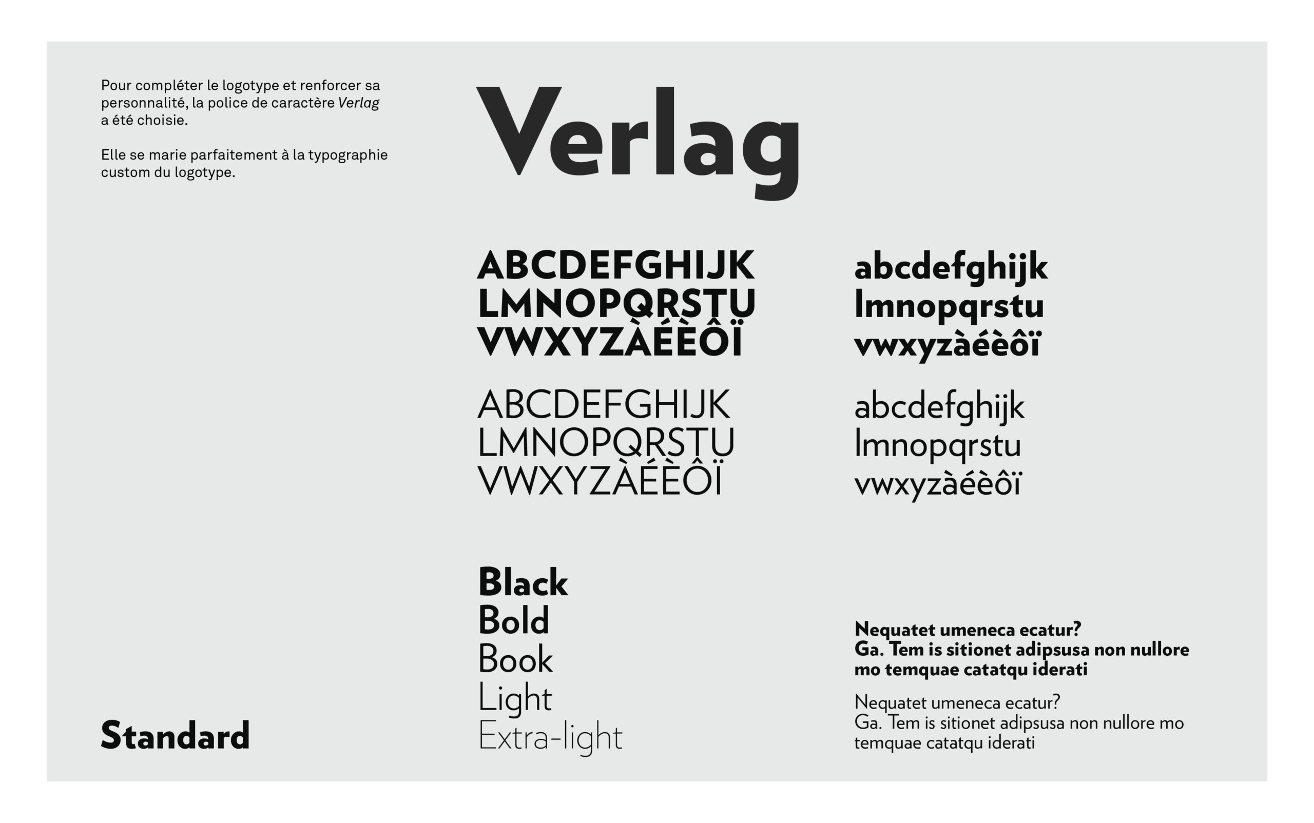 Les typographies Verlag et Cera Stencil ont été sélectionnées comme typographies d’accompagnement. Le Verlag prolonge directement le style architectural du lettrage dessinée pour le bloc marque. Son style fait écho au Bauhaus dans un registre moins géométrique, plus fin. La Cera Stencil avait initialement était choisie pour une application signalétique au pochoir. Cette dernière fonctionne très bien avec la Verlag et est également utilisée dans les éditions pour donner du relief avec des lettrines et des verbatims.