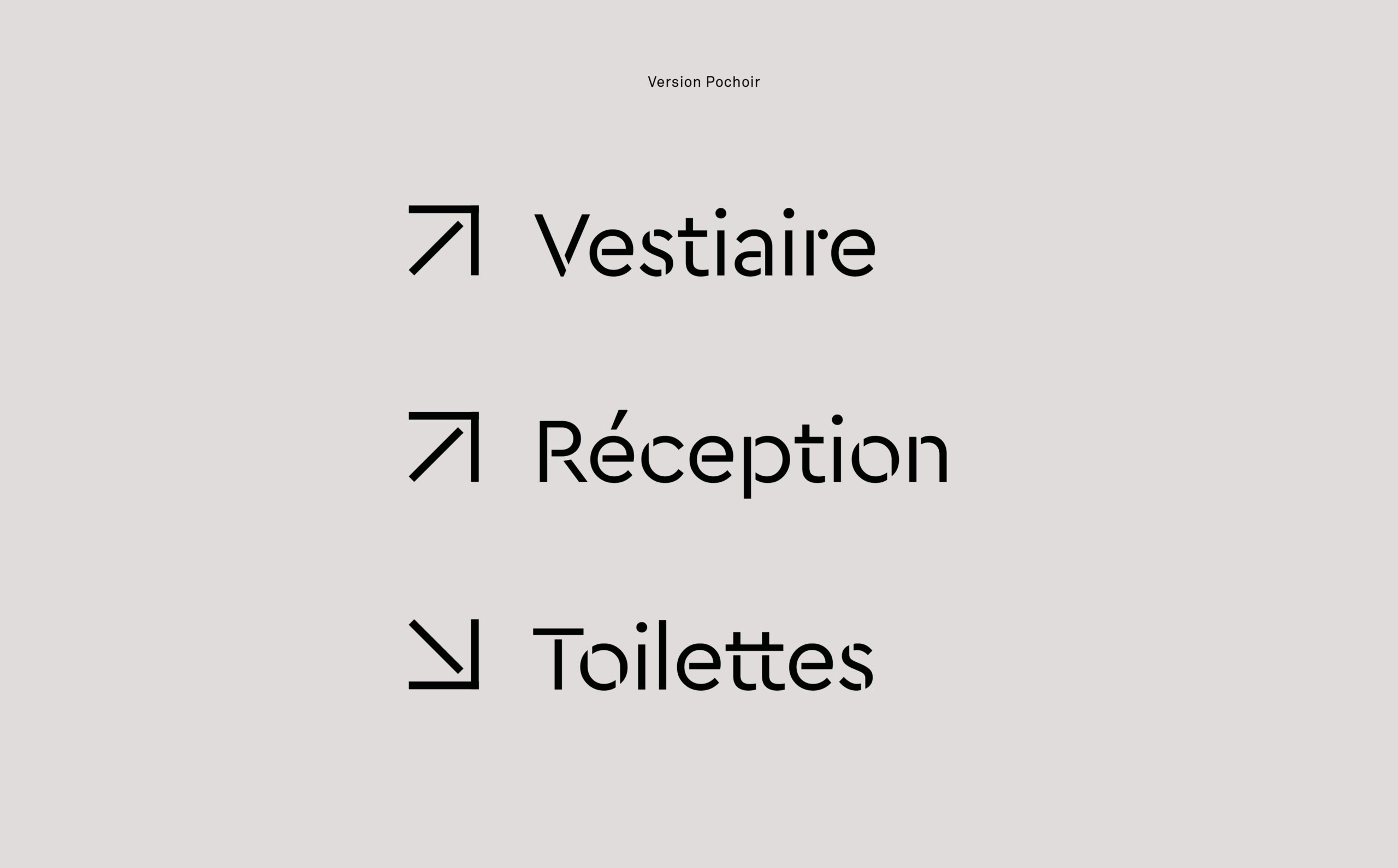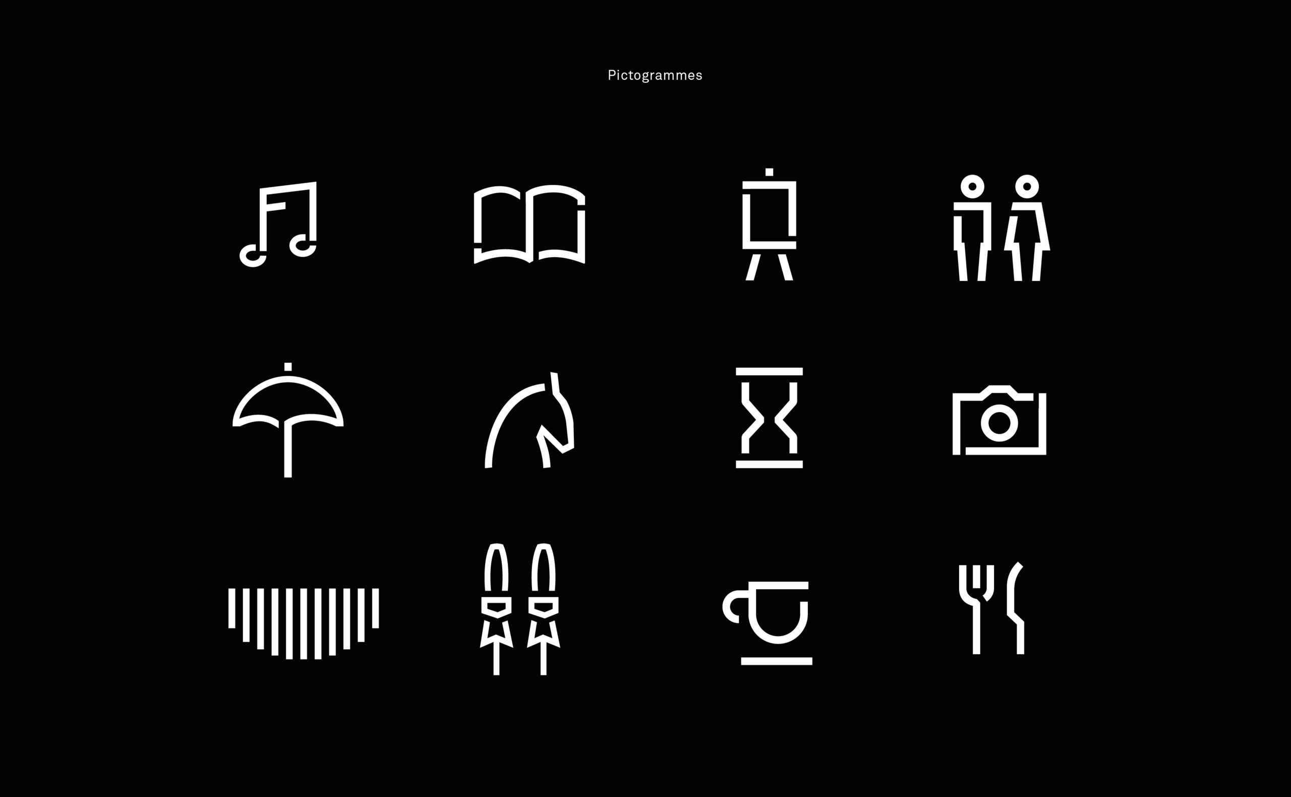 Ces intitulés s’intègrent verticalement dans les espaces pour augmenter le degré d’attention des visiteurs. Ils sont accompagnés d’une galerie de pictogrammes qui rappellent les grands thèmes de la ville : un cheval, un emblématique parasol, un appareil photo... Ces pictogrammes dessinés sur-mesure conservent un design "stencil" et fluide.