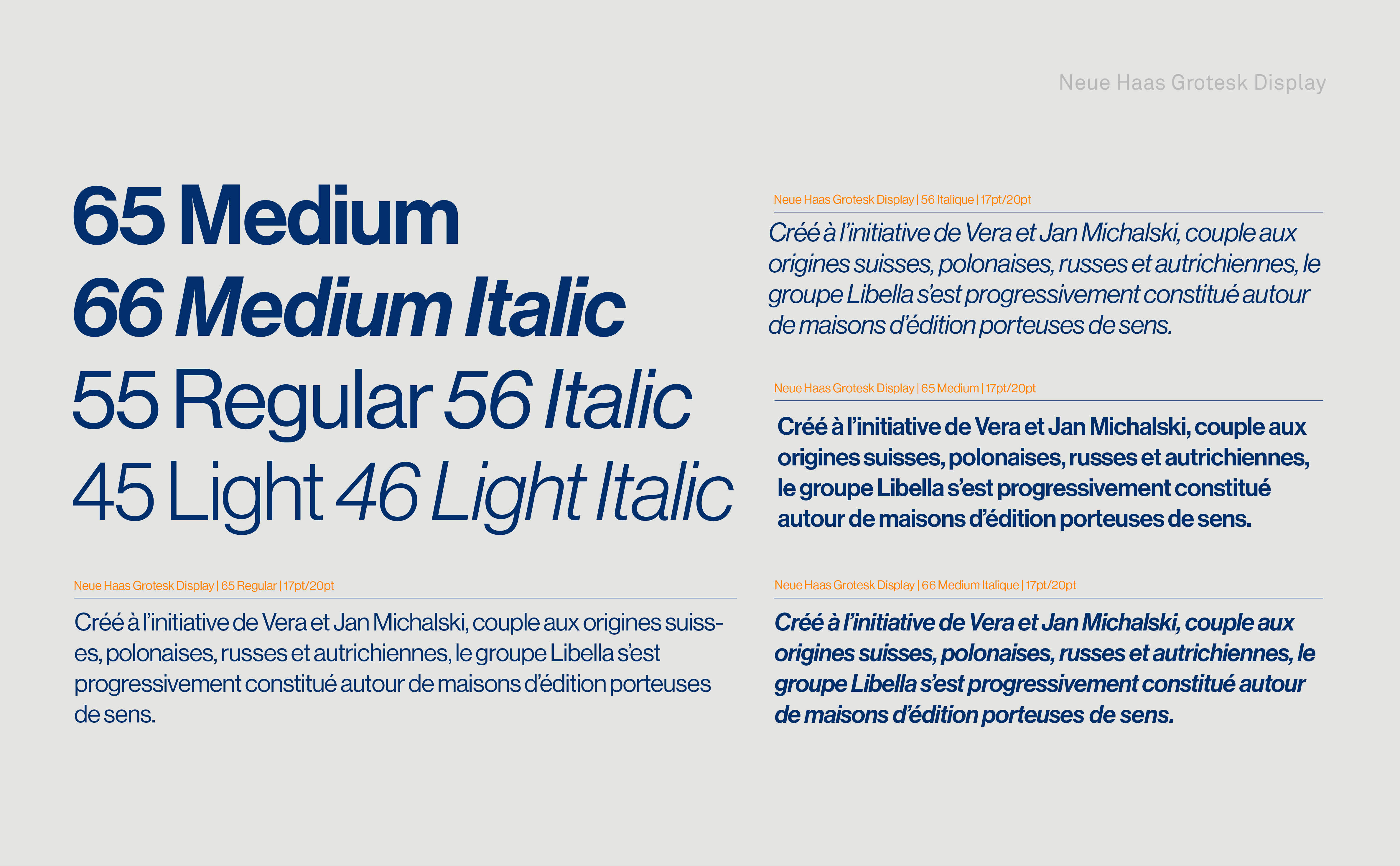 La baseline révèle le caractère Neue Haas Grotesk Display, une typographie sans sérif contemporaine composée en bas-de-casse. Il s’agit du nouveau caractère identitaire de LIBELLA.