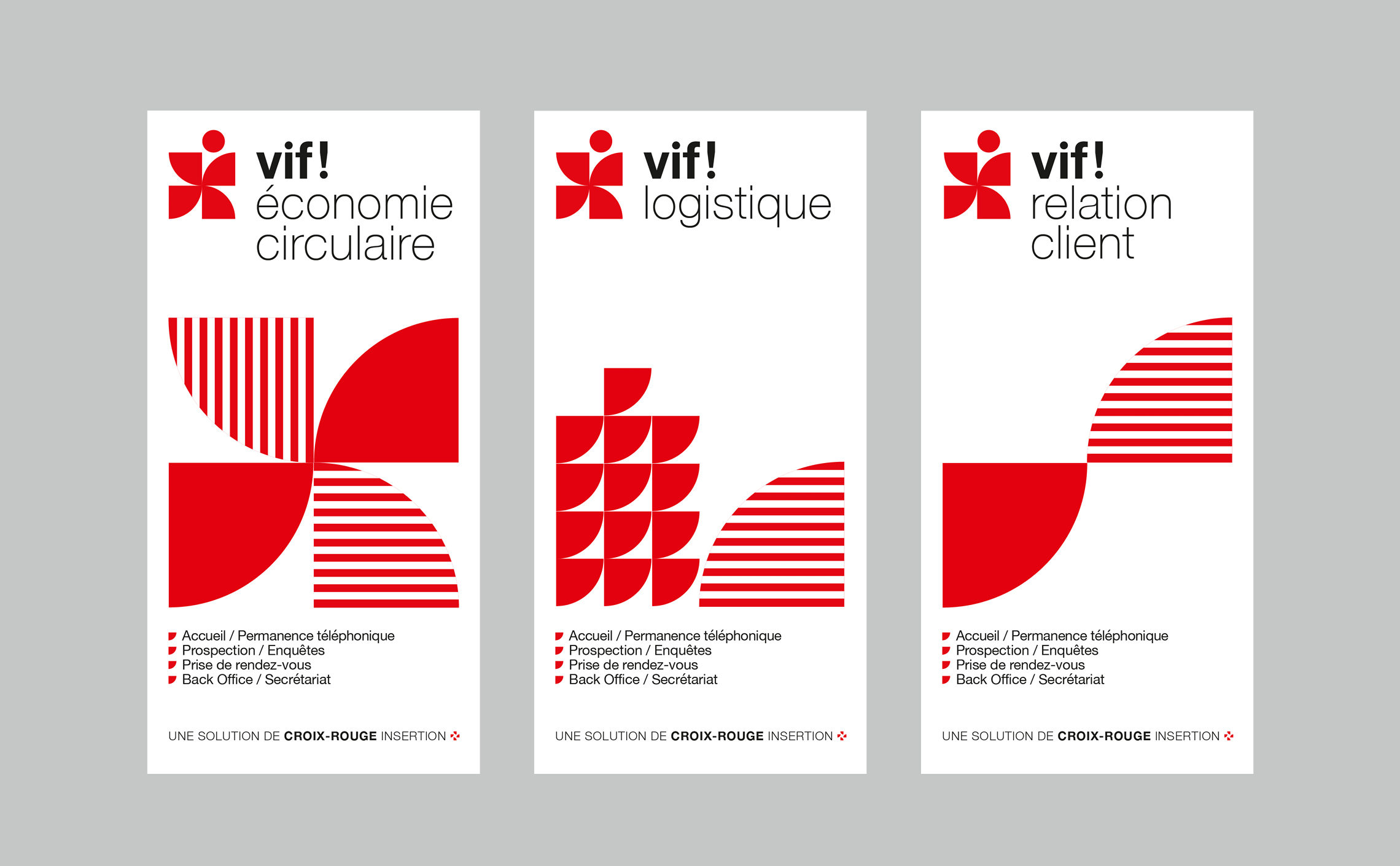 Le challenge pour Graphéine consistait à créer le nom et l'identité visuelle de cette marque BtoB (Vif!), ainsi que l'identité des Ateliers Croix-Rouge, la marque BtoC, dont le nom était déjà existant.