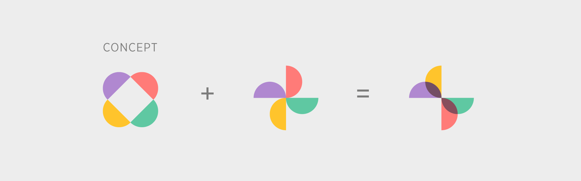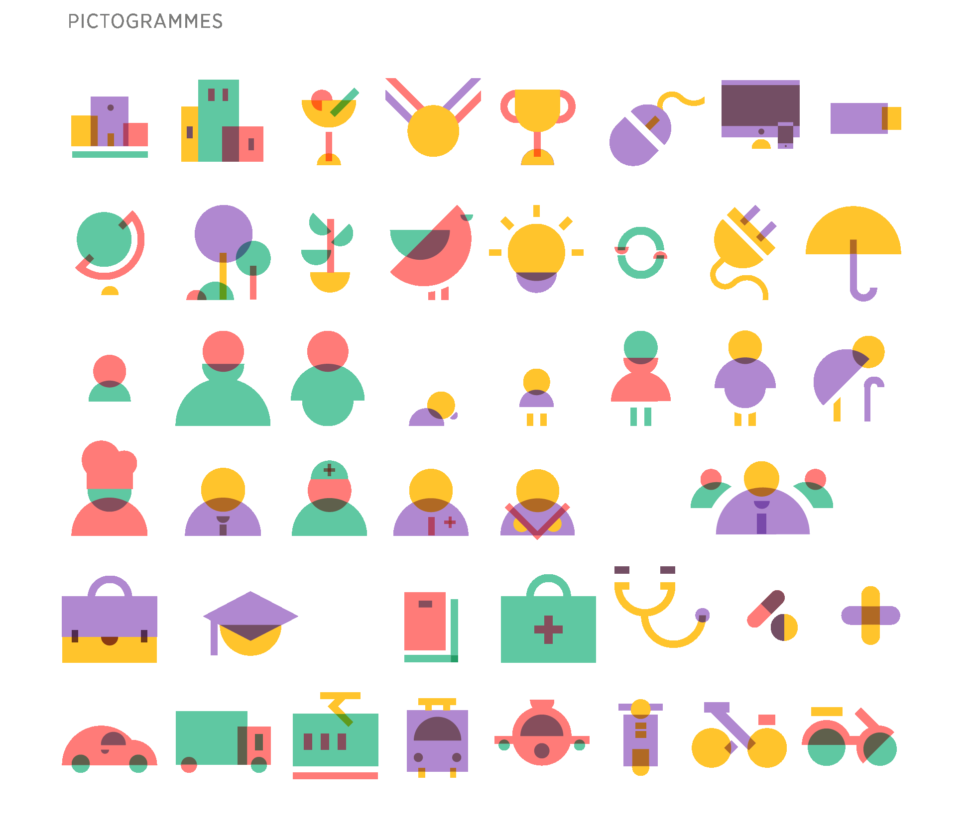 Toute la charte graphique va reprendre la simplicité géométrique du logo, ainsi que le jeu des 4 couleurs. Même les pictogrammes sont dessinés à partir de ces demi-cercles. Un exercice de style qui nous a bien amusés !