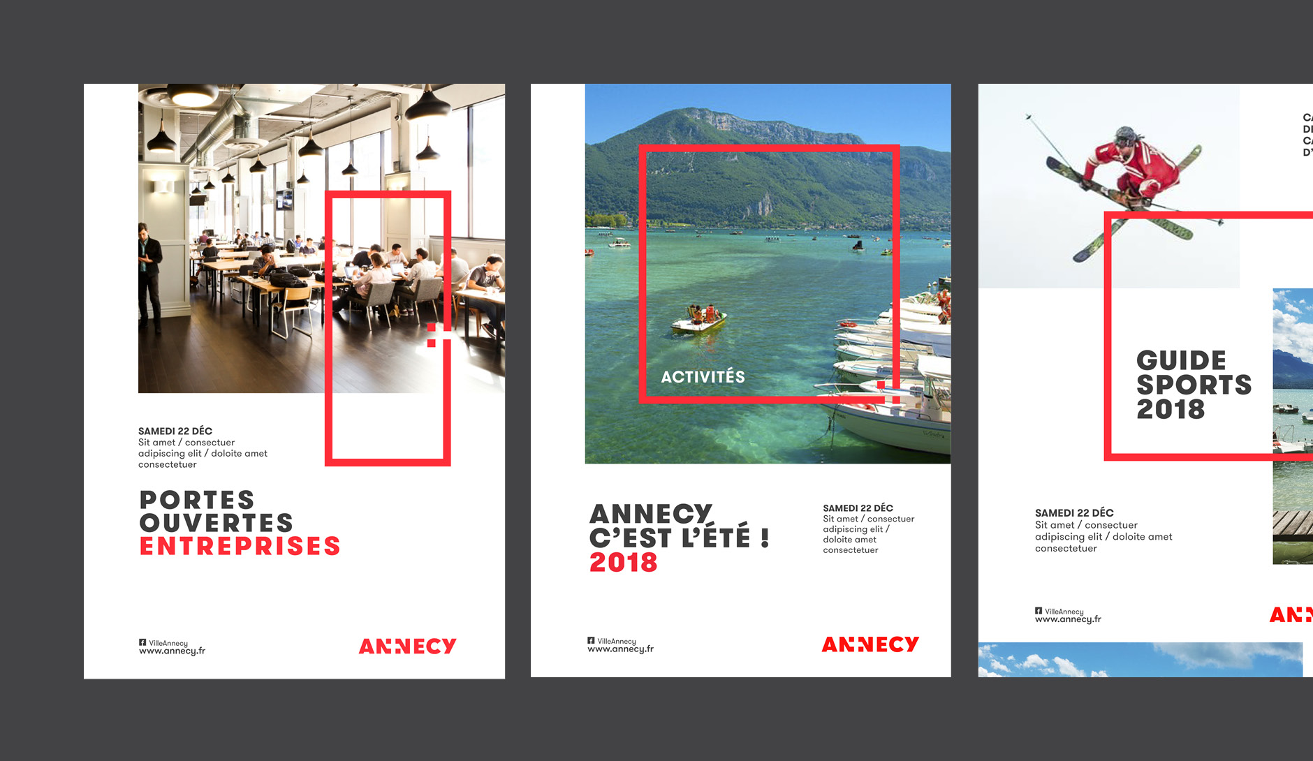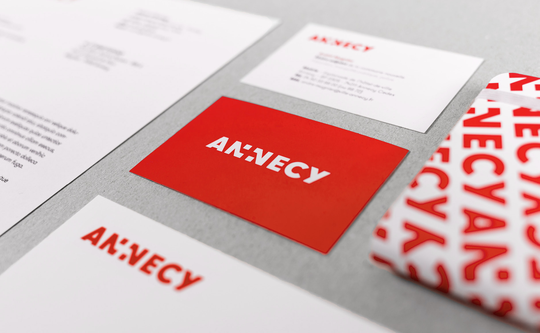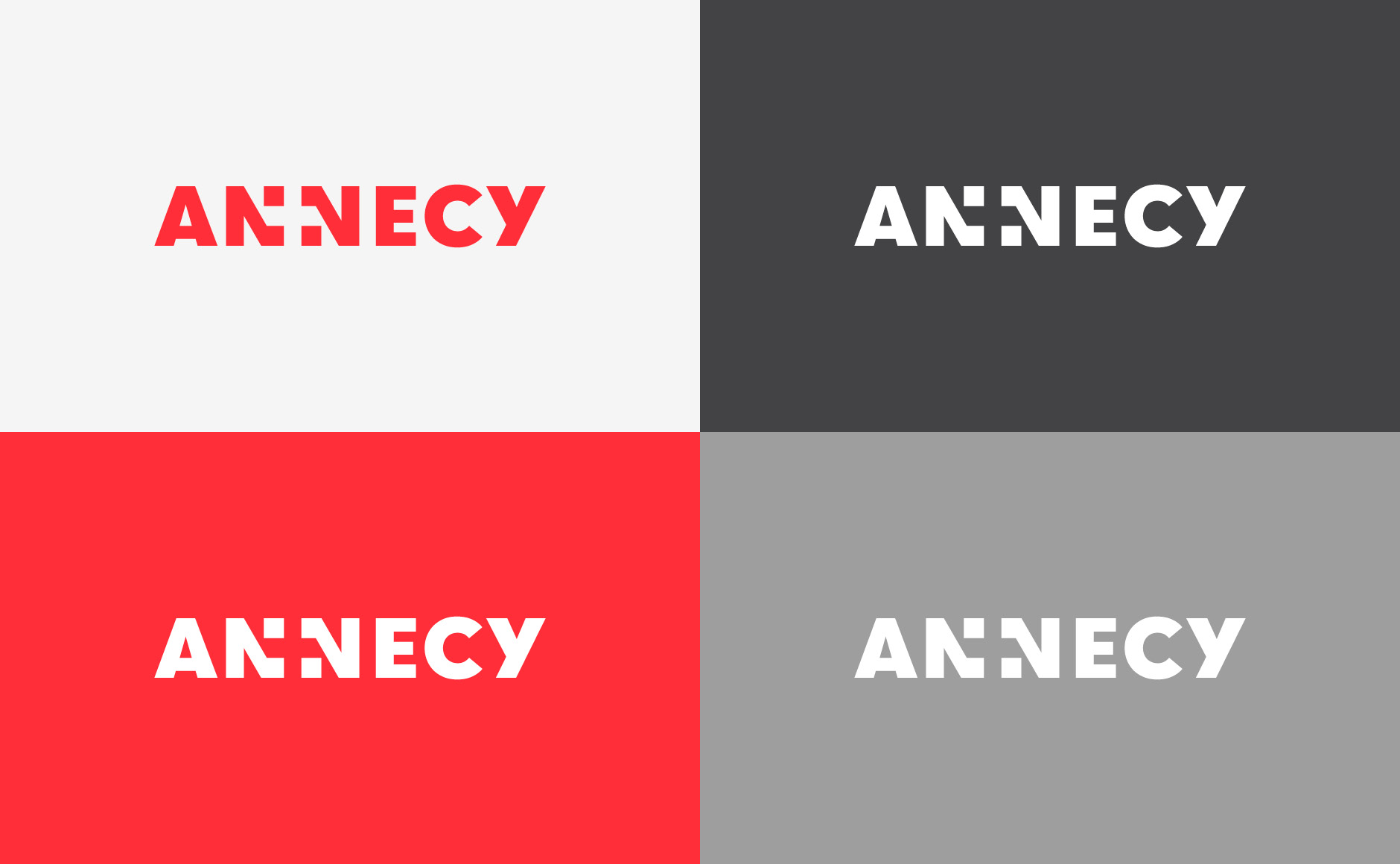 En choisissant d'intégrer le blason de la Savoie au sein du mot "ANNECY", le mot devient un signe. Il joue entre le lisible et le visible, dans une alternance optique saisissante. En résulte un logotype dont la simplicité semble une évidence : Annecy est la capitale de Haute-Savoie !