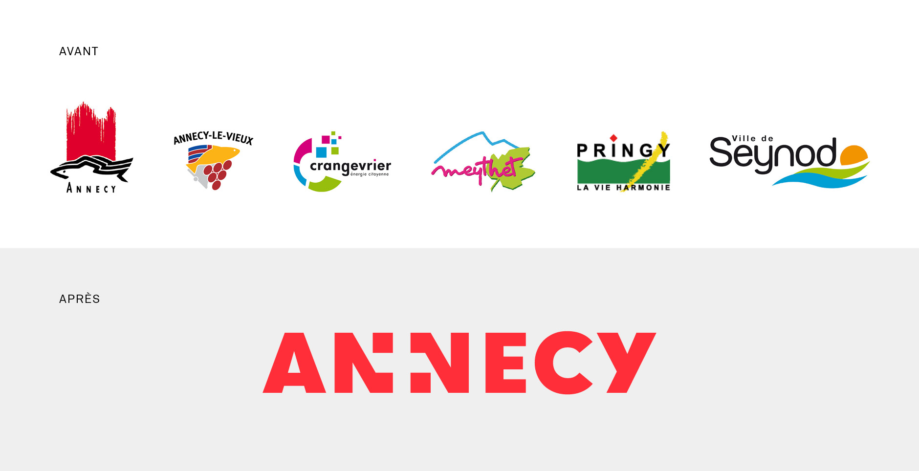 En 2016, les conseils municipaux des communes d’Annecy, d’Annecy-le-Vieux, de Cran-Gevrier, de Meythet, de Pringy et de Seynod votent en faveur de la création de la commune nouvelle d'Annecy. Elle voit officiellement le jour le 1er janvier 2017. C'est dans ce contexte que Graphéine est intervenu pour concevoir l'identité visuelle d'Annecy.