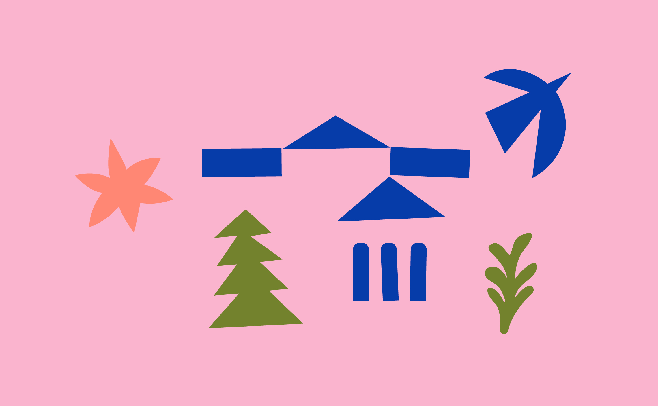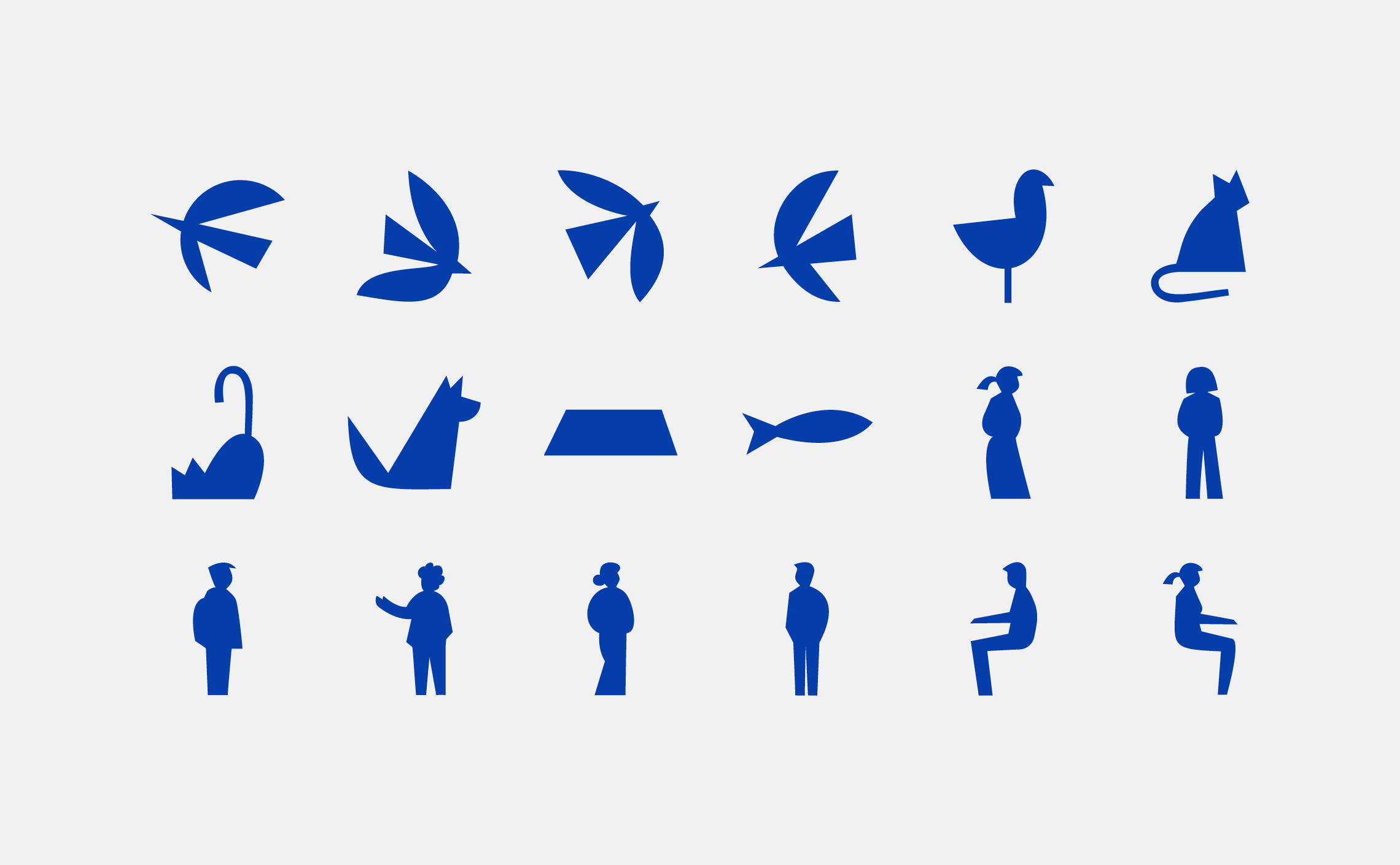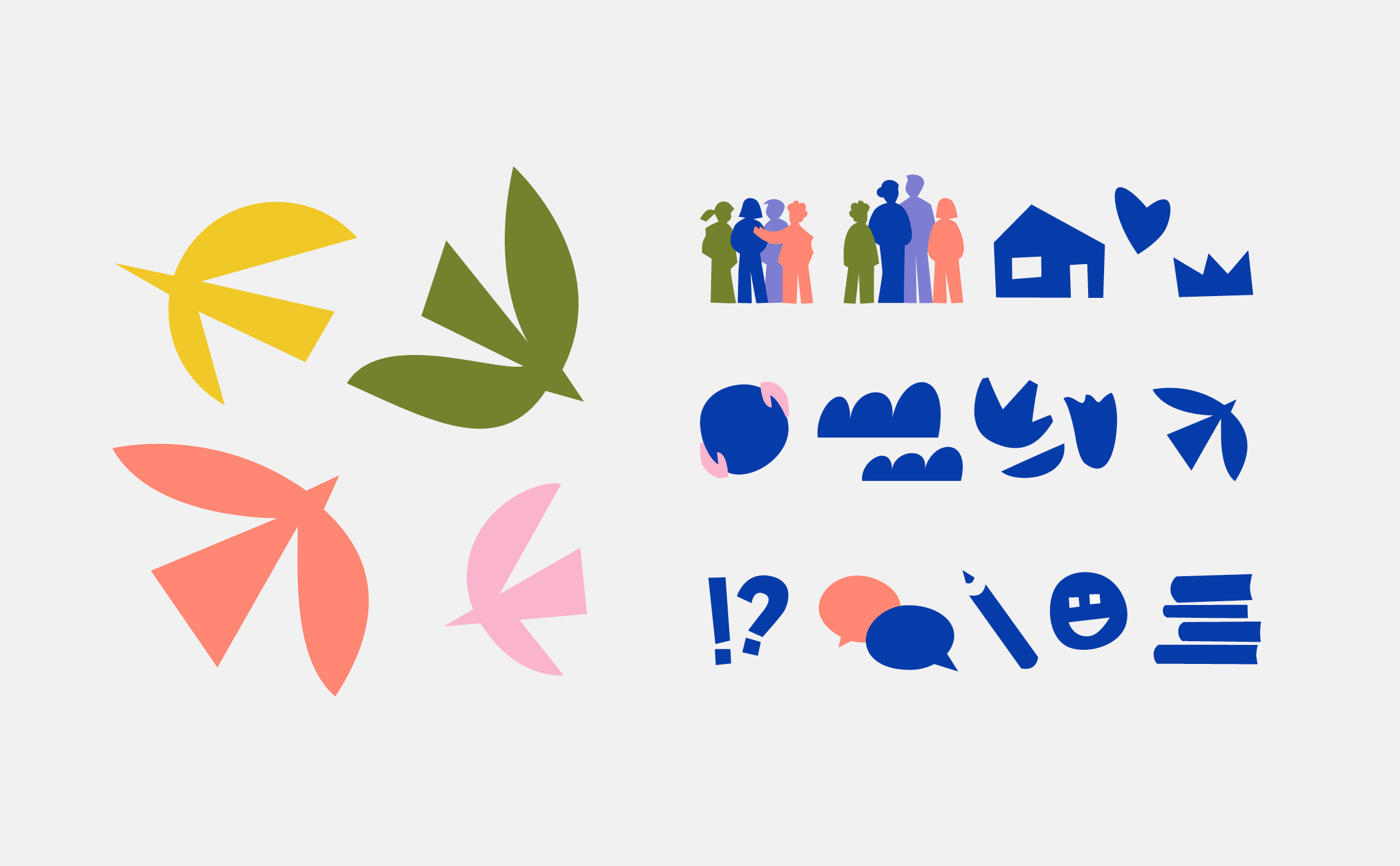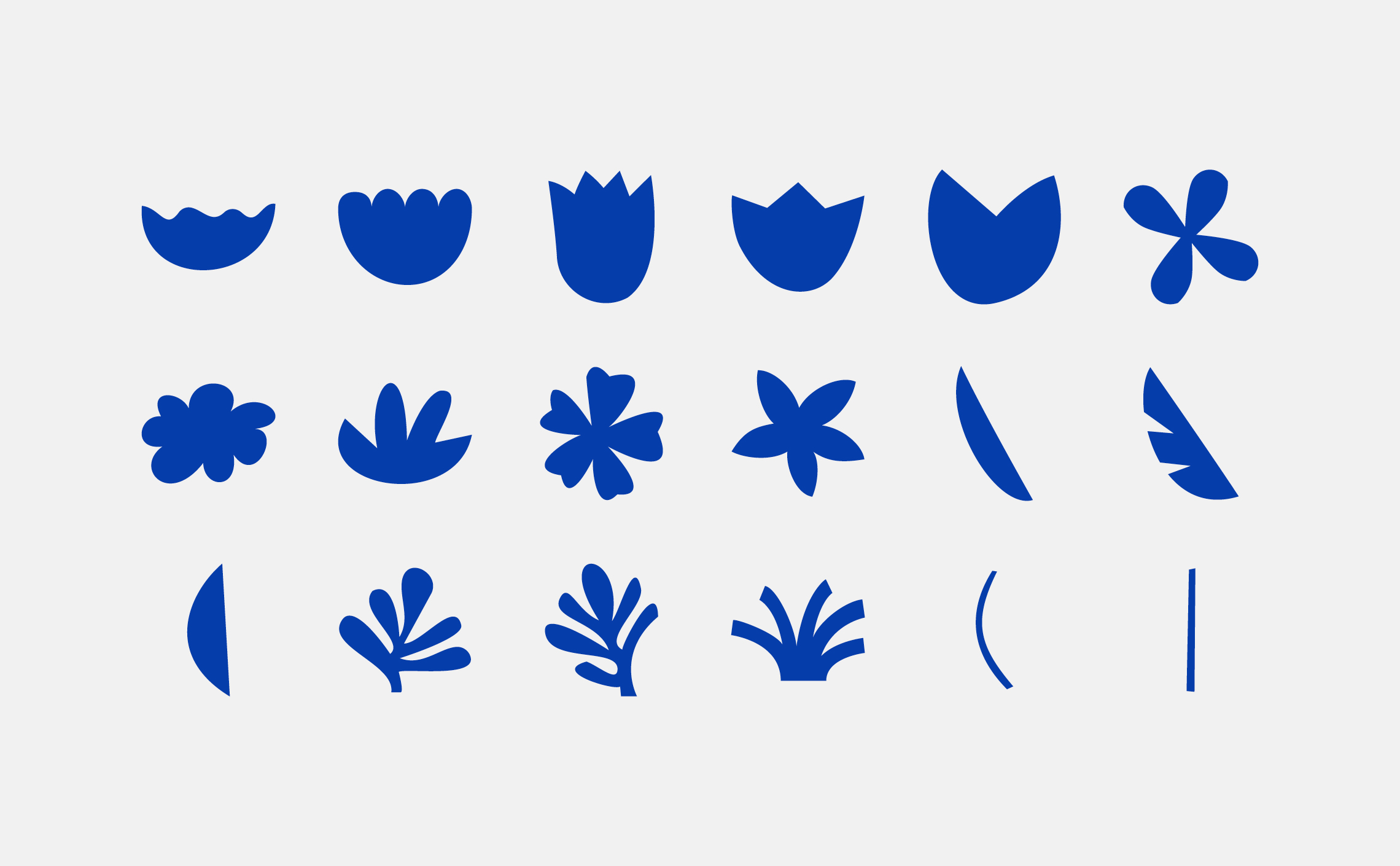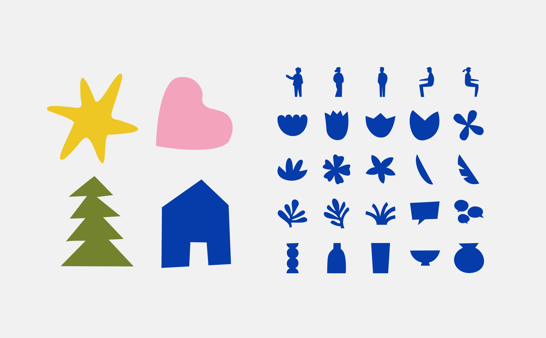 En accompagnement du logo, nous avons développé une gamme de formes et de pictogrammes, dans l'esprit “papier-découpé”. L'idée est d'utiliser ce langage visuel au fil des compositions.