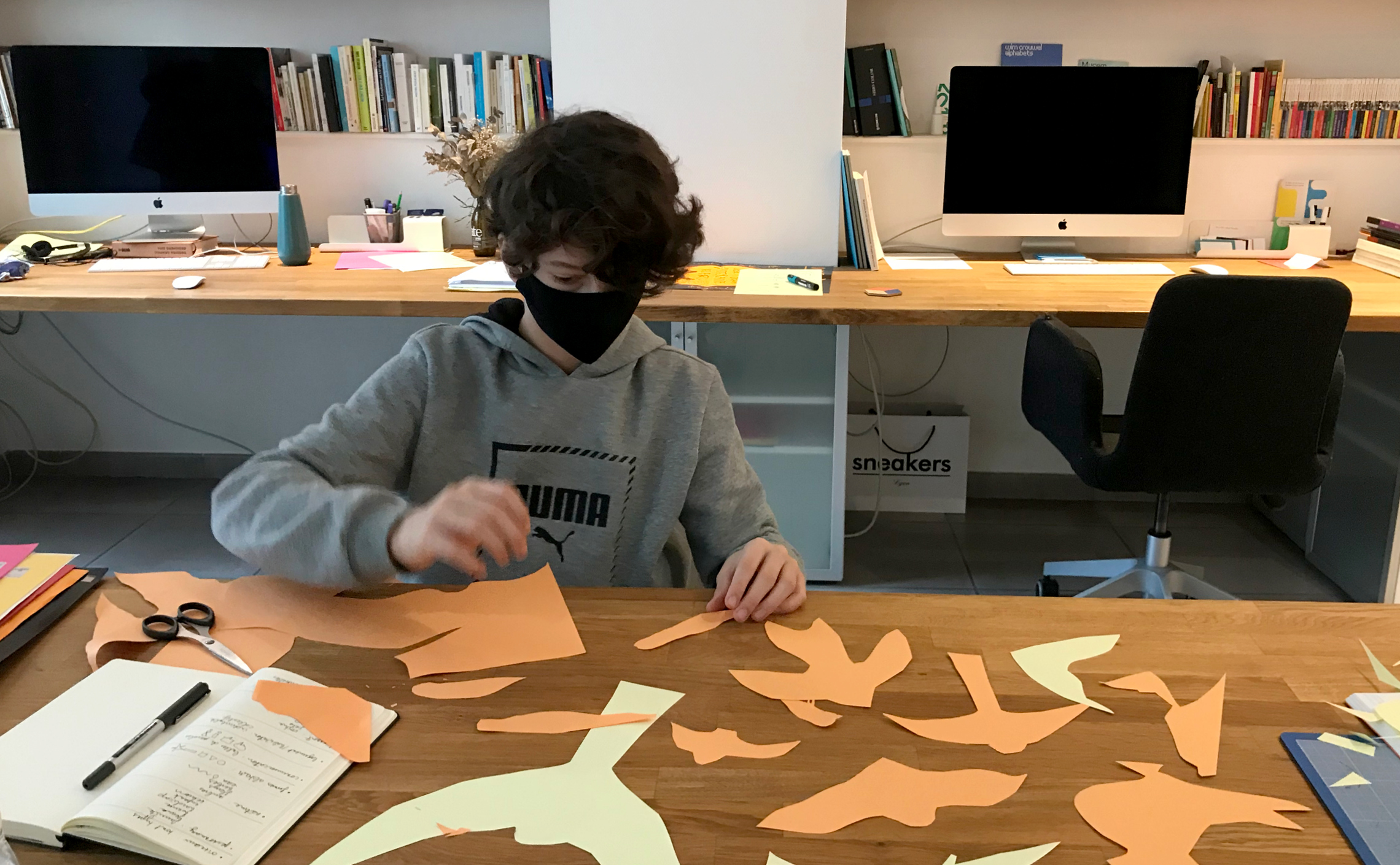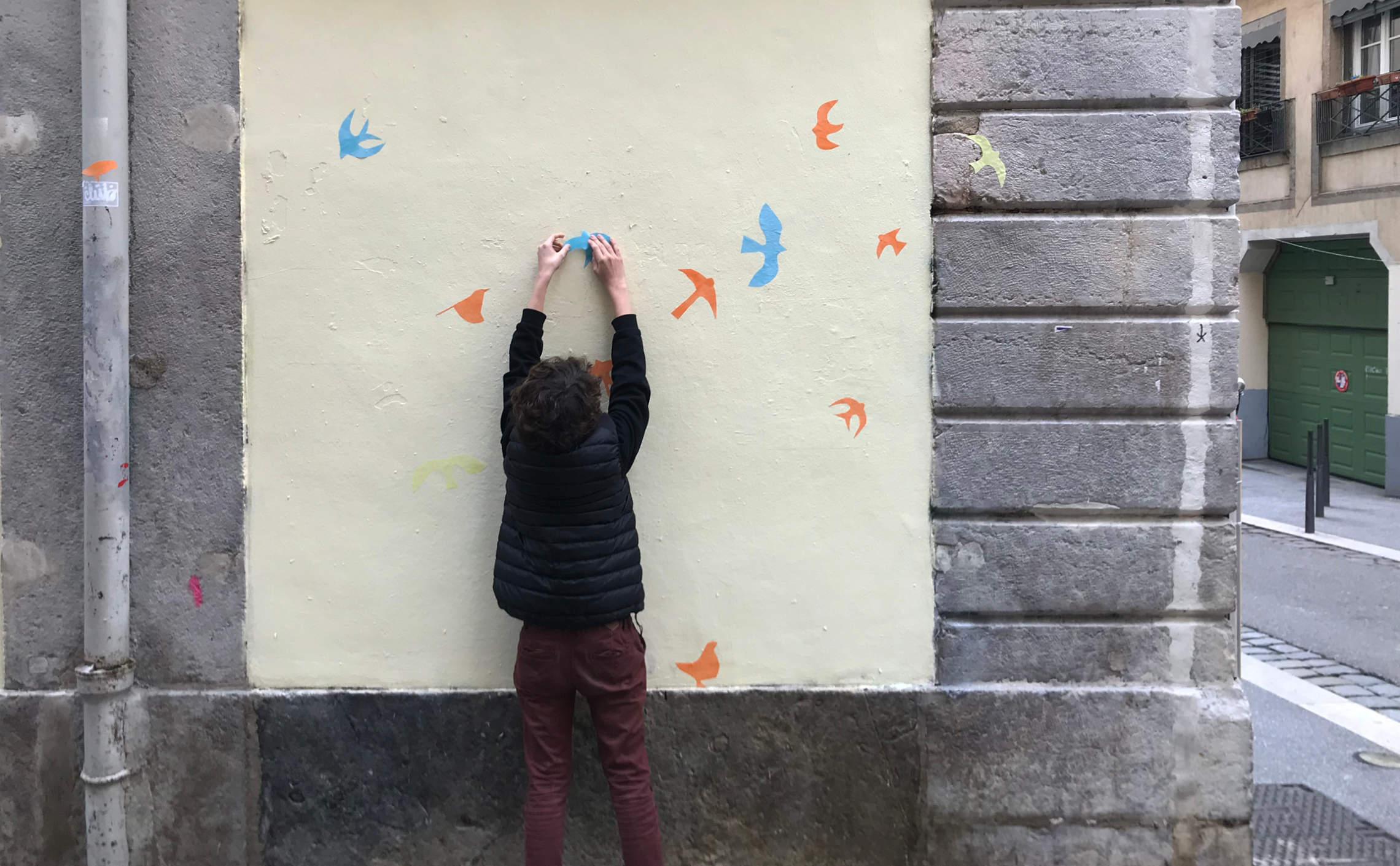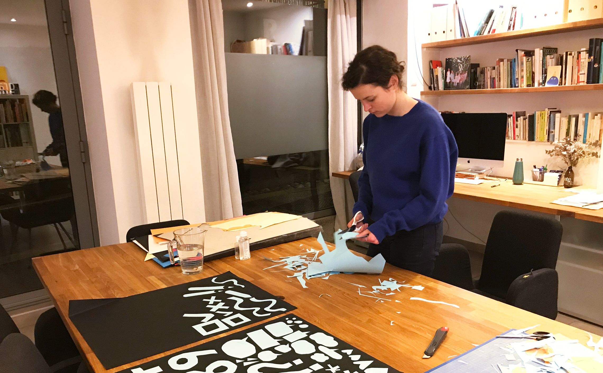 Afin d'enrichir l'univers illustratif, nous nous sommes lancés dans un atelier de papiers découpés. Une façon de quitter l'écran pour revenir à une forme de graphisme artisanal et sensible. Nous en avons profité pour accueillir un jeune stagiaire de 3e et créer un œuvre de street-art éphémère sur les murs du quartier.