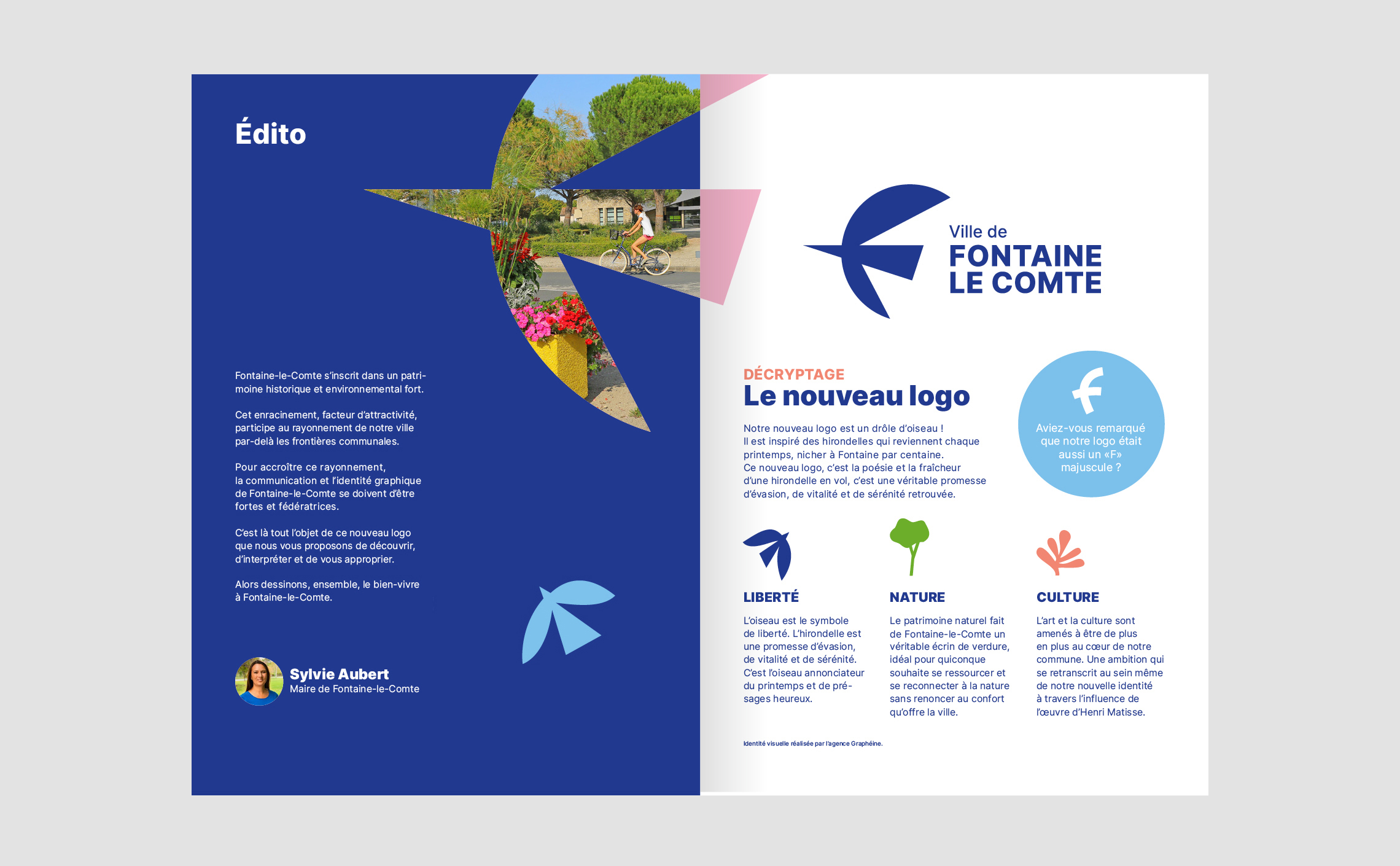 Ce nouveau logo est un drôle d’oiseau ! Il est inspiré des hirondelles qui reviennent chaque printemps, nicher à Fontaine-le-Comte par centaines. Ce nouveau logo, c’est la poésie et la fraîcheur d’une hirondelle en vol, c’est une véritable promesse d’évasion, de vitalité et de sérénité retrouvées.