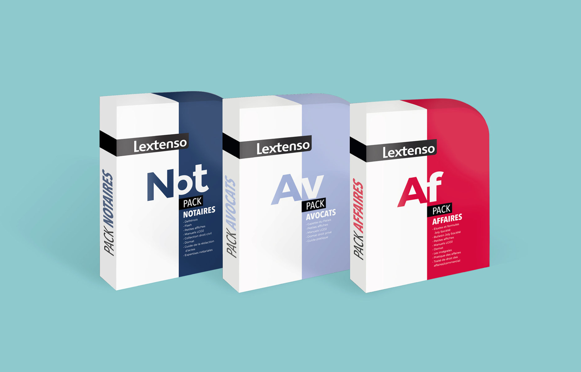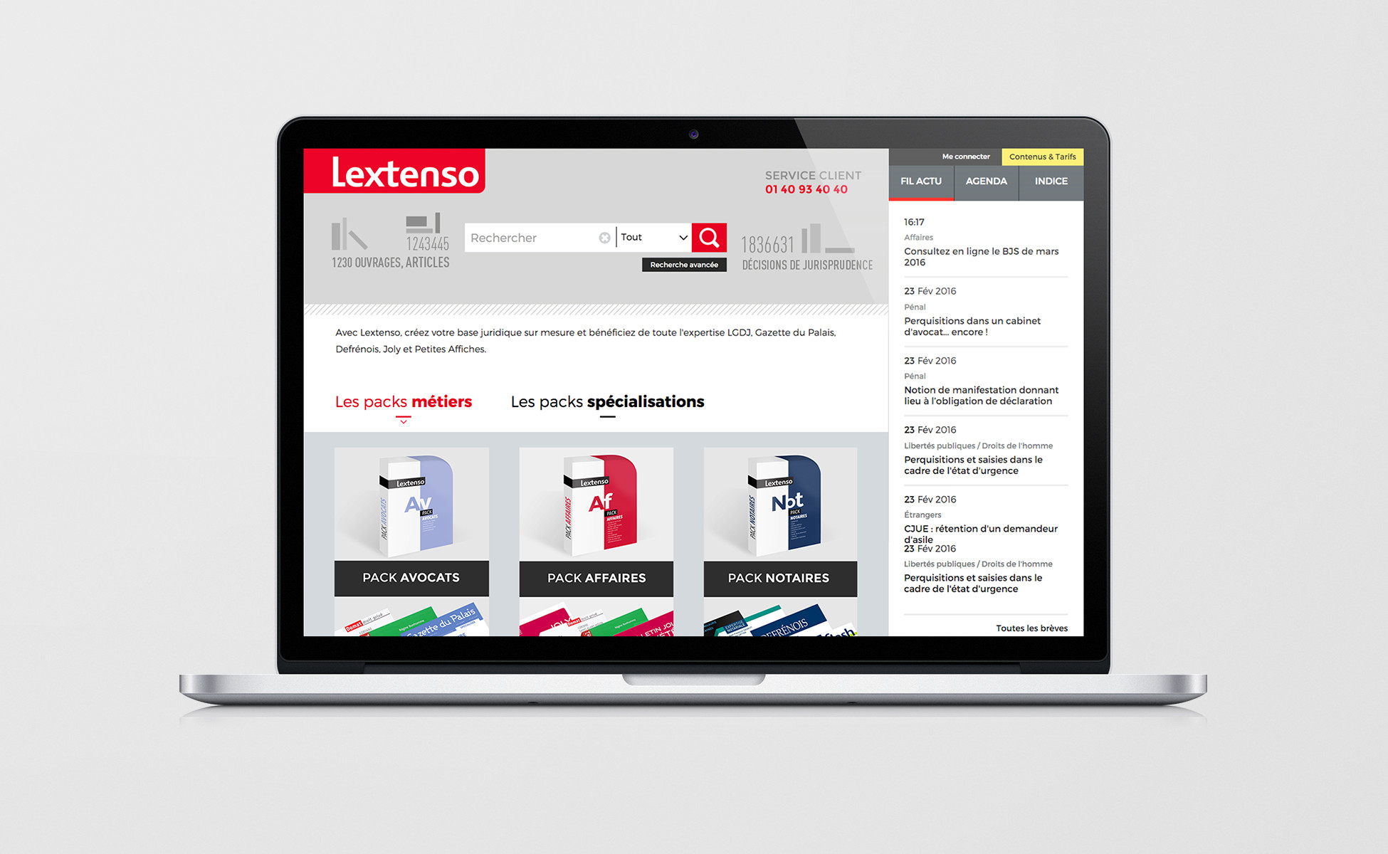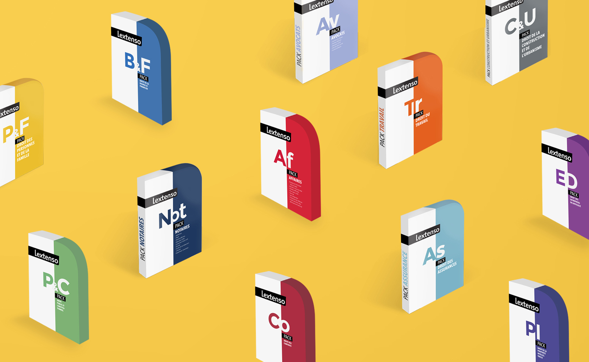 Avec sa charte graphique, c'est l'offre numérique de Lextenso.fr qui a été revue de fond en comble. Elle est désormais plus simple et plus accessible, tout en conservant une base d'informations juridiques qui est l'une des plus complètes en ligne. Elle intègre plus de contenu, mais celui-ci est désormais organisé par pack. Leur design a été pensé par graphéine pour créer à la fois une nomenclature efficace de l'offre "métiers" et "spécialisations", ainsi que pour offrir une matérialisation visuelle de l'offre en ligne. Le design des packs s'inspire de la forme du nouveau logotype Lextenso, et permet d'introduire une gamme de couleurs attractives dans un site qui pouvait initialement paraître trop terne. L'interface du site a été réorganisée et redessinée pour permettre aux clients de rechercher parmi l’ensemble du contenu des différentes éditions Lextenso.