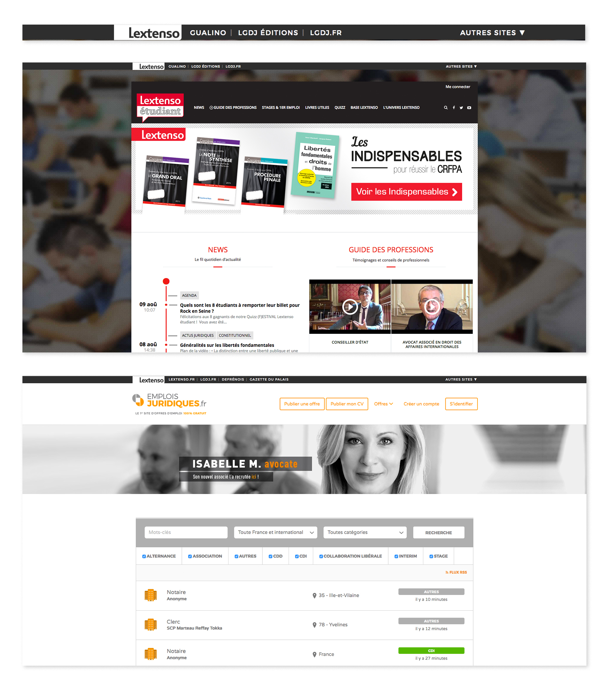 Les différents sites appartenant à la marque Lextenso possède désormais une barre de navigation qui intègre le nouveau logotype dans sa version en réserve blanche. Celle-ci permet de réaliser une navigation transversale tout en affirmant la nature de marque ombrelle de Lextenso. L'utilisateur peut ainsi consulter la totalité de l'offre numérique, dont le tout nouveau site emplois-juridiques.fr, dont l'identité a aussi été réalisé par graphéine.