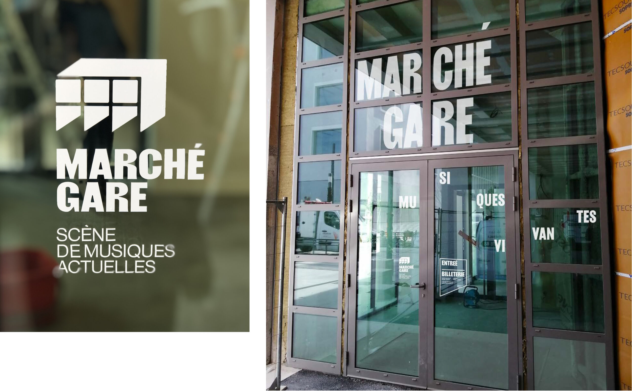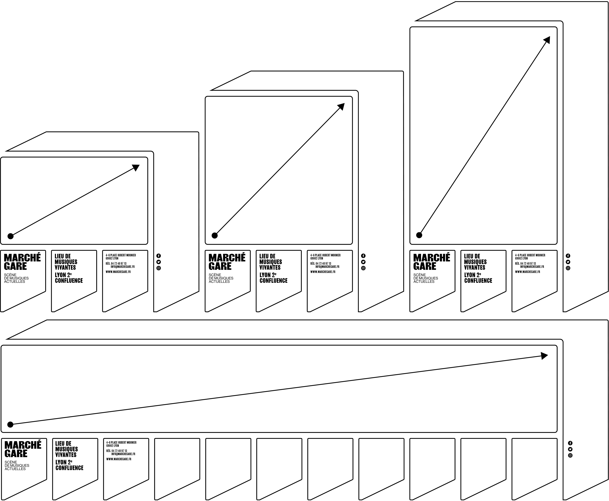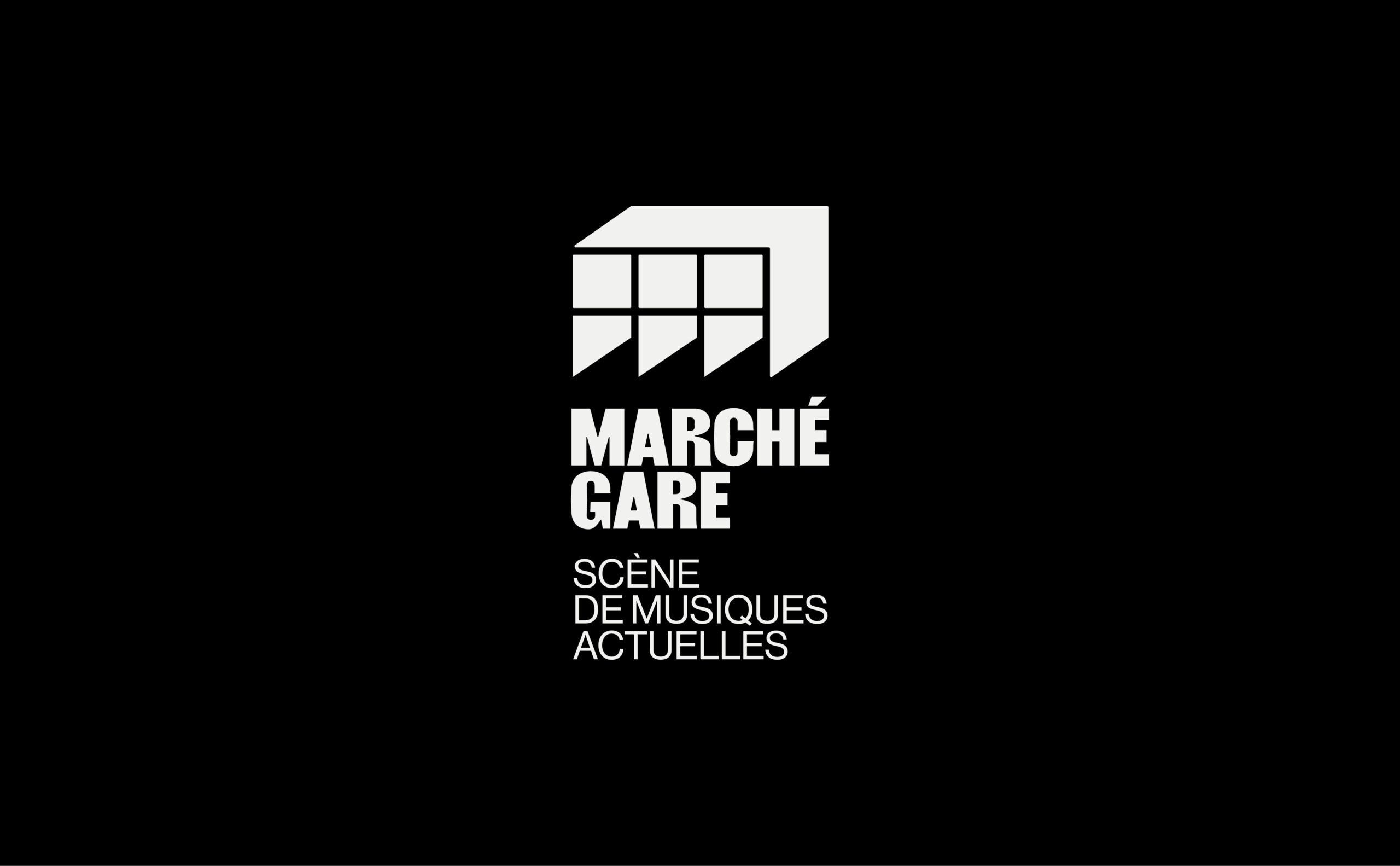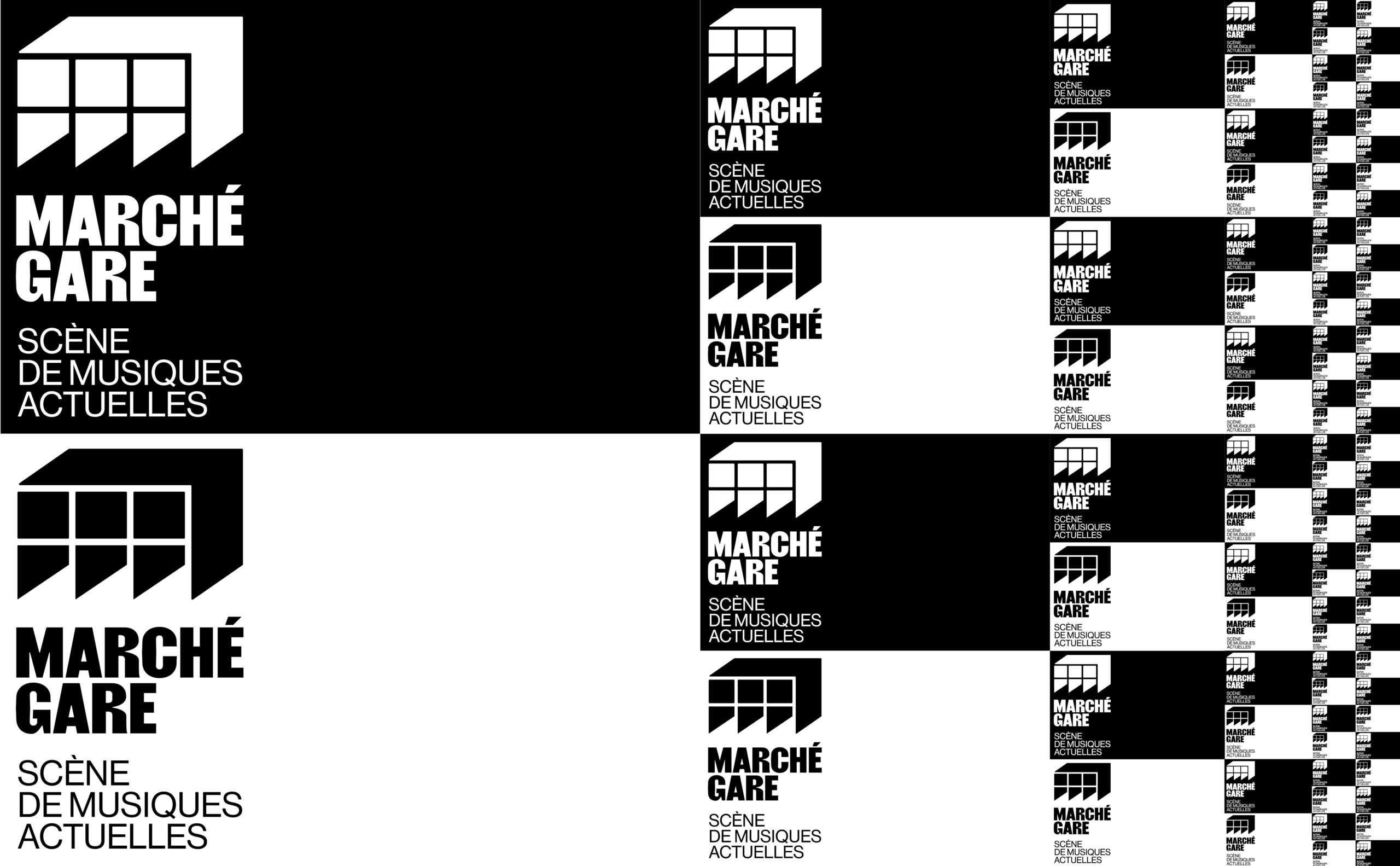 Sur les affiches et les communications du Marché Gare, le logotype-bâtiment s'étend pour devenir grille de composition et occuper l'espace du support. La programmation, texte ou image, prend place à l'intérieur de ce cadre. Ainsi l'artiste occupe la scène directement sur l'affiche.