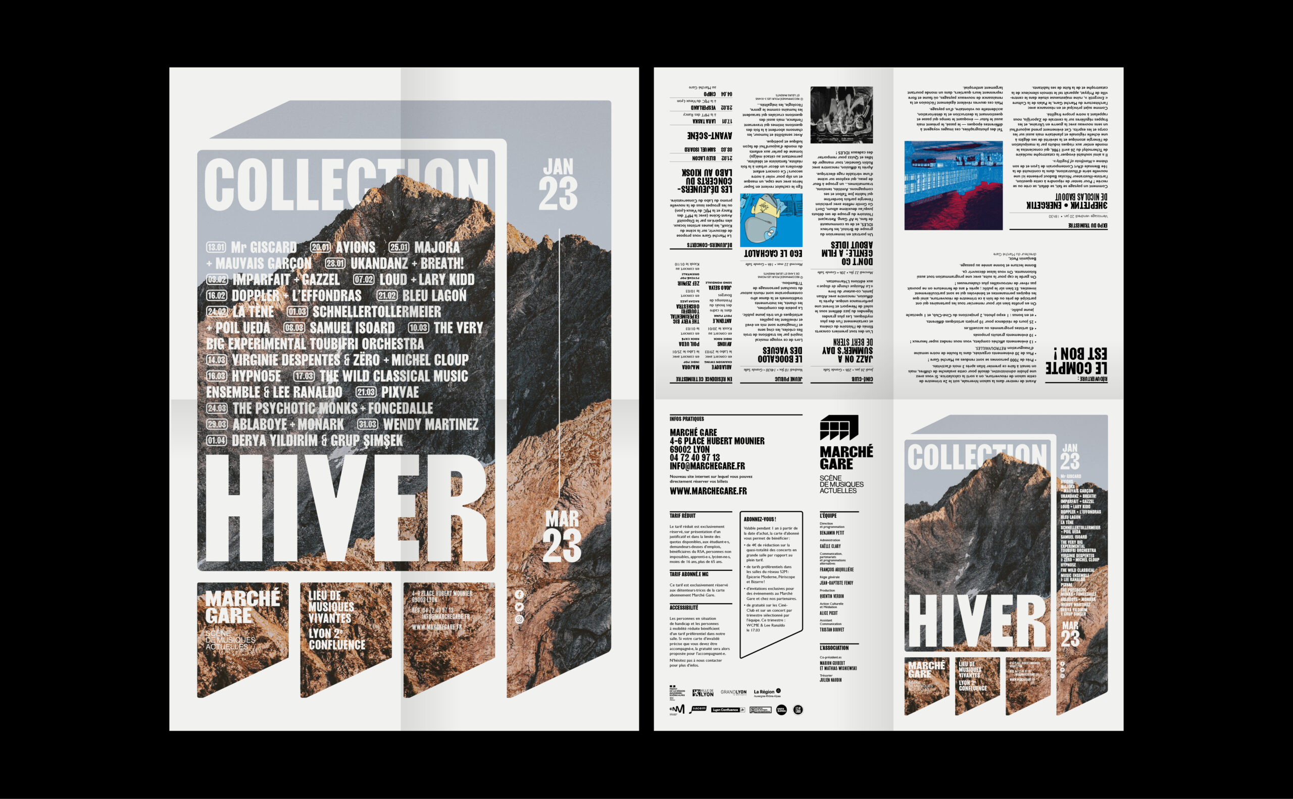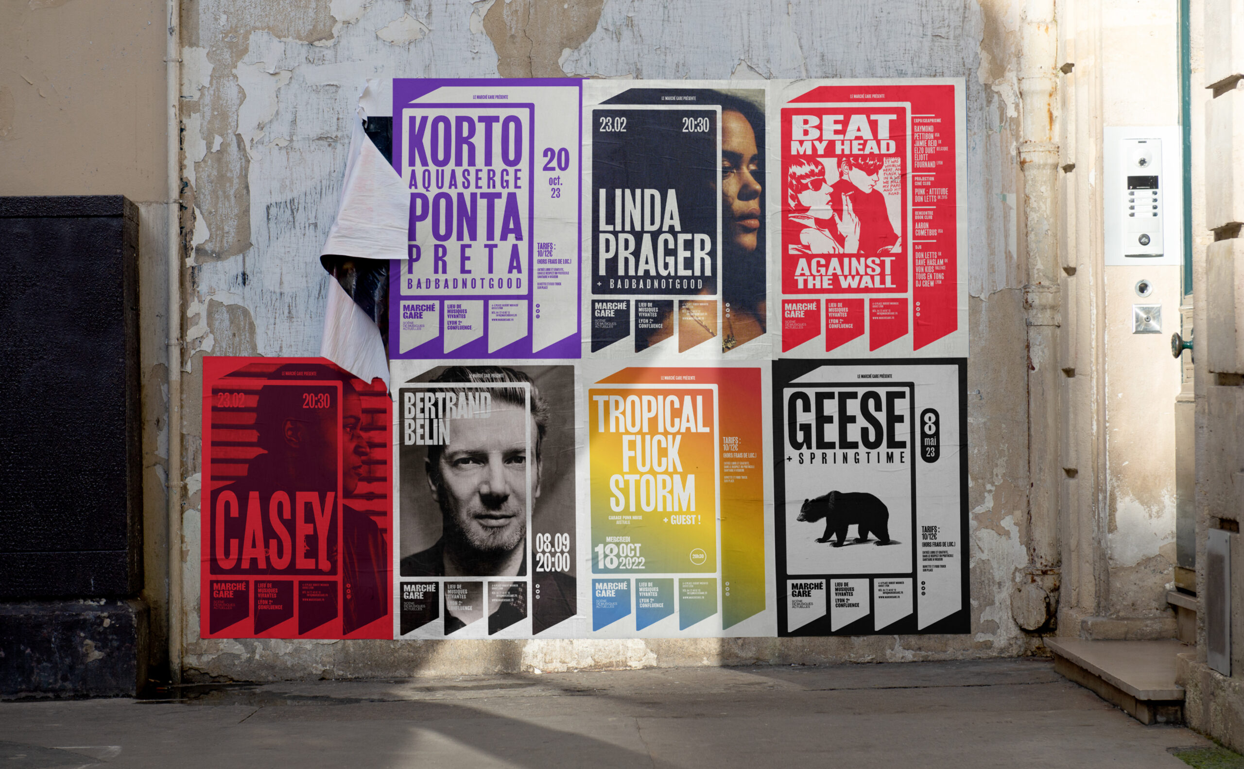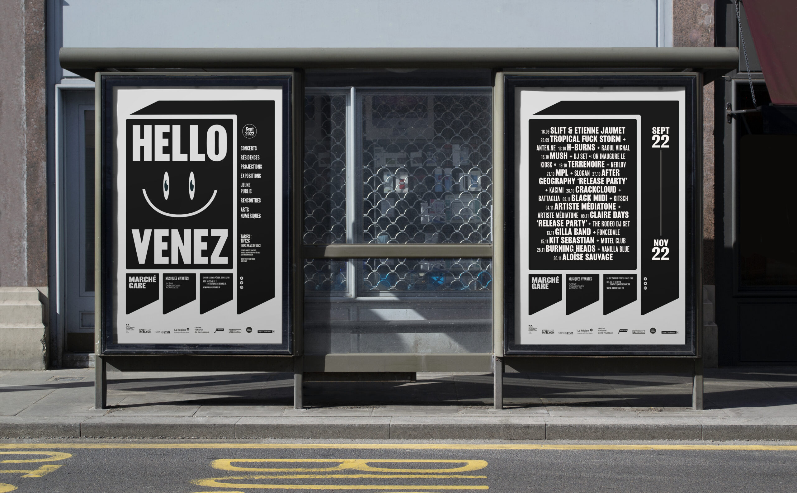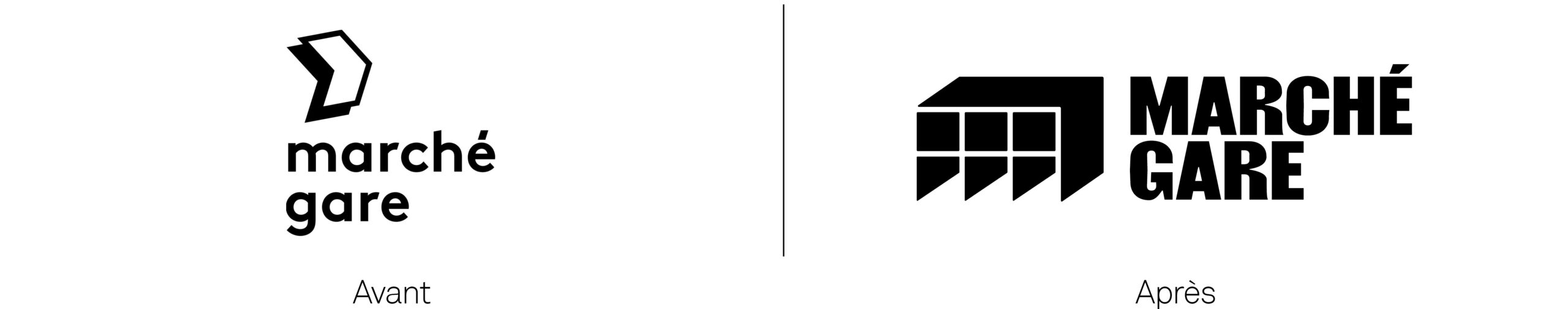 Sur les affiches et les communications du Marché Gare, le logotype-bâtiment s'étend pour devenir grille de composition et occuper l'espace du support. La programmation, texte ou image, prend place à l'intérieur de ce cadre. Ainsi l'artiste occupe la scène directement sur l'affiche.