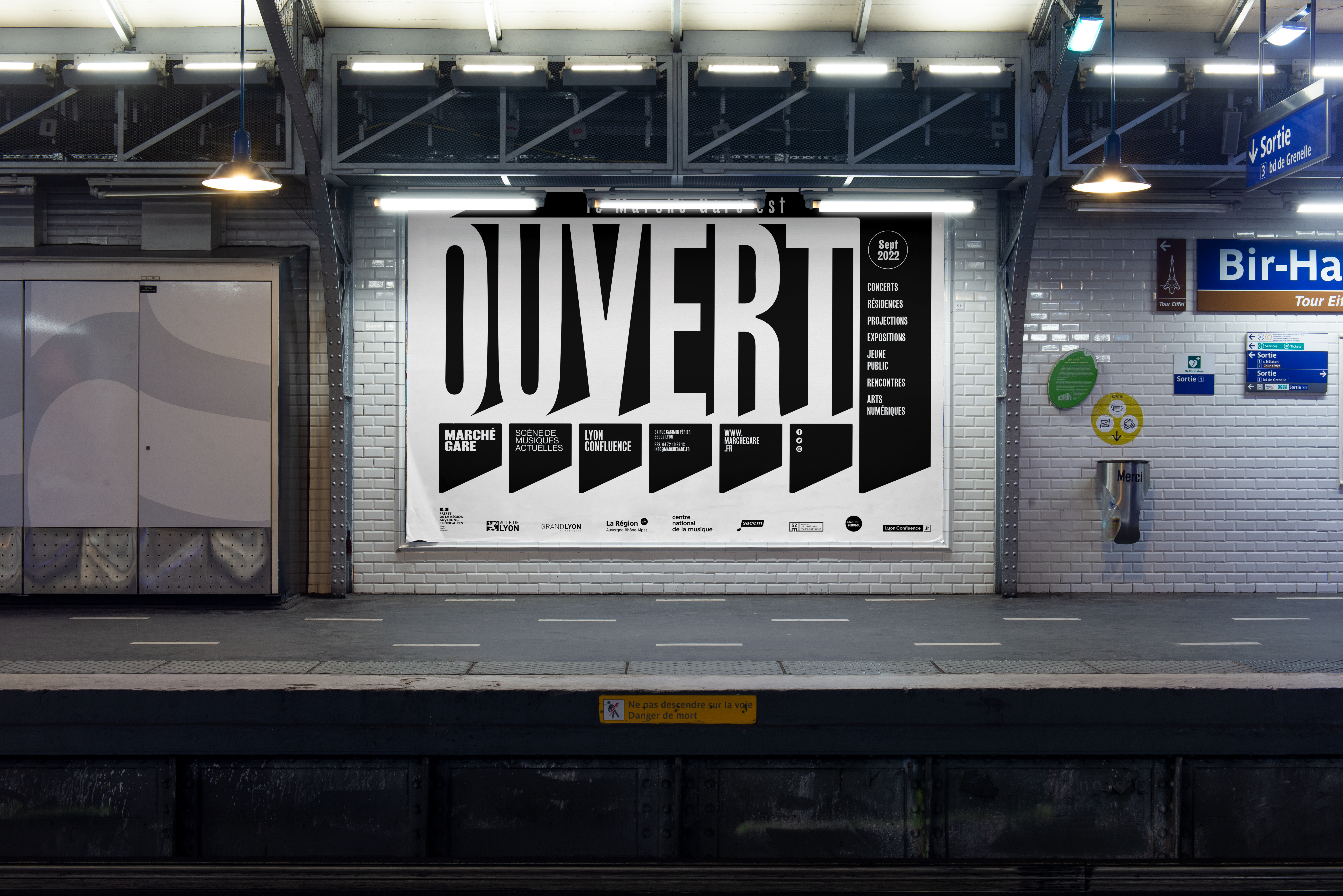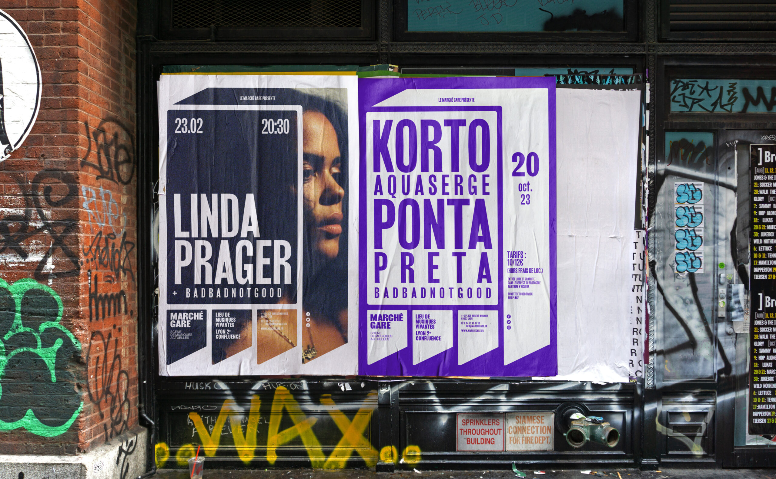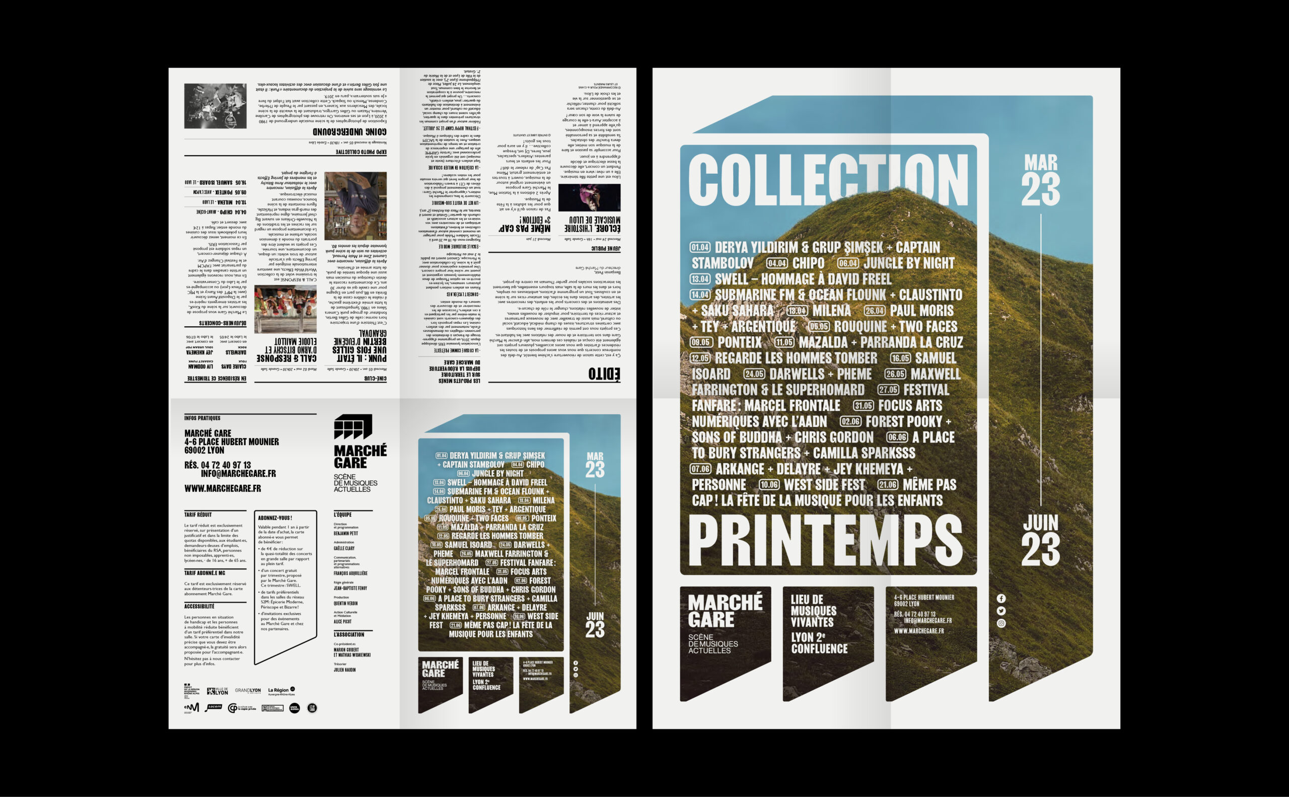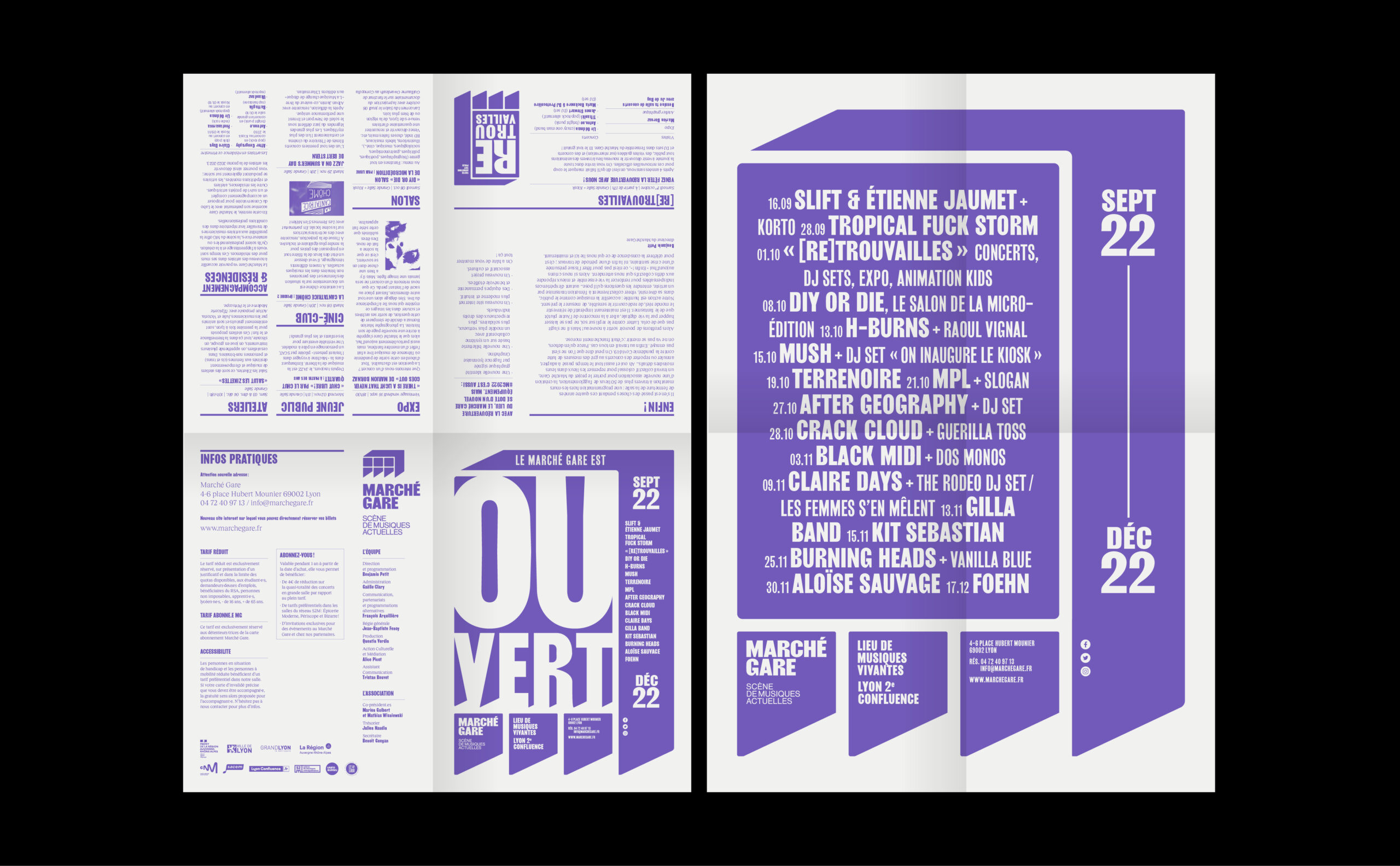 Sur les affiches et les communications du Marché Gare, le logotype-bâtiment s'étend pour devenir grille de composition et occuper l'espace du support. La programmation, texte ou image, prend place à l'intérieur de ce cadre. Ainsi l'artiste occupe la scène directement sur l'affiche.