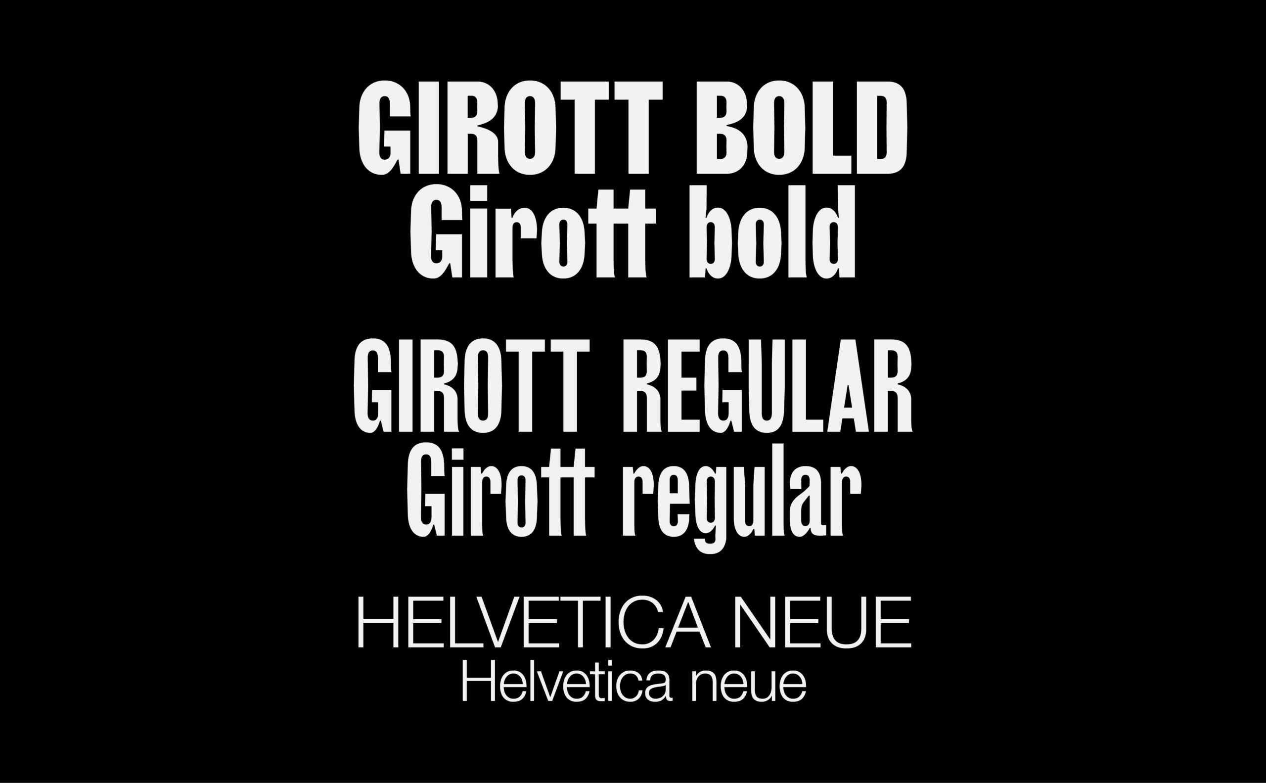 La palette typographique est composée en Girott (Radim Pesko, 2016) et en Helvetica (Max Medinger, 1957). Le brutalisme de la première police de caractères, très identifiable par son dessin et ses proportions, contraste la neutralité de la seconde.