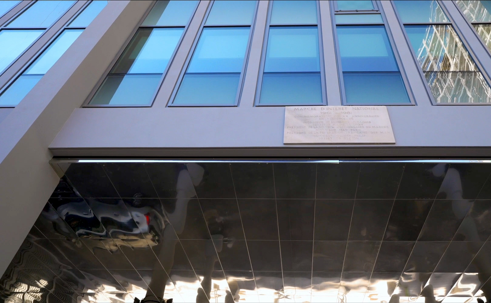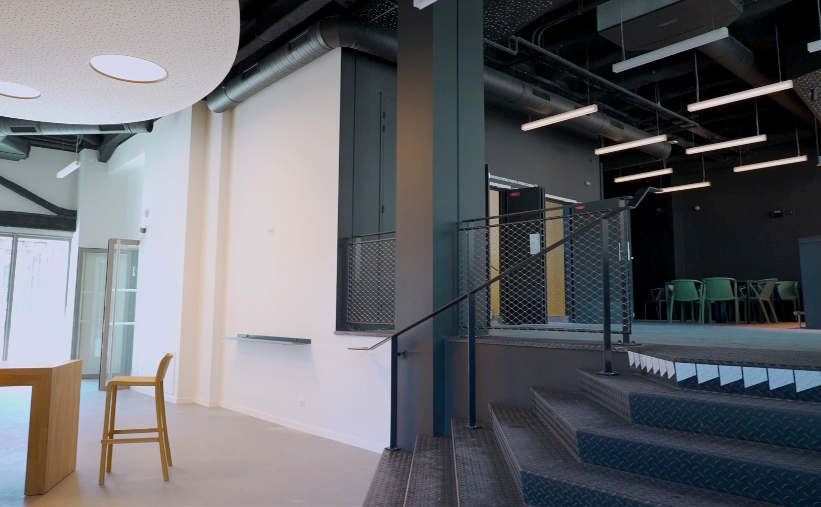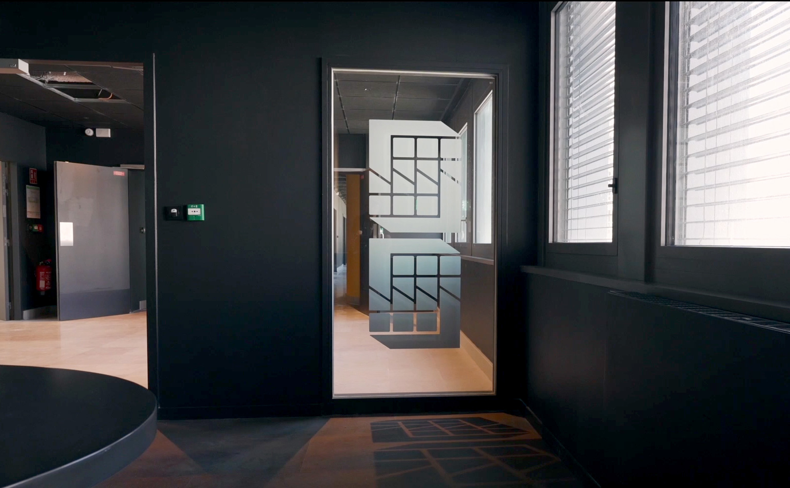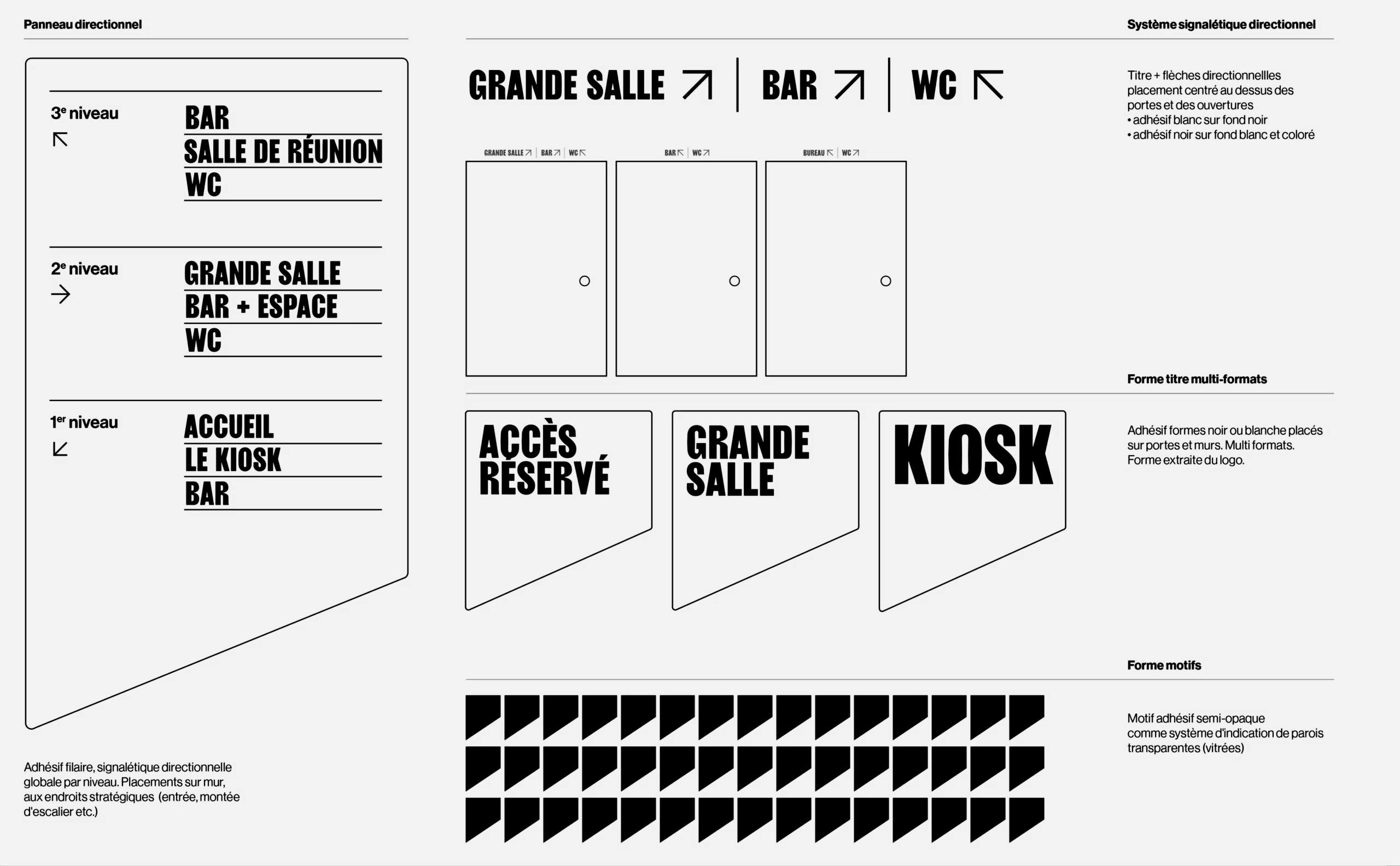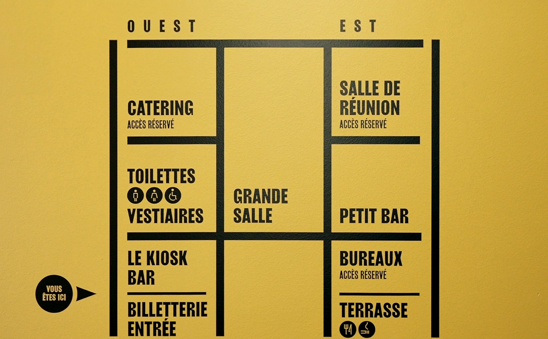Le projet comprend la conception du système signalétique du bâtiment. Celui-ci est envisagé en continuité du principe graphique d'identité visuelle. Les formes qui définissent le logotype sont extraites pour constituer un langage signalétique informatif et directionnel.
