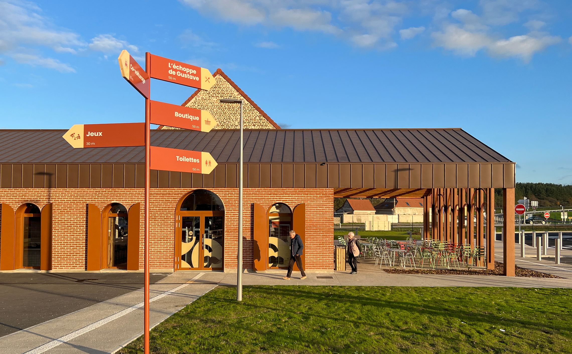 Missionnés par Aliaé (groupe APRR), nous avons participé à la création du nom aux côtés de Sylvain Perillat Architecte, de l'agence Citti (Architecture intérieure), du cabinet BrandValue (positionnement) et de l'agence Eres (Expertise Restauration), puis nous avons conçu l'identité visuelle et la signalétique directionnelle de l'aire de service.