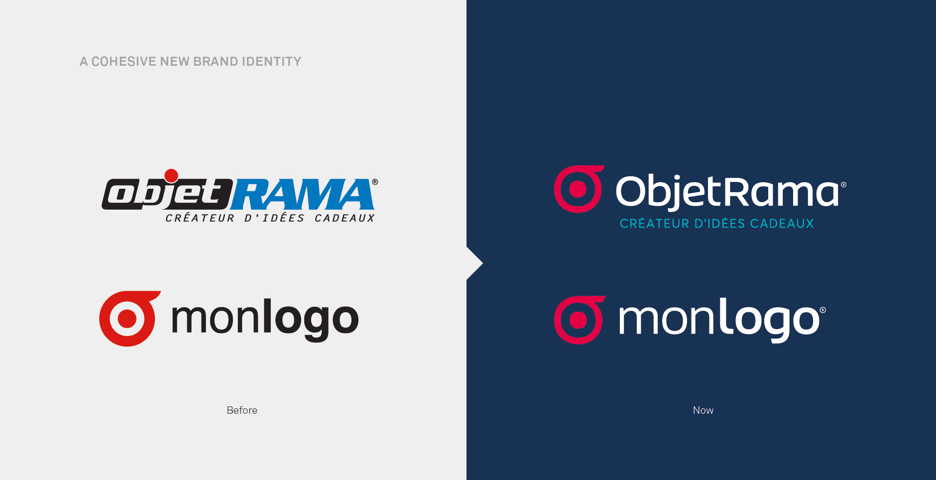 L’existant «monlogo» évolue. Son initiale «O» stylisée comme ObjetRama est conservée. Le bloc typographique a été simplifié et le code chromatique rafraichi. C’est le point de l’ancien «j» d’ObjetRama qui donne sa couleur magenta au nouveau logo. Cette teinte est à la fois synonyme de chaleur et d’émotions.