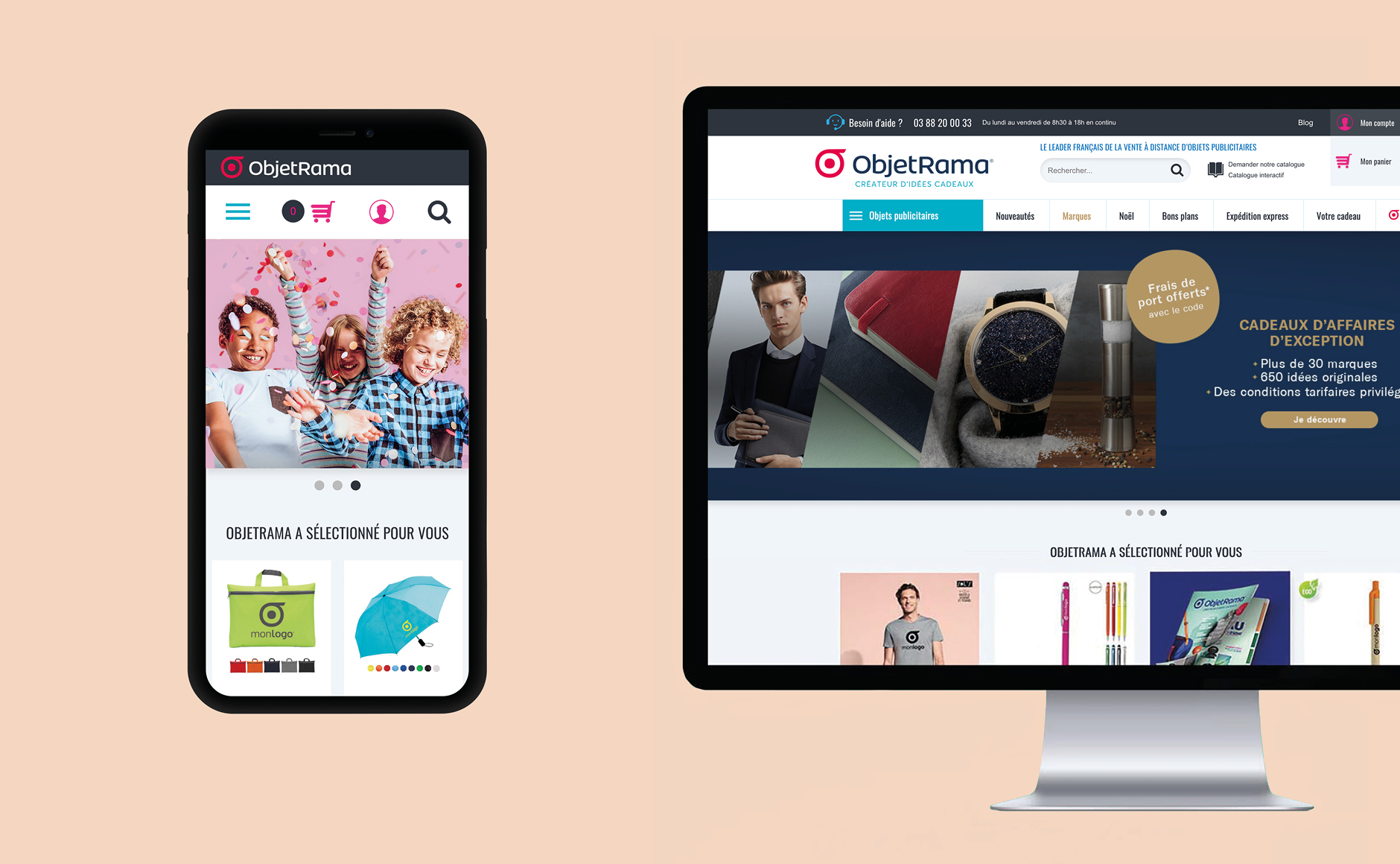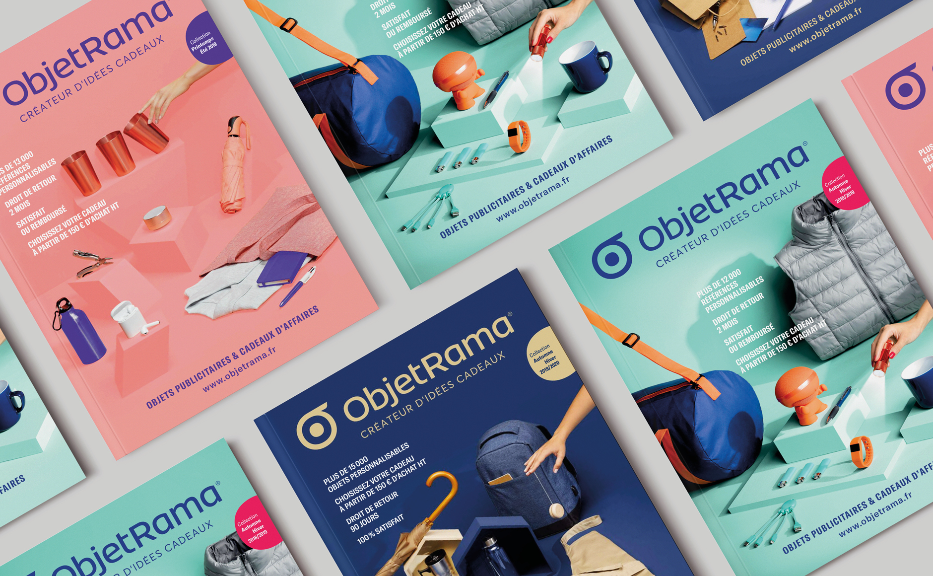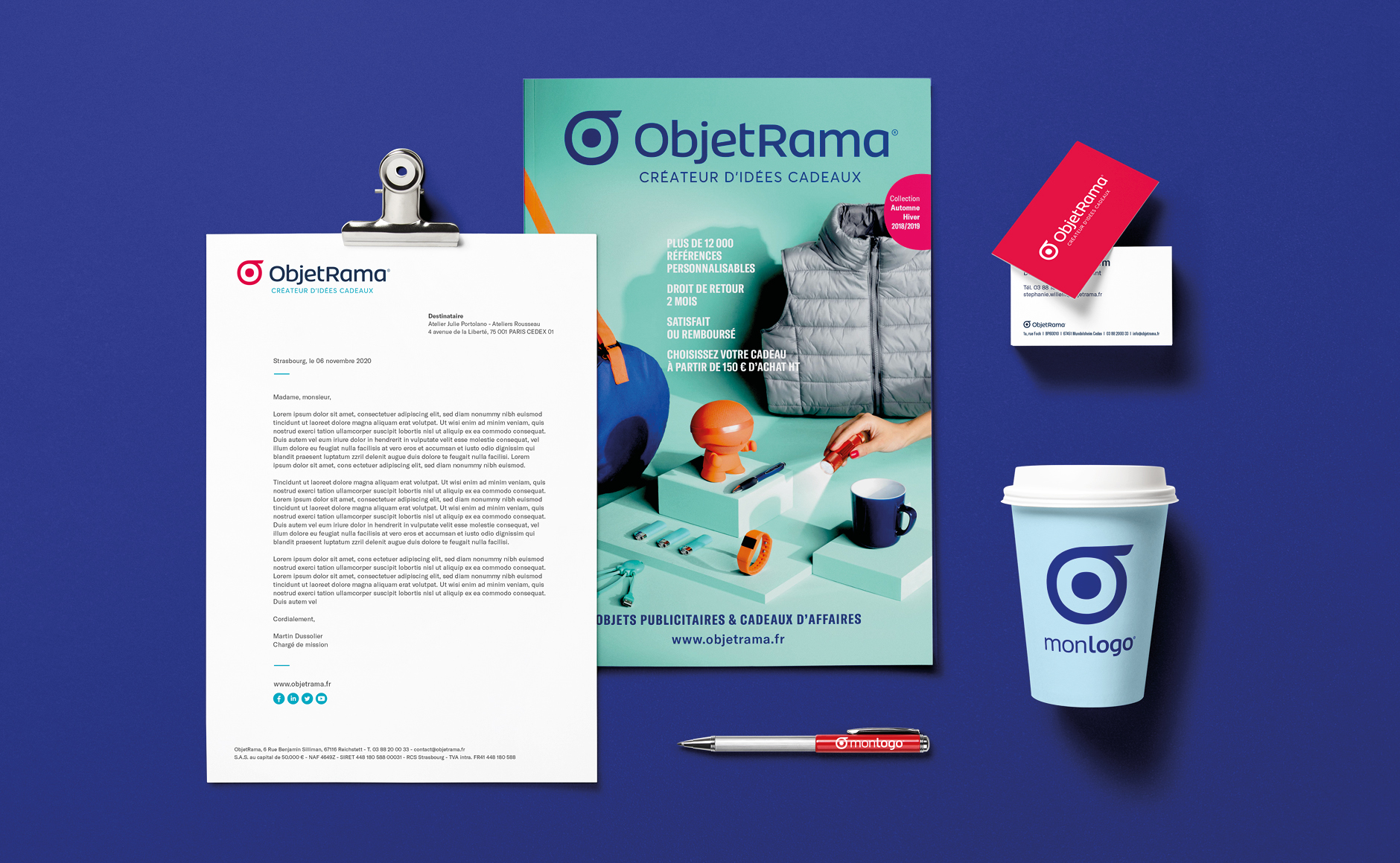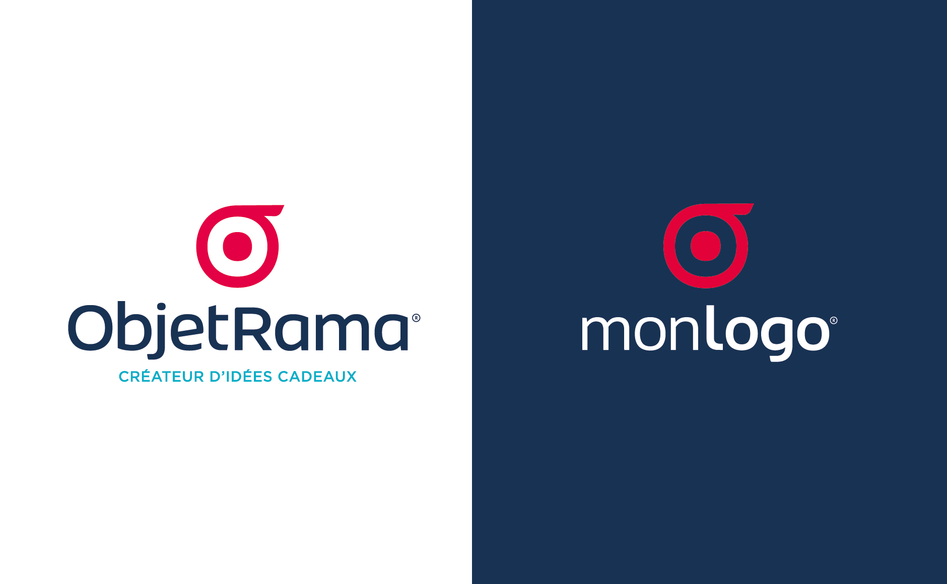 Ce logo communique la promesse d’ObjetRama : permettre au client de personnaliser leurs idée cadeaux. Précédemment, il y avait d’un côté le logo ObjetRama, et de l’autre un logo totalement différent que l’on retrouvait en mockup dans le catalogue. le nouveau symbole permet désormais de faire le lien entre le logo «mockup» monlogo et le logo ObjetRama.