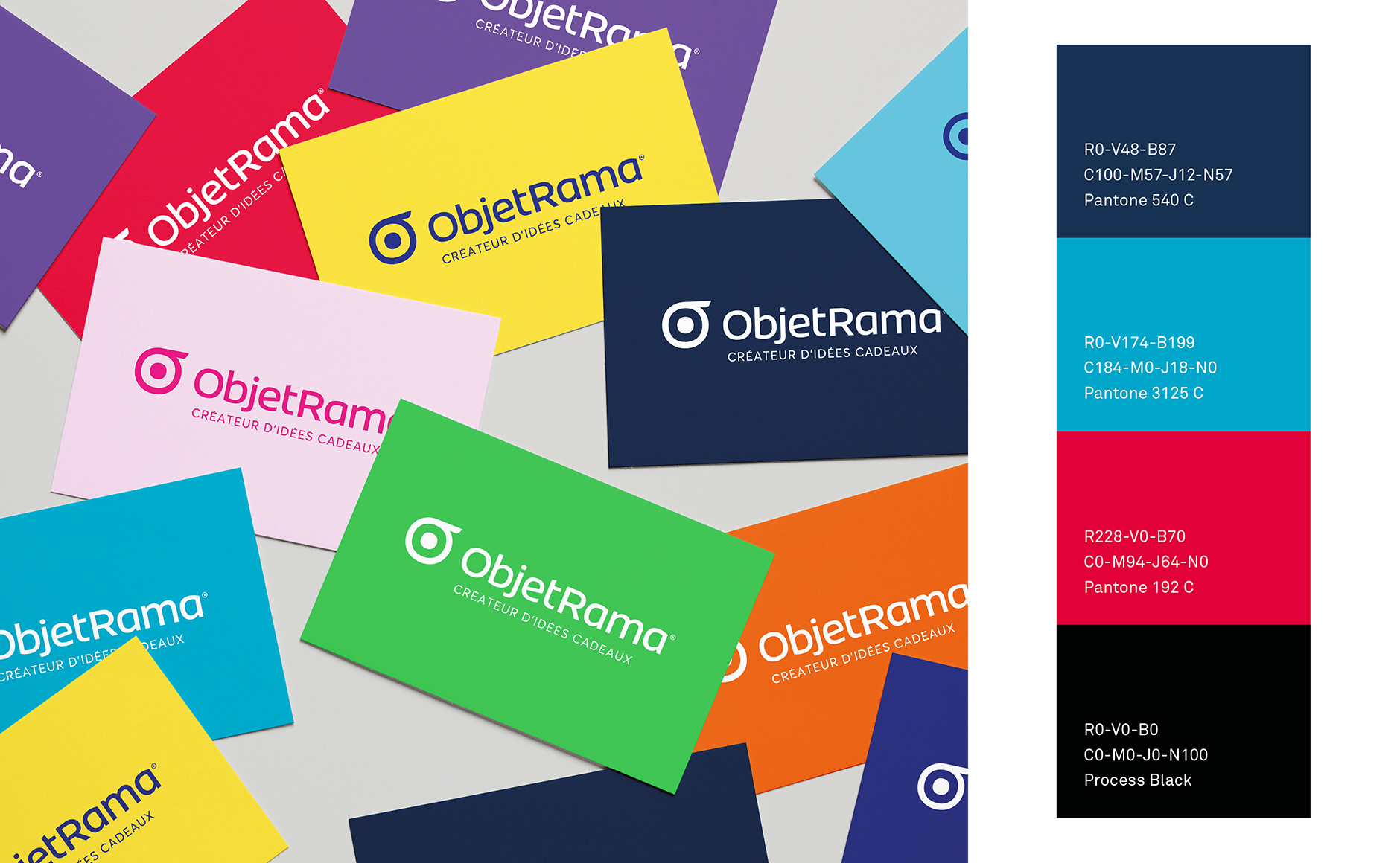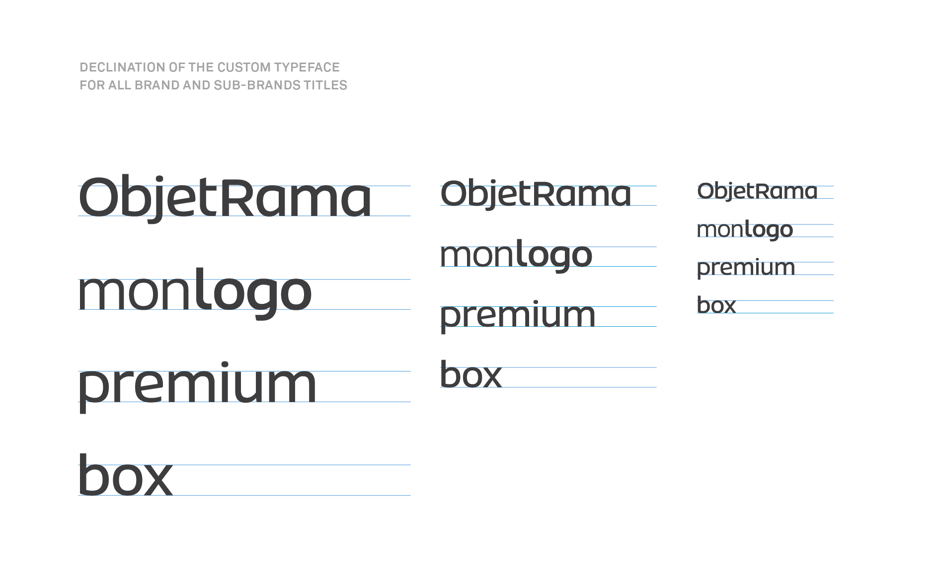 Le style de la typographie est résolument moderne. C’est une linéale dessinée pour réduire la longueur du nom ObjetRama tout en lui donnant un maximum de personnalité. Ce nouveau dessin, à la fois élégant et intemporel, permet de véhiculer une image innovante et ambitieuse d’ObjetRama.