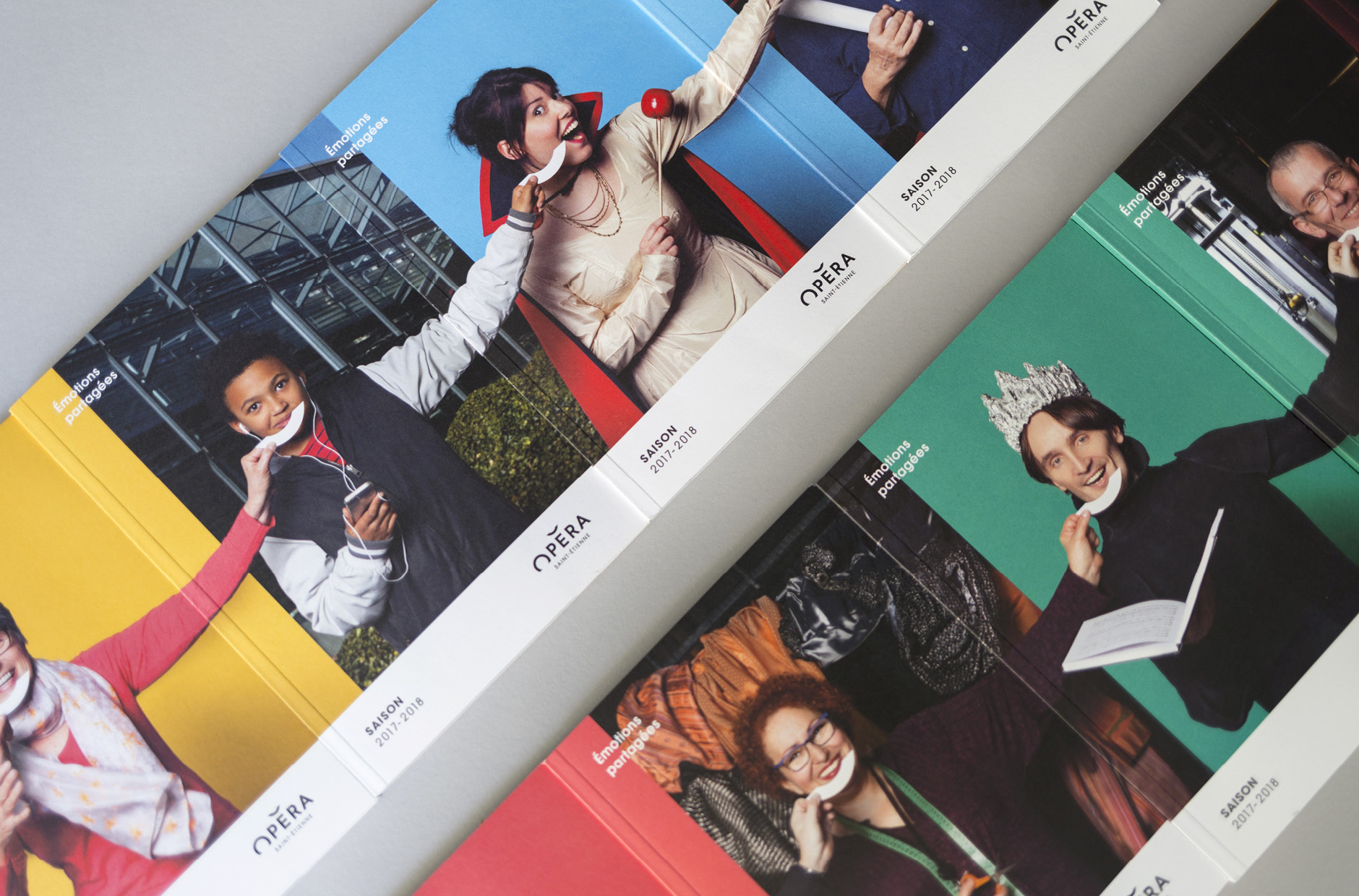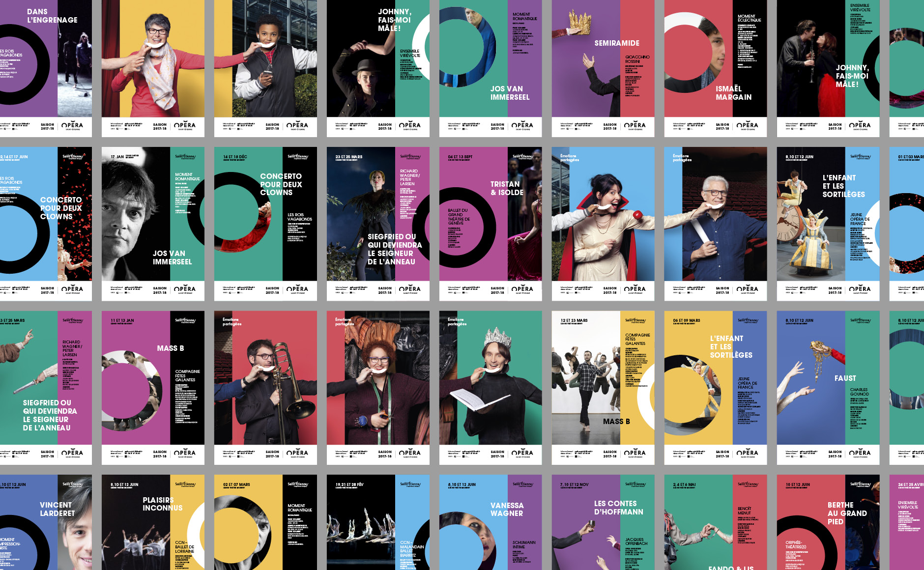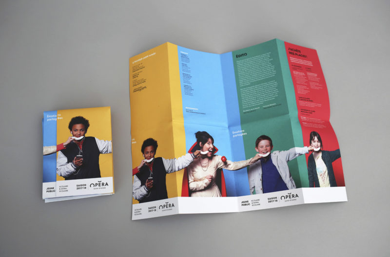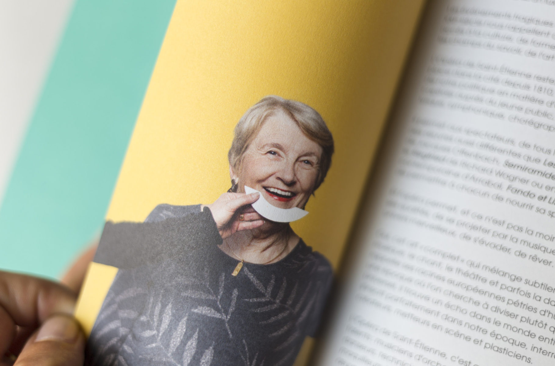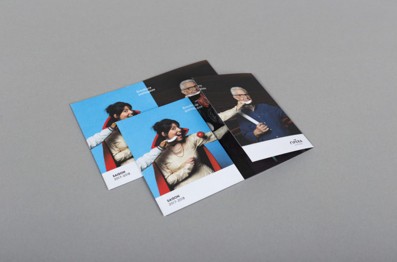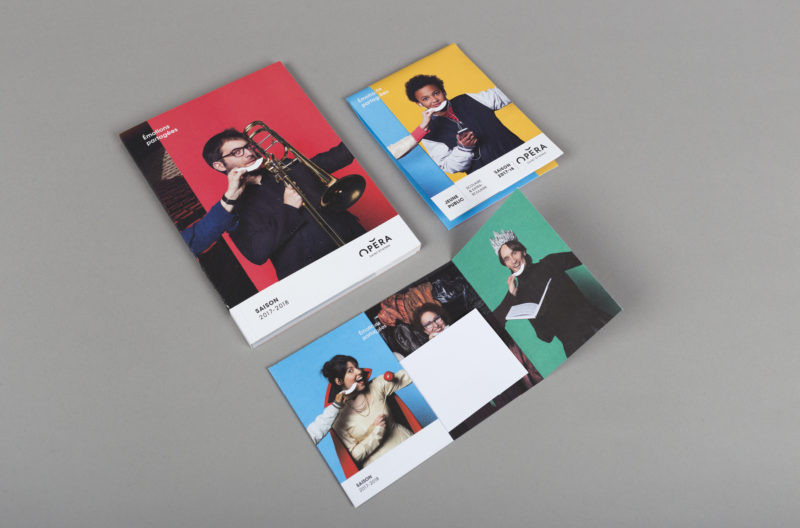 En 2015, nous concevions l'identité visuelle de l'opéra. Un logo typographique décrivant autant le bâtiment (avec son accent en forme de pagode) que la mission de cet opéra (accueillir et divertir tous les publics). Au fur et à mesure des saisons, le challenge était de poursuivre et renouveler cette histoire. Pour la première édition, nous mettions en avant les agents, puis l'orchestre l'année suivante. En 2017, nous avions décidé de mélanger les agents, les musiciens et les publics !