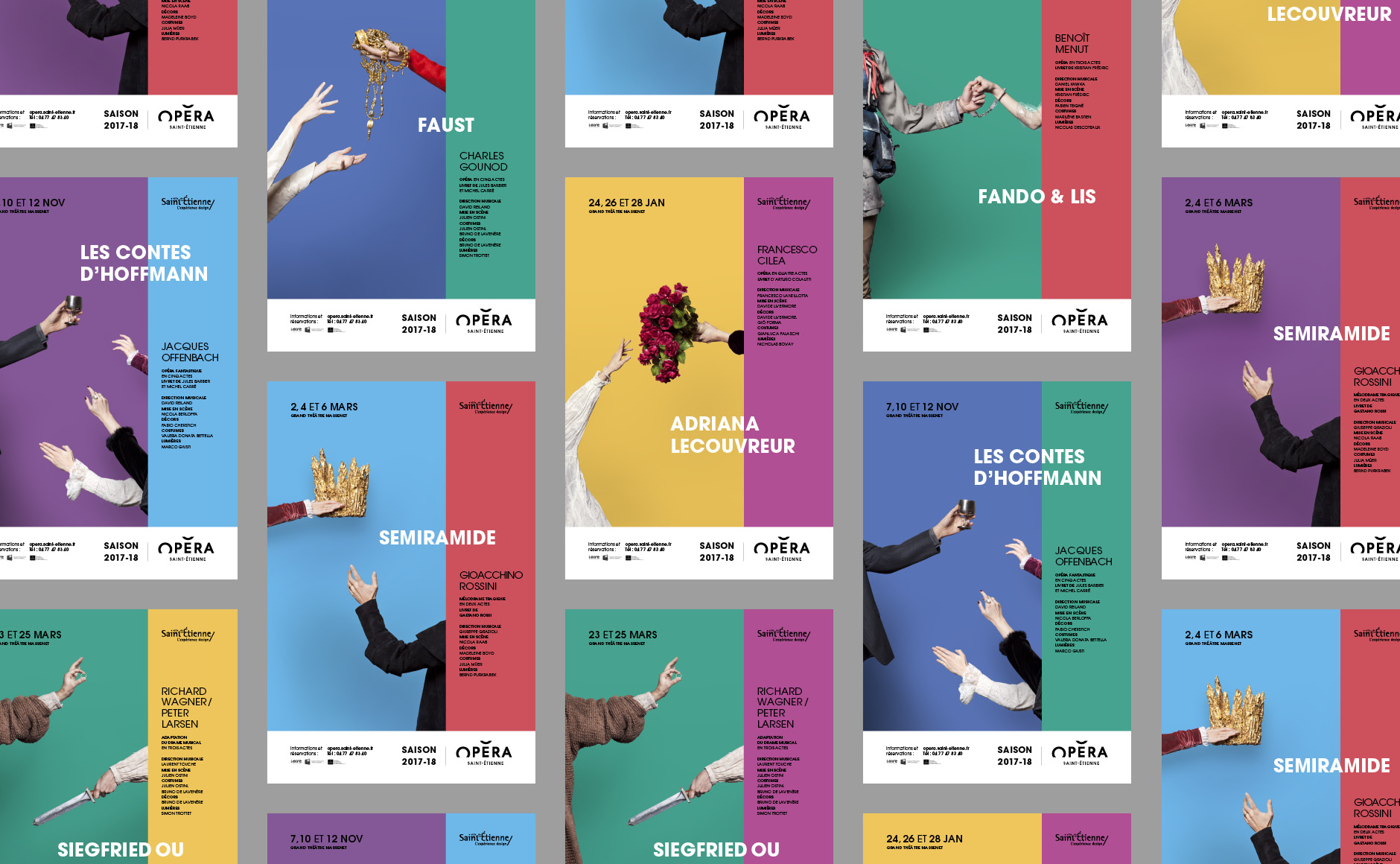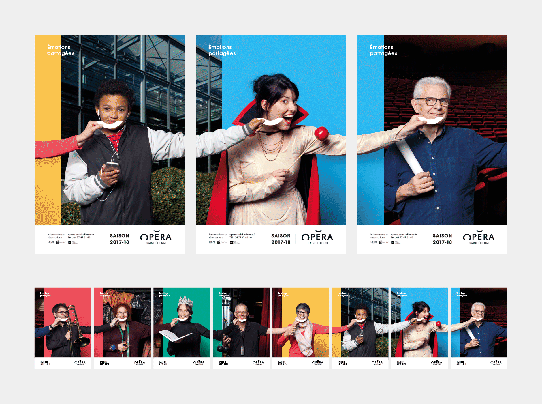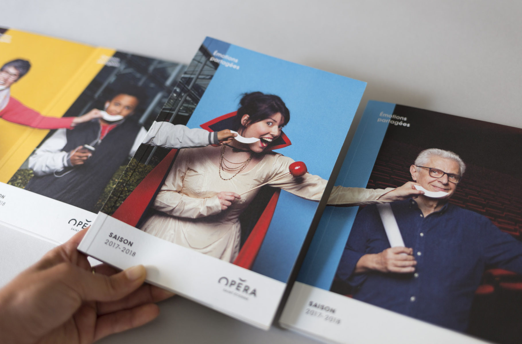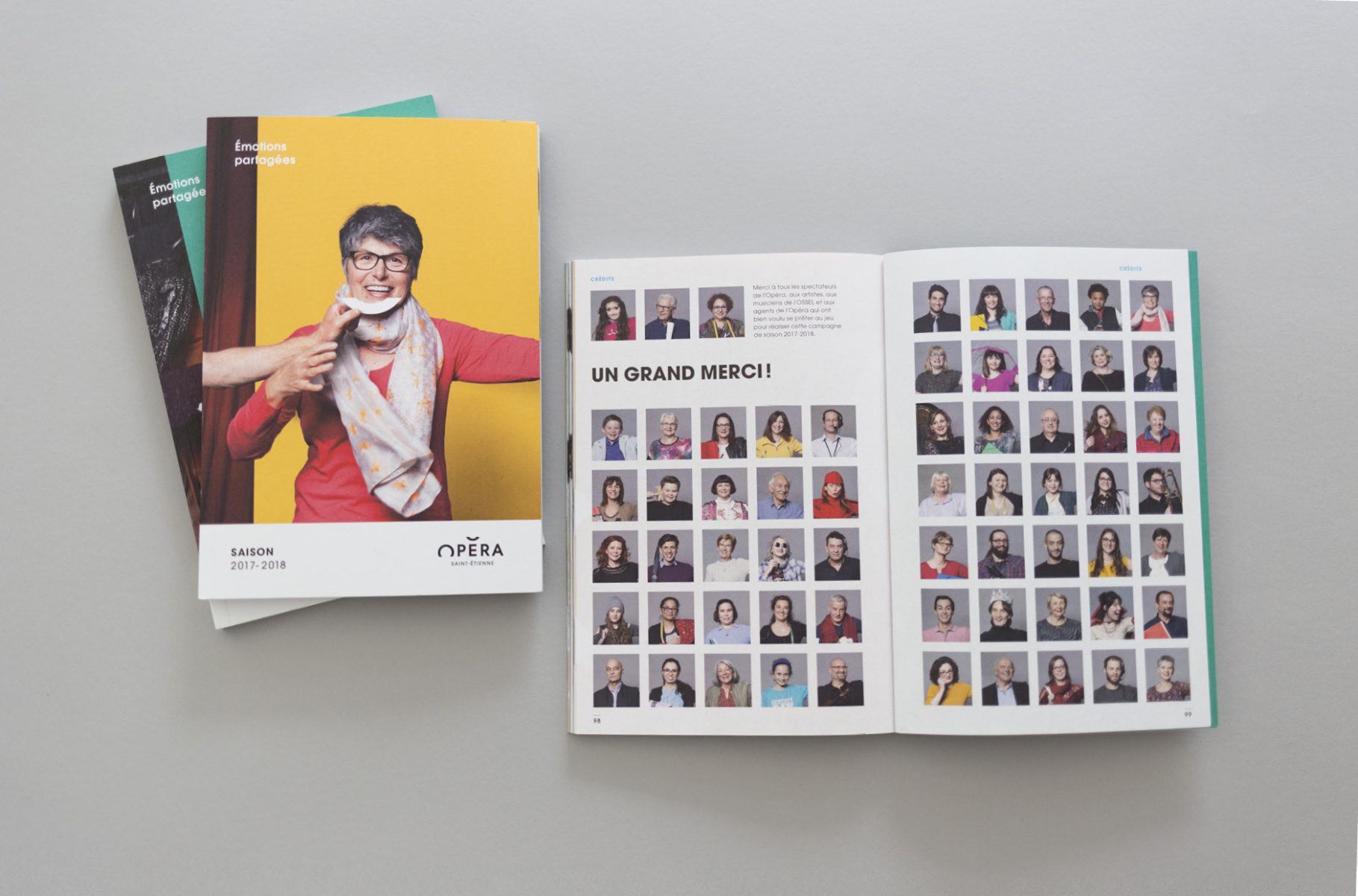 En 2015, nous concevions l'identité visuelle de l'opéra. Un logo typographique décrivant autant le bâtiment (avec son accent en forme de pagode) que la mission de cet opéra (accueillir et divertir tous les publics). Au fur et à mesure des saisons, le challenge était de poursuivre et renouveler cette histoire. Pour la première édition, nous mettions en avant les agents, puis l'orchestre l'année suivante. En 2017, nous avions décidé de mélanger les agents, les musiciens et les publics !