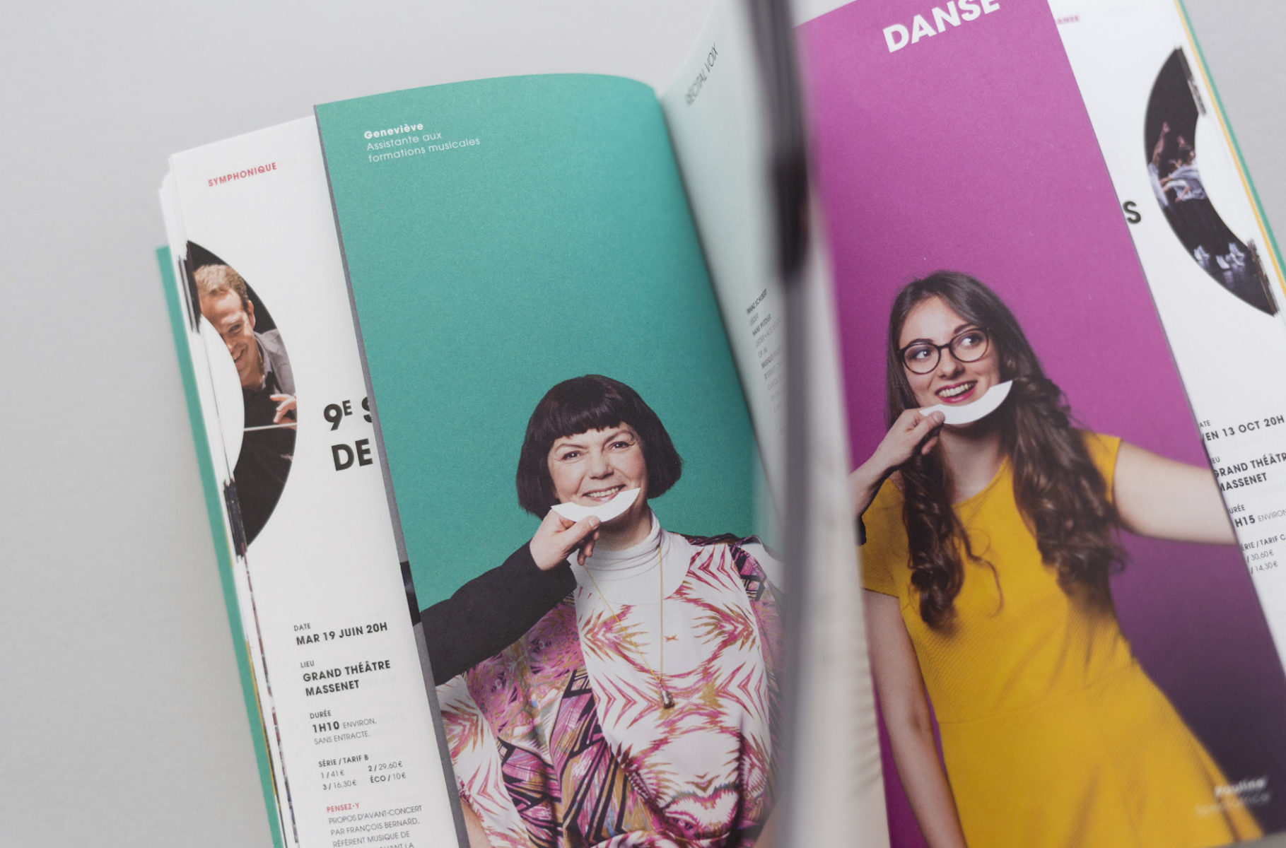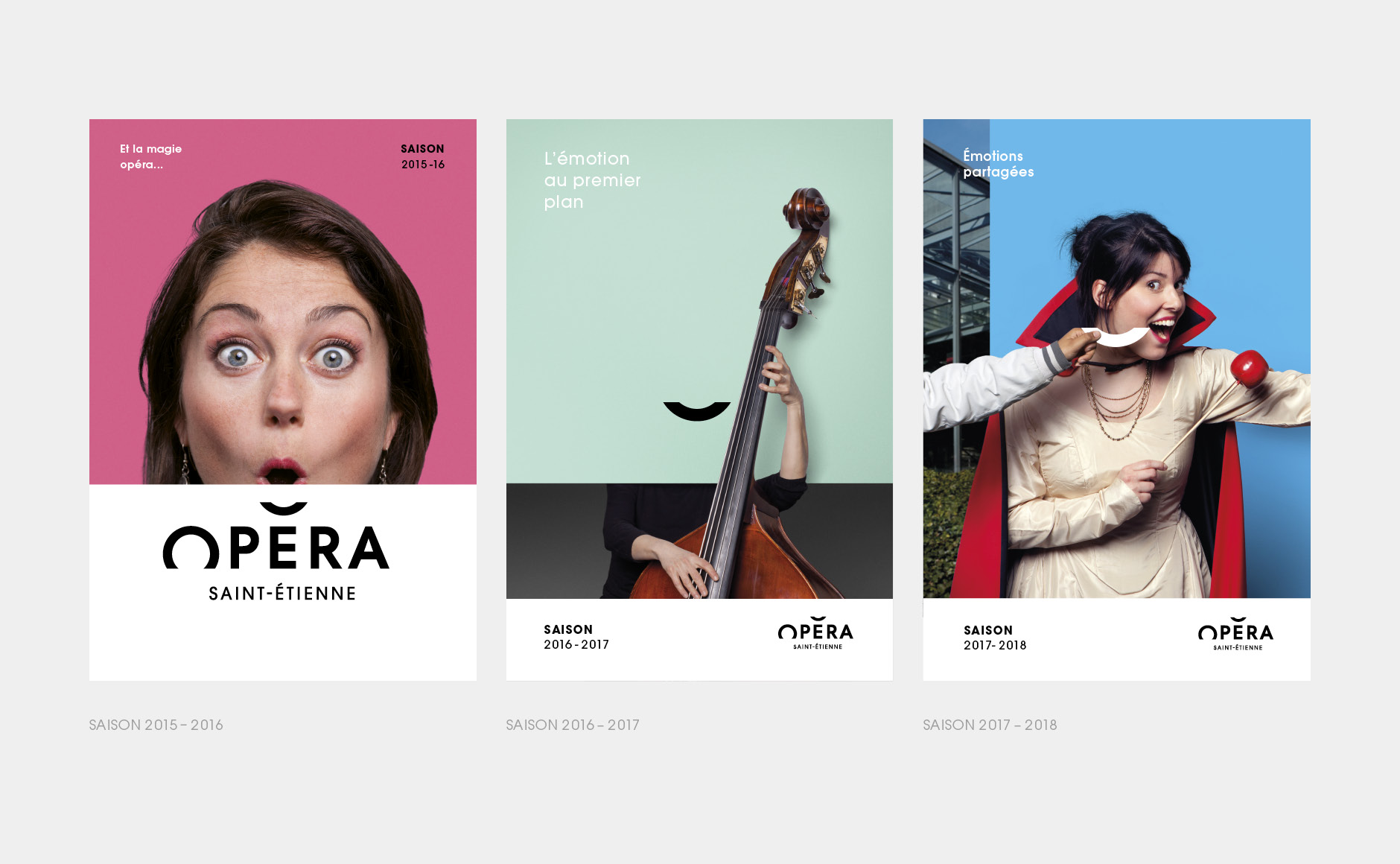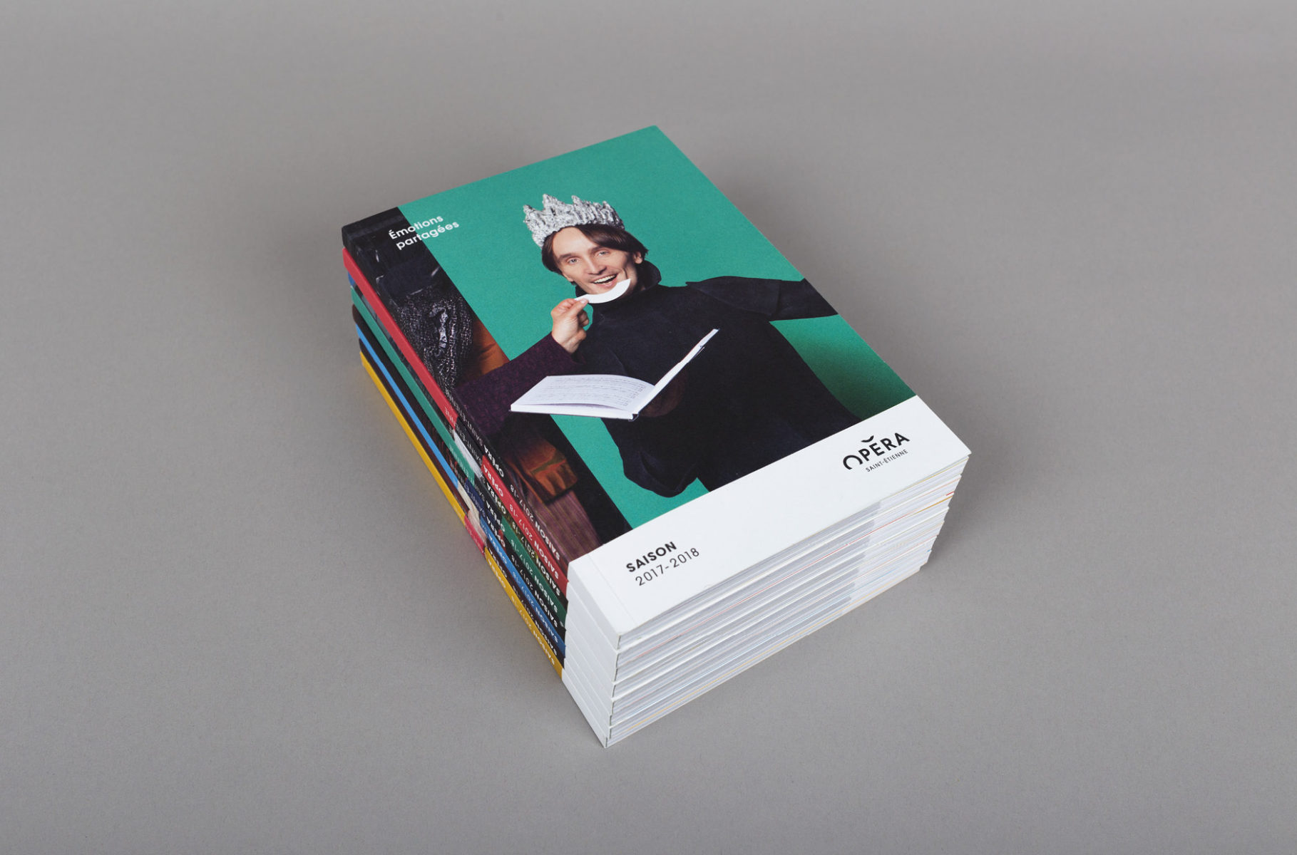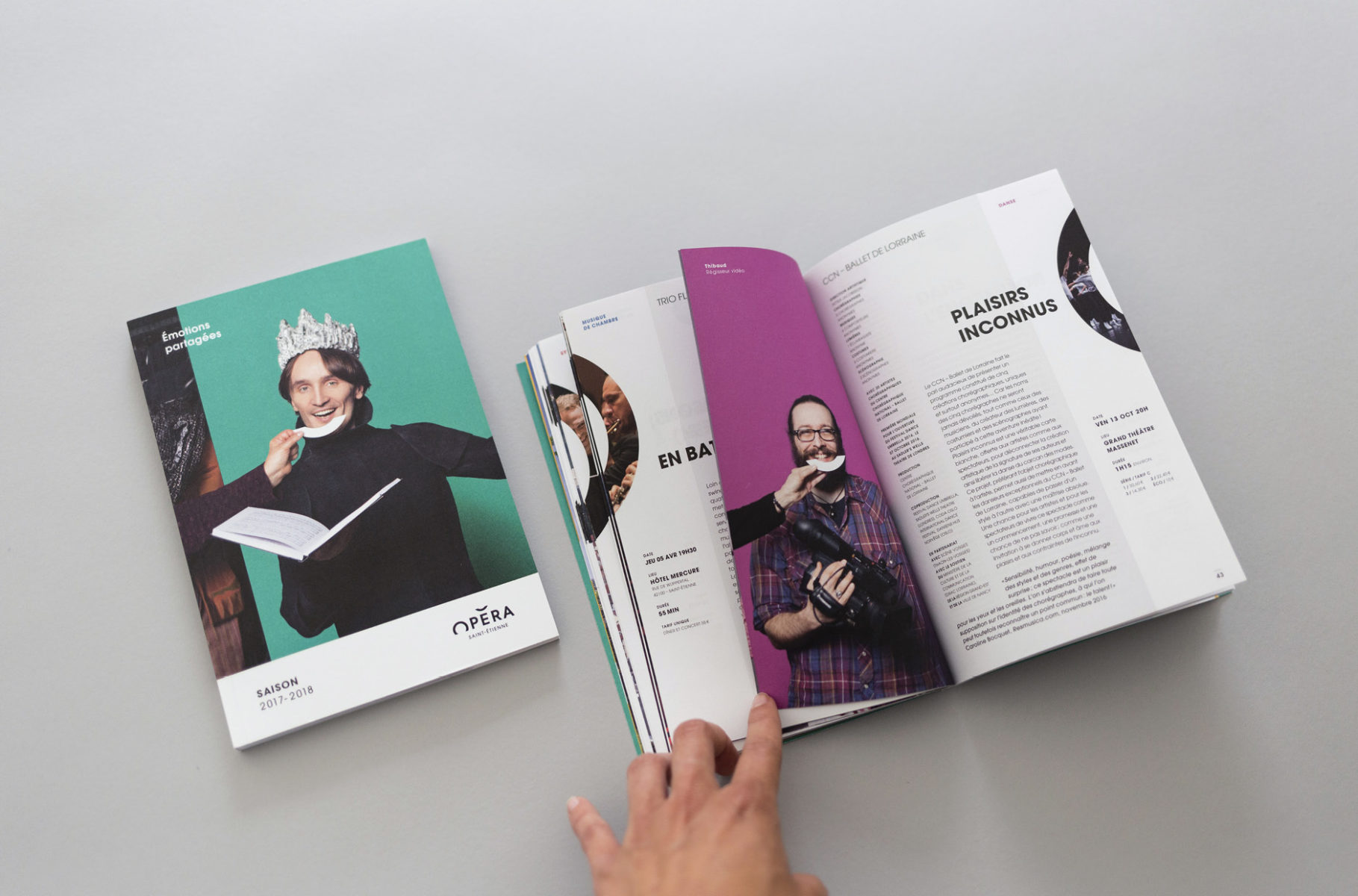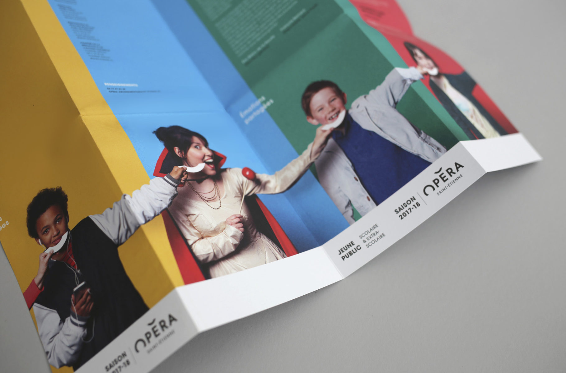 En 2015, nous concevions l'identité visuelle de l'opéra. Un logo typographique décrivant autant le bâtiment (avec son accent en forme de pagode) que la mission de cet opéra (accueillir et divertir tous les publics). Au fur et à mesure des saisons, le challenge était de poursuivre et renouveler cette histoire. Pour la première édition, nous mettions en avant les agents, puis l'orchestre l'année suivante. En 2017, nous avions décidé de mélanger les agents, les musiciens et les publics !