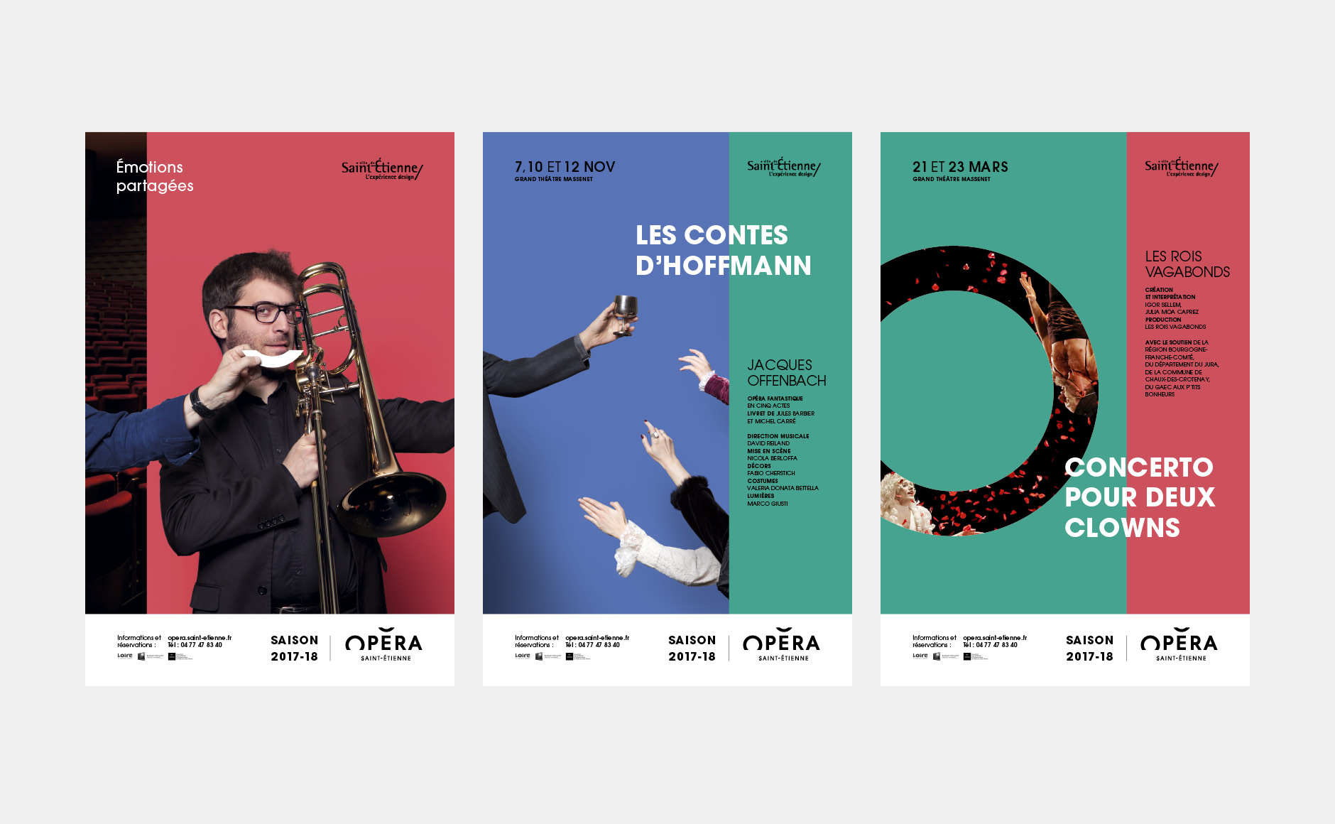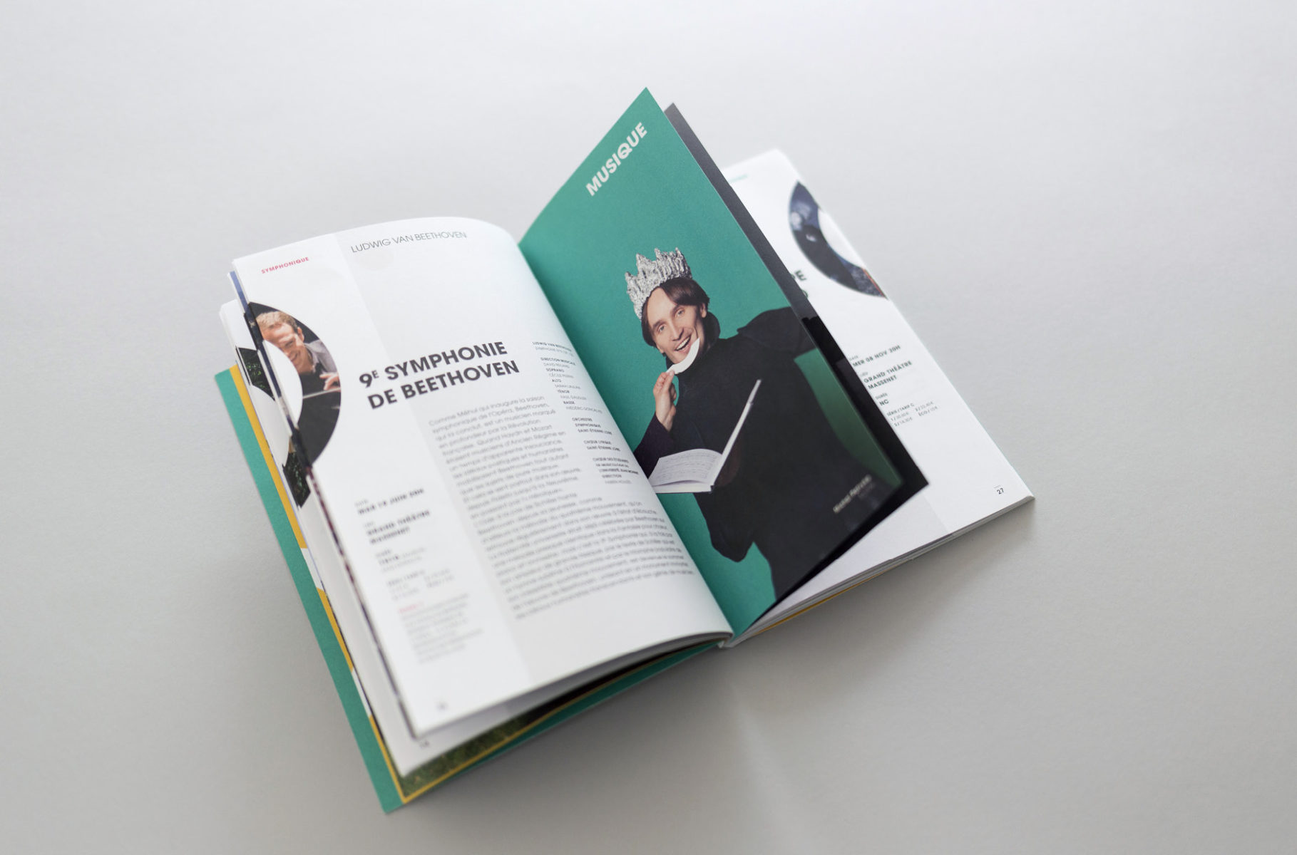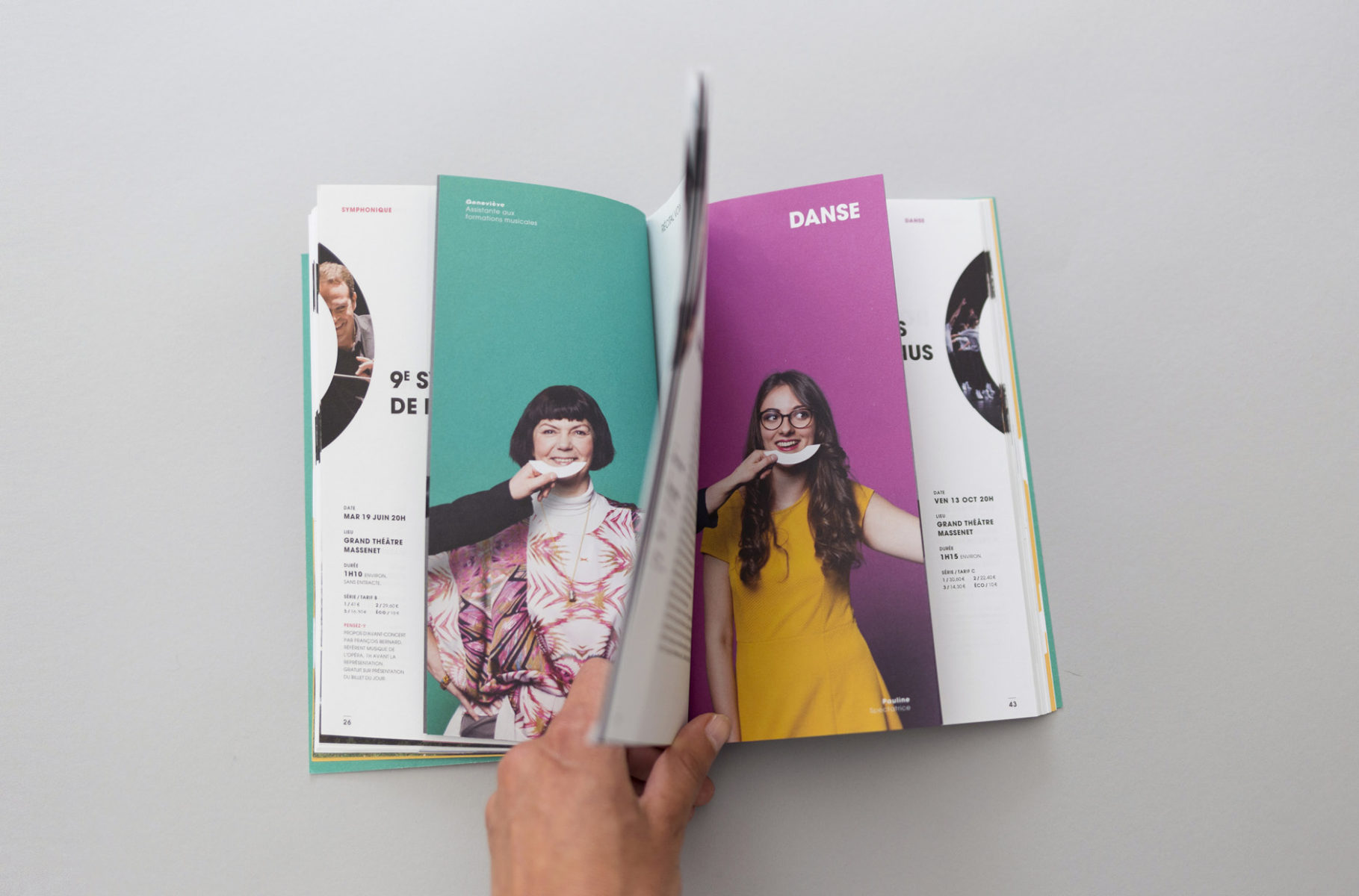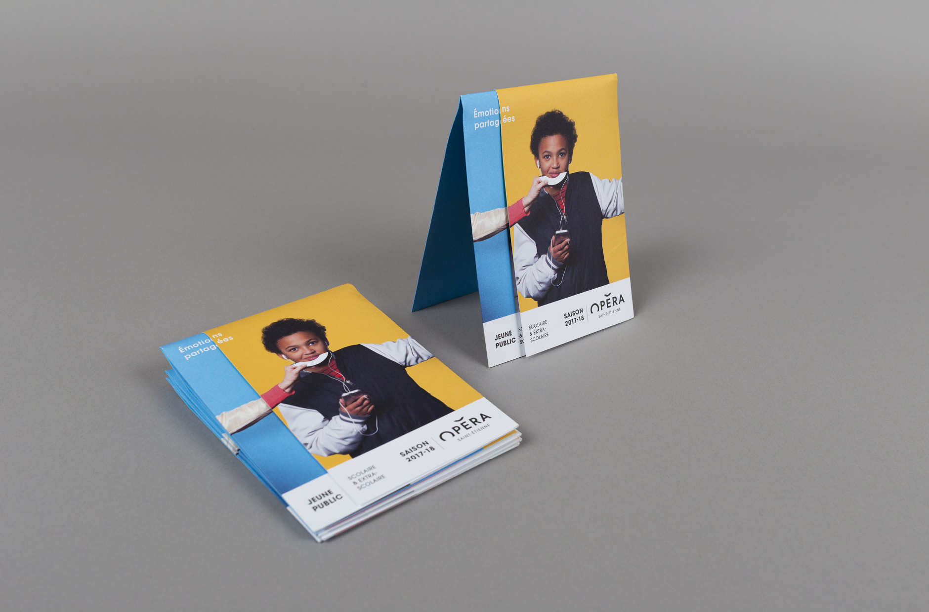 En 2015, nous concevions l'identité visuelle de l'opéra. Un logo typographique décrivant autant le bâtiment (avec son accent en forme de pagode) que la mission de cet opéra (accueillir et divertir tous les publics). Au fur et à mesure des saisons, le challenge était de poursuivre et renouveler cette histoire. Pour la première édition, nous mettions en avant les agents, puis l'orchestre l'année suivante. En 2017, nous avions décidé de mélanger les agents, les musiciens et les publics !