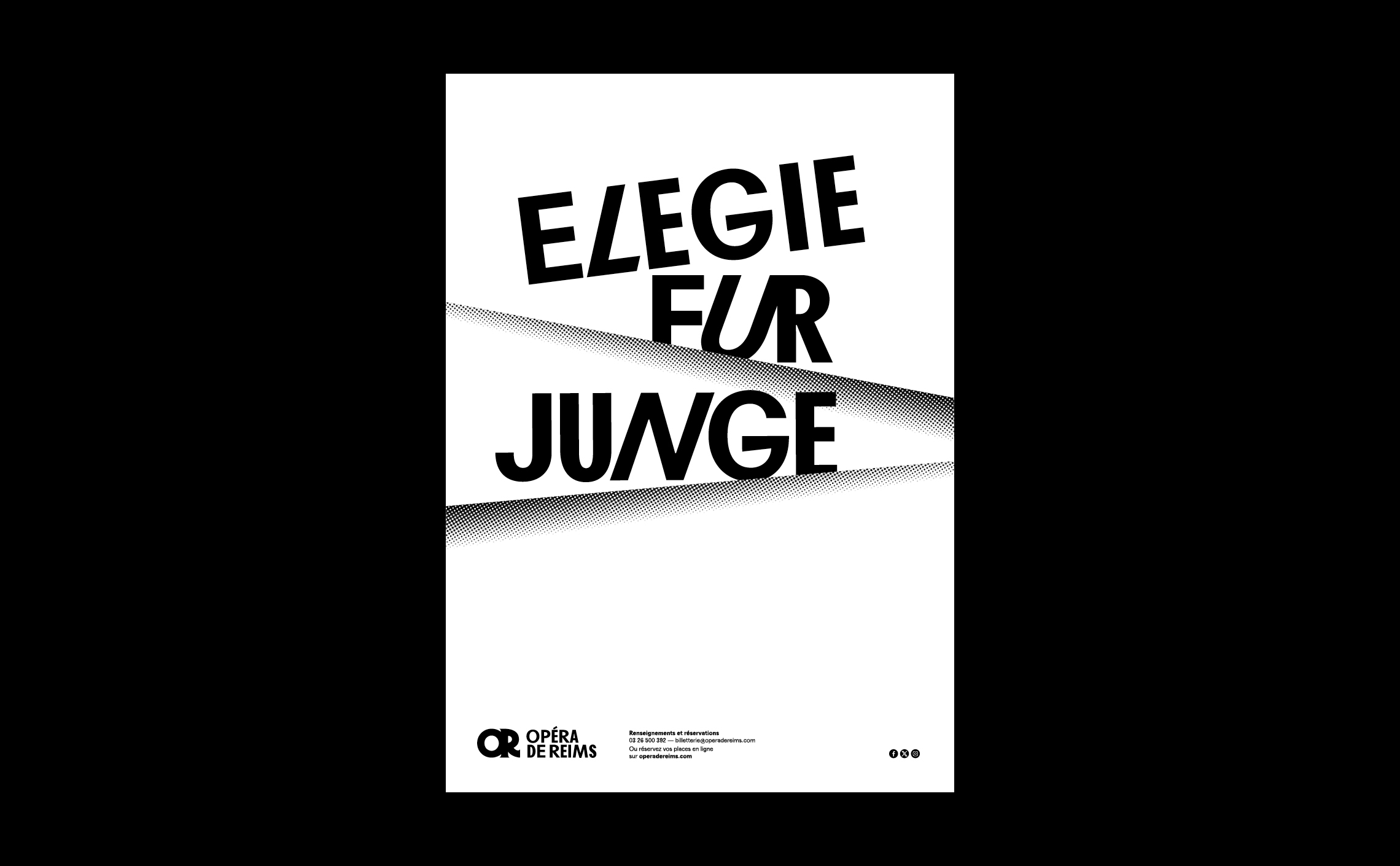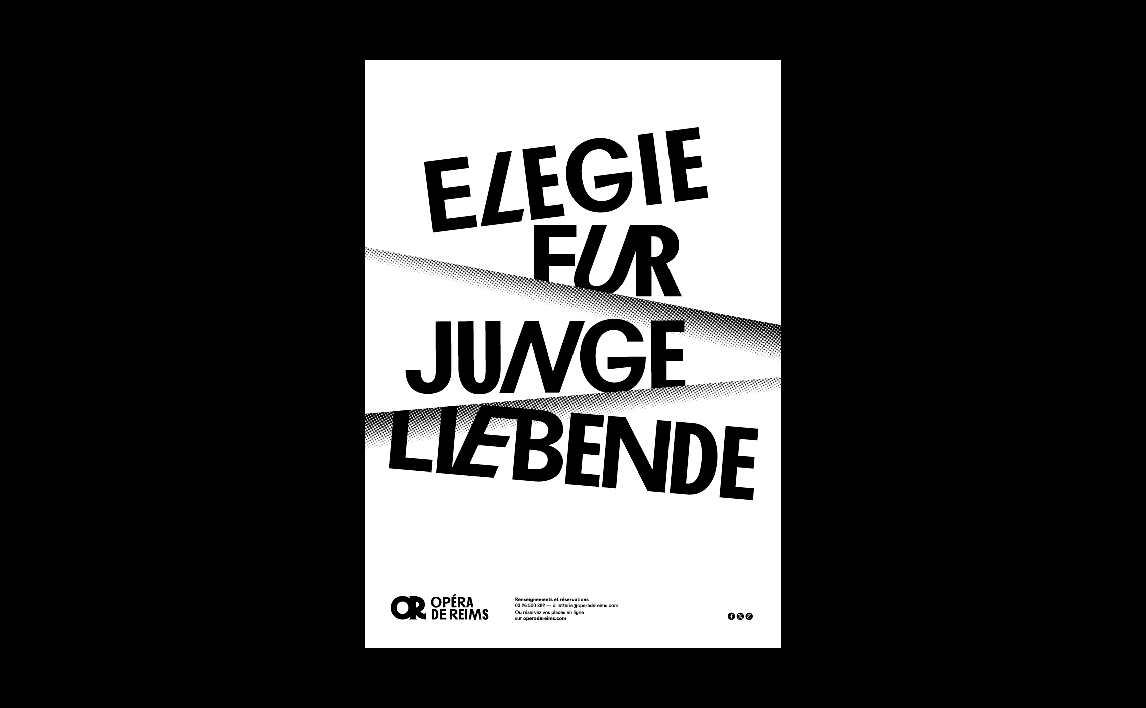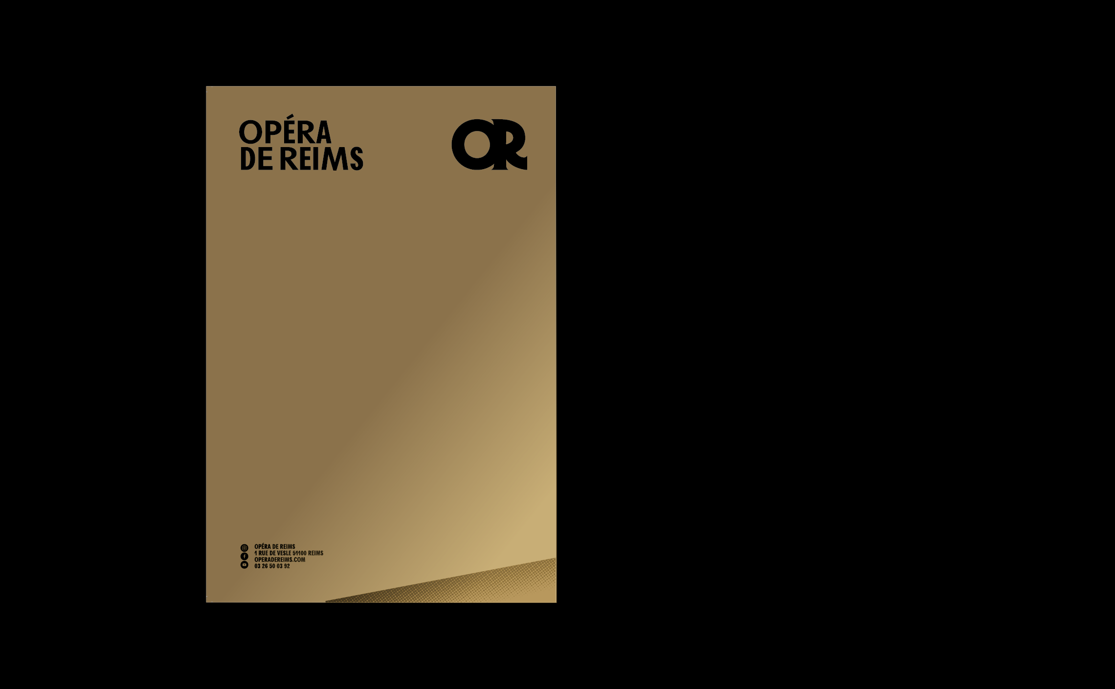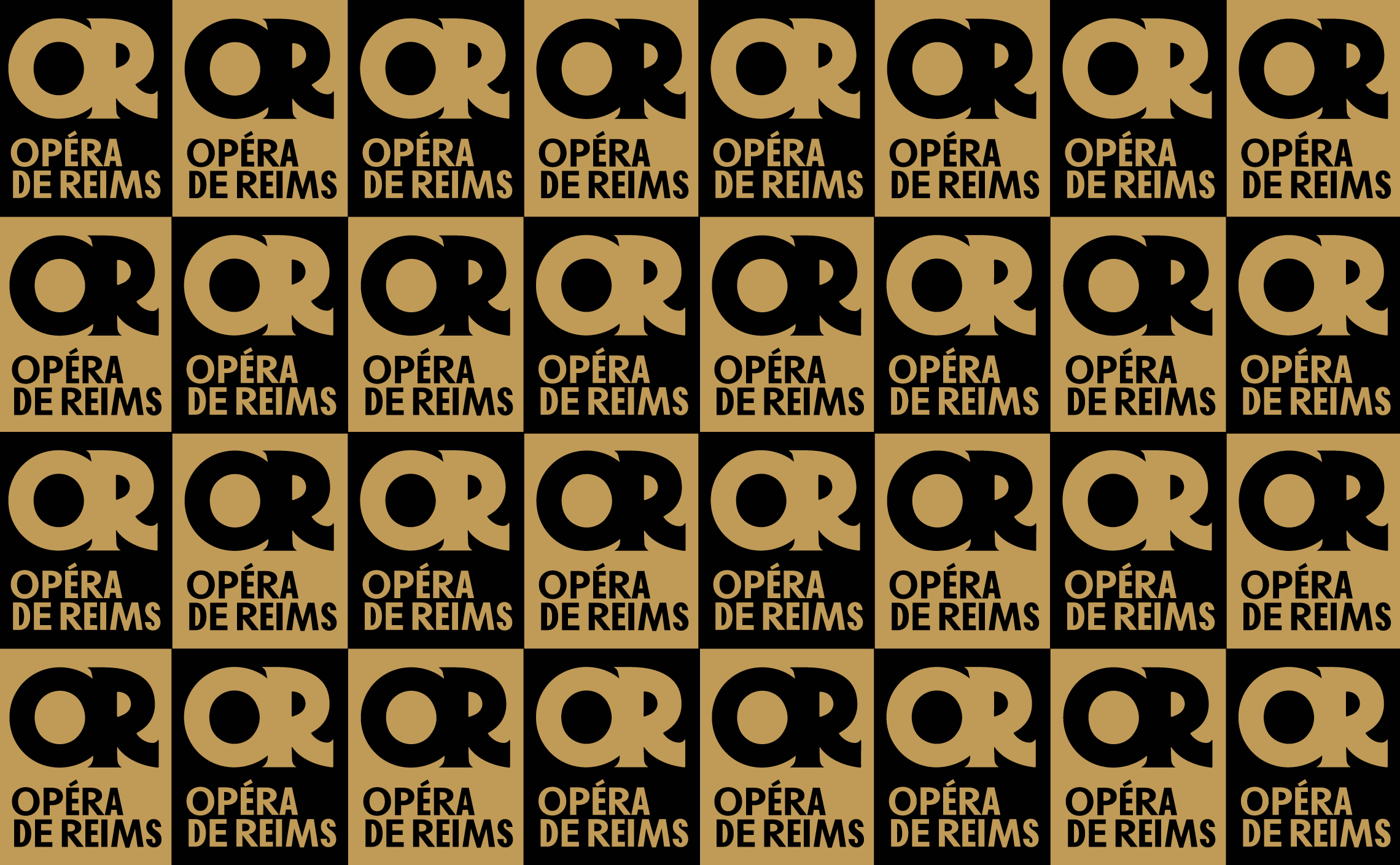 Le monogramme est une ligature travaillée à partir du caractère typographique Herbus (Eliott Grunewald). Le titre est composé en utilisant deux graisses distinctes de l'Agipo (Radim Pesko). Ces deux polices de caractères définissent la palette typographique de l'identité visuelle de l'Opéra de Reims.
