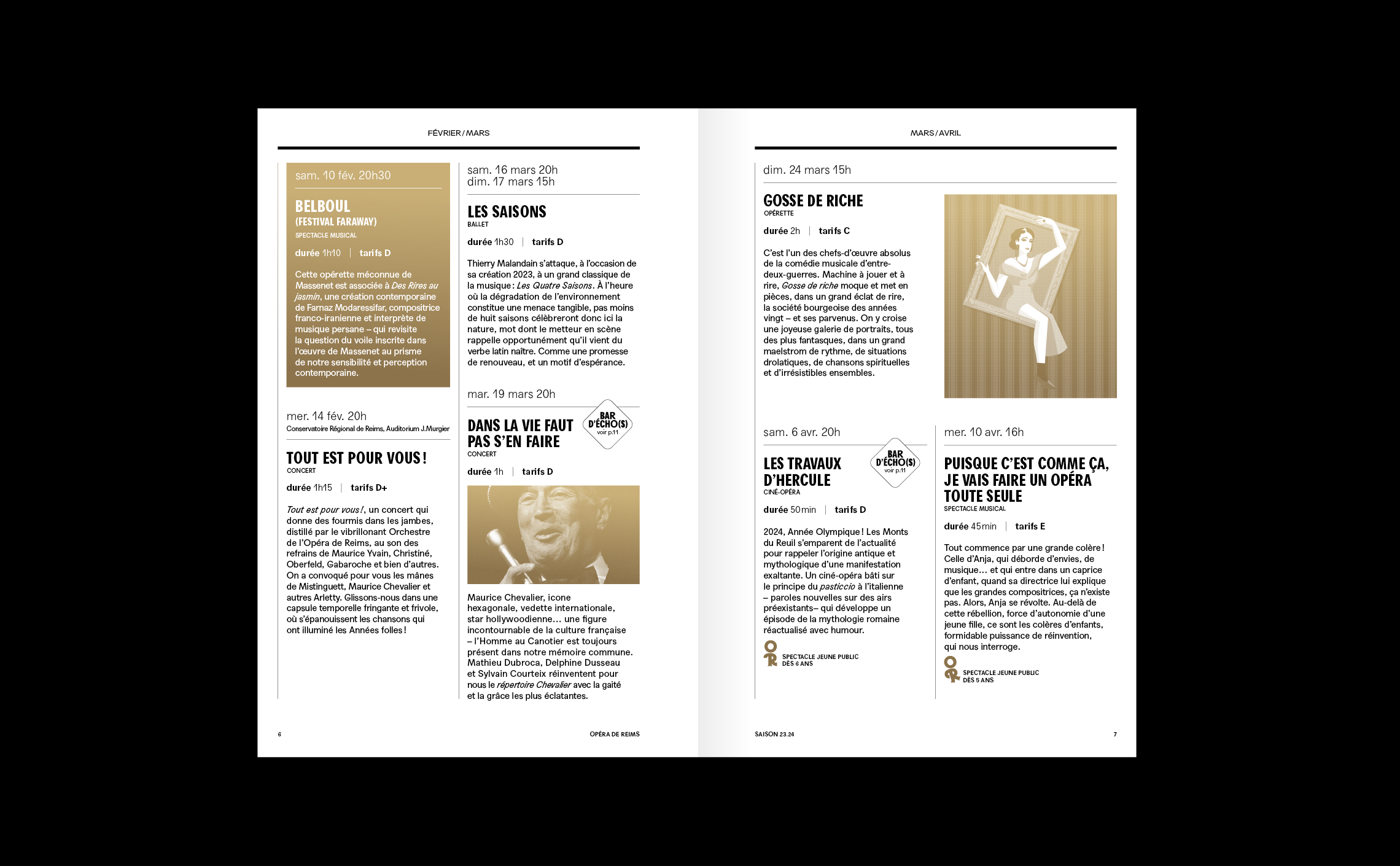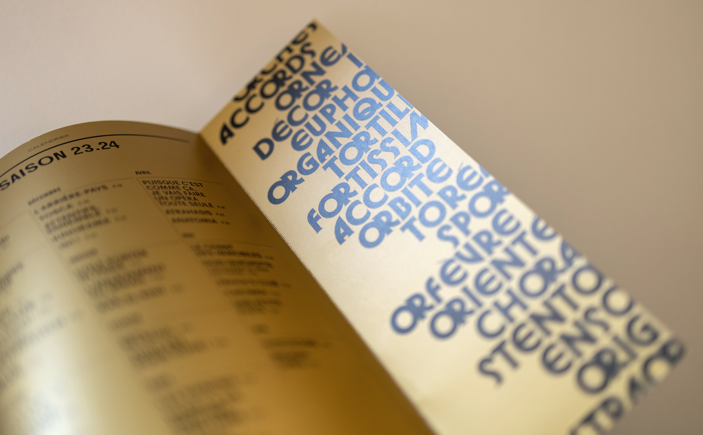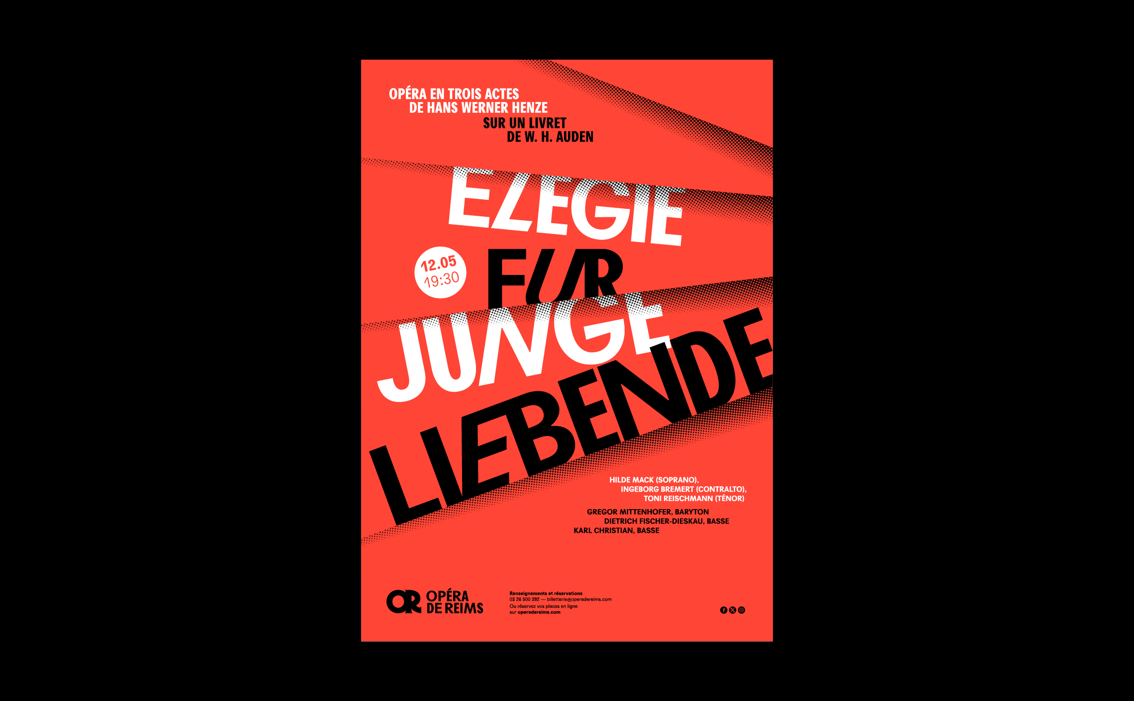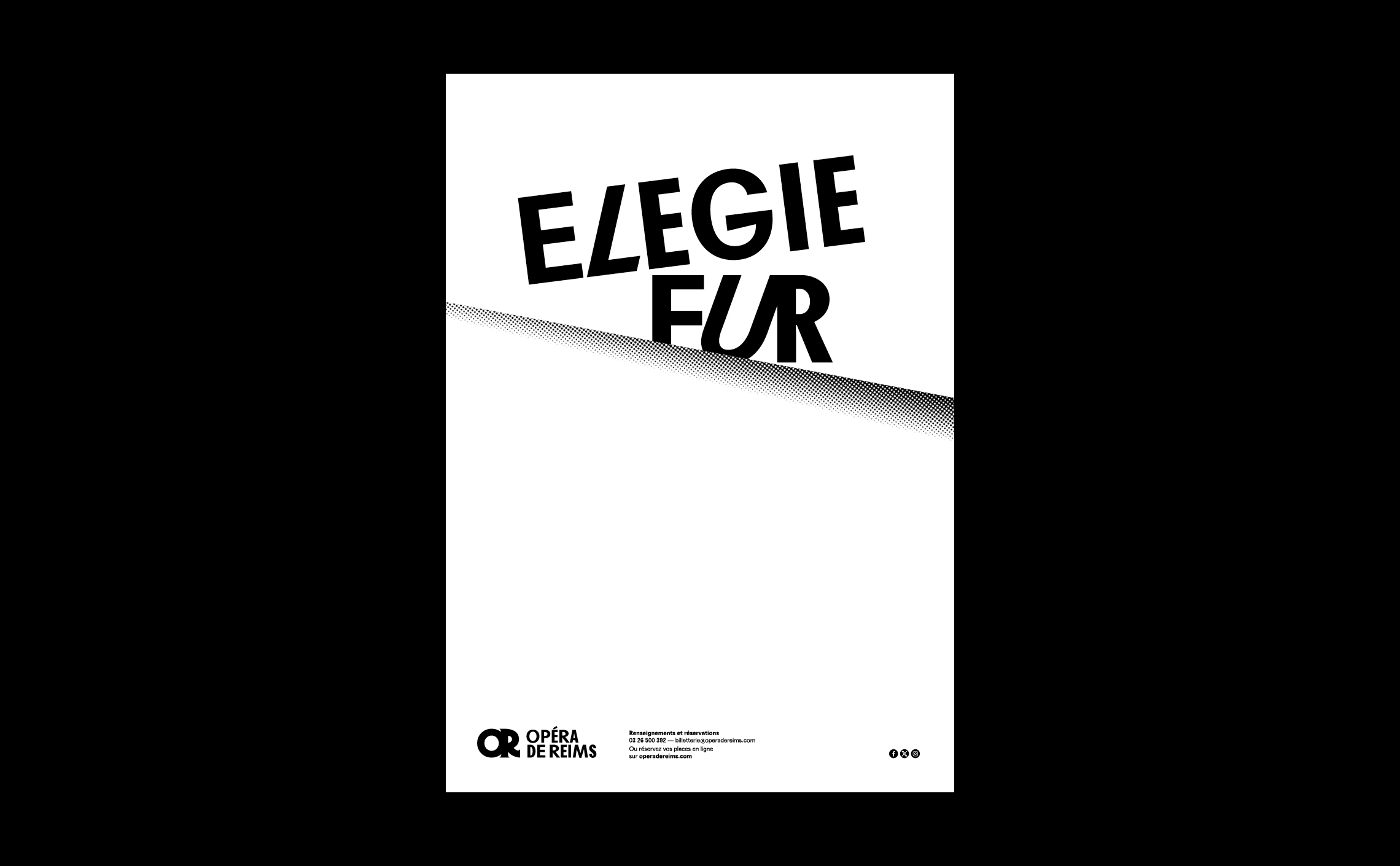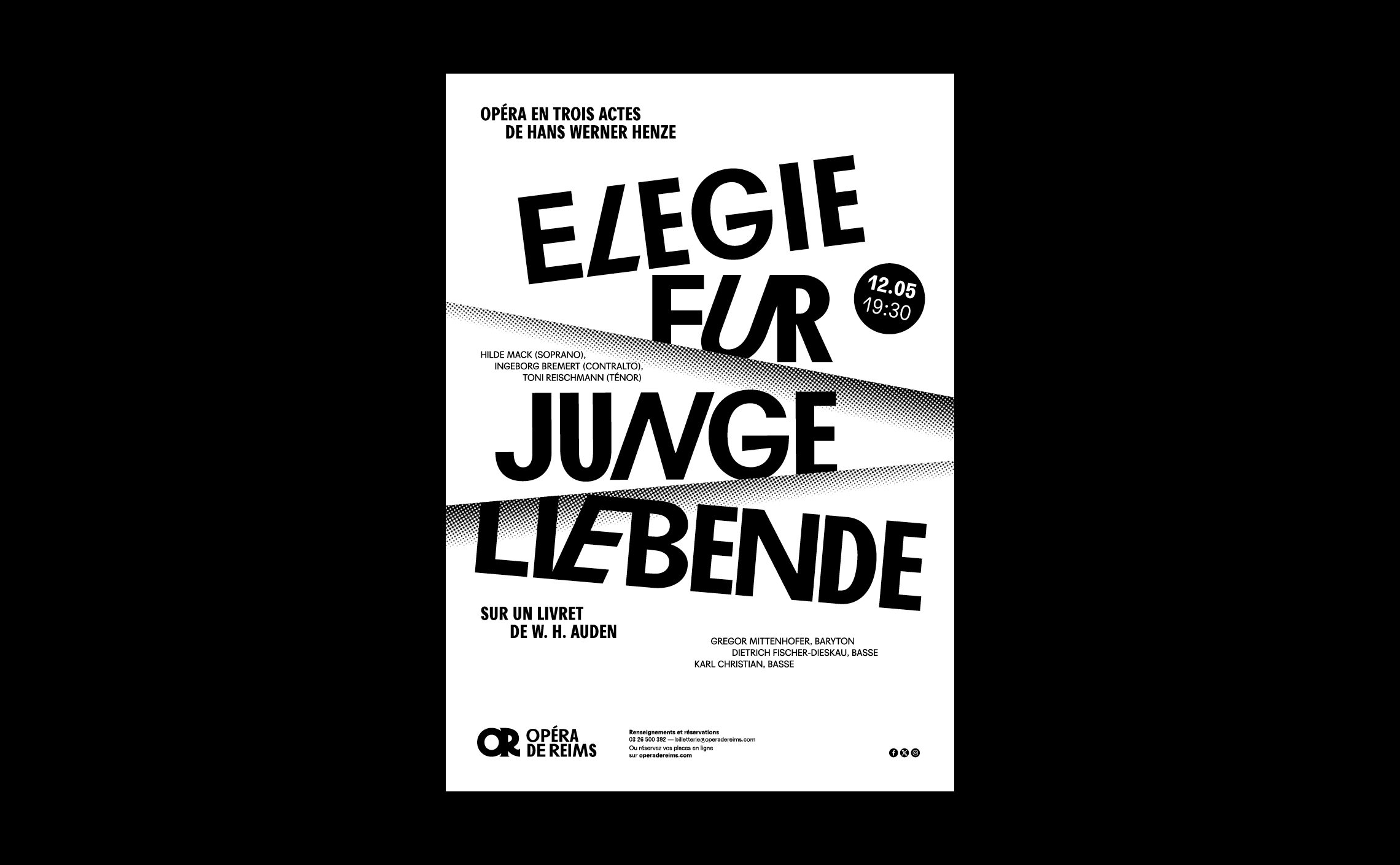 Le monogramme est une ligature travaillée à partir du caractère typographique Herbus (Eliott Grunewald). Le titre est composé en utilisant deux graisses distinctes de l'Agipo (Radim Pesko). Ces deux polices de caractères définissent la palette typographique de l'identité visuelle de l'Opéra de Reims.