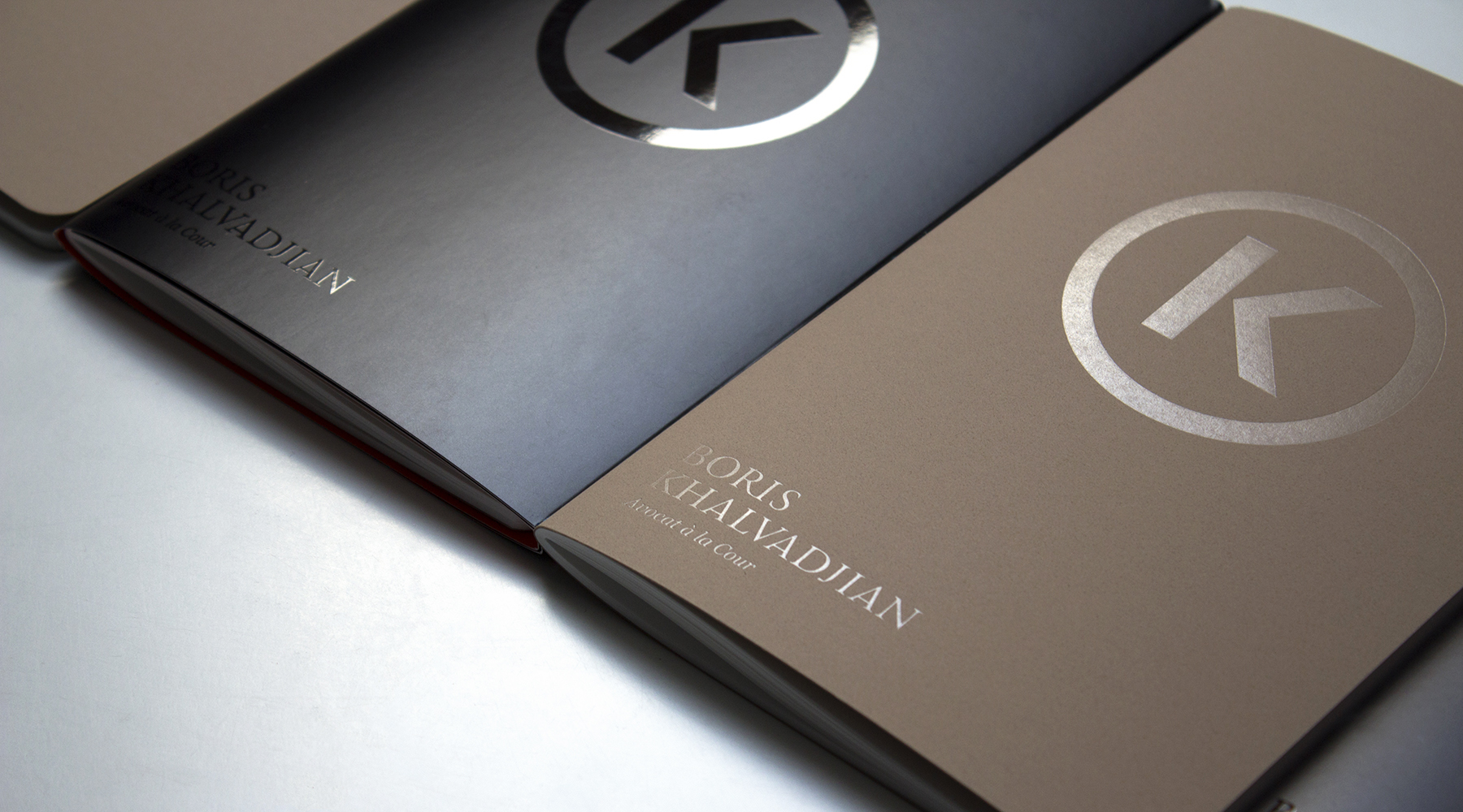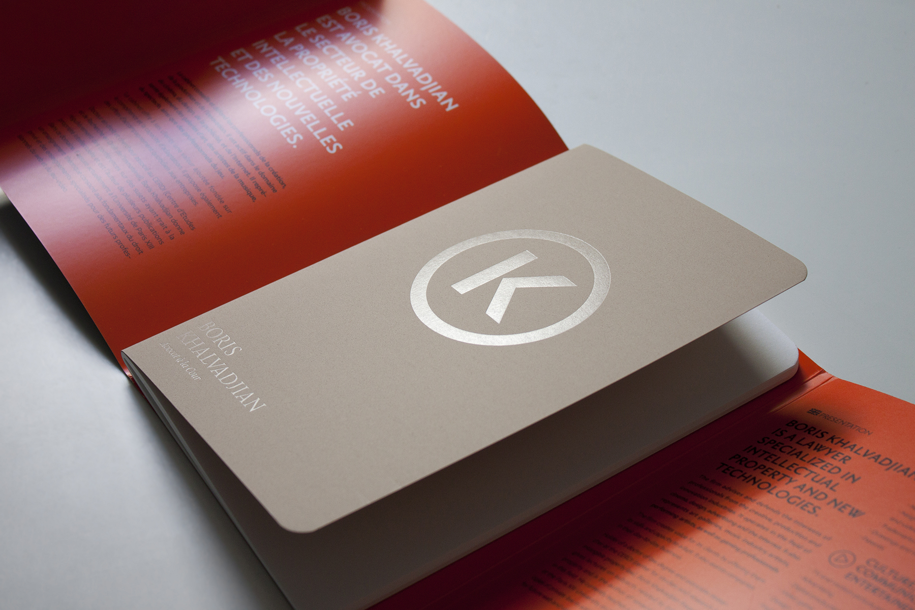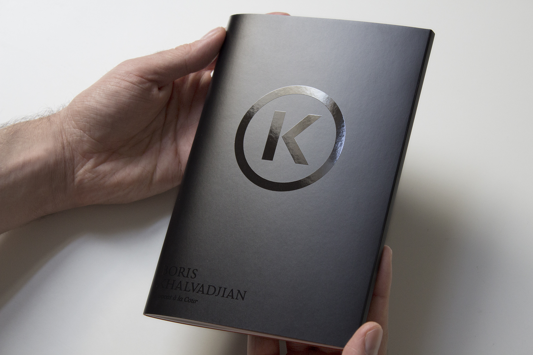 Notre réponse a donc pris la forme d’une plaquette qui est à la fois un support de communication et un objet « gift » qui va pouvoir accompagner les personnes au quotidien dans leur activité professionnelle. Le dépliant commercial est réalisé et monté comme une sur-couverture qui enveloppe un carnet de notes dont le rôle sera d’être le meilleur allié de son destinataire. Se glissant aisément dans une sacoche, et discrètement marqué du logotype monogramme « K » de Boris Khalvadjian ce carnet prolonge affectueusement la mission purement publicitaire du dépliant commercial. À noter que cet emblème ,et son bloc typographique, ont été réalisés avec talent par la DA Marie-Pierre Pastini.