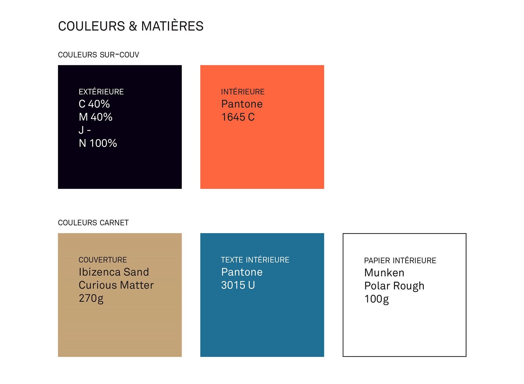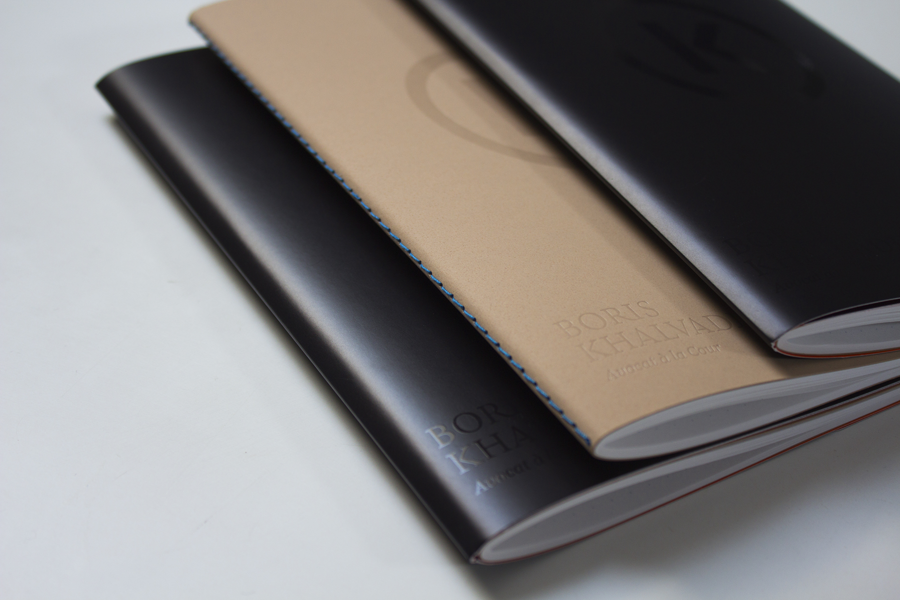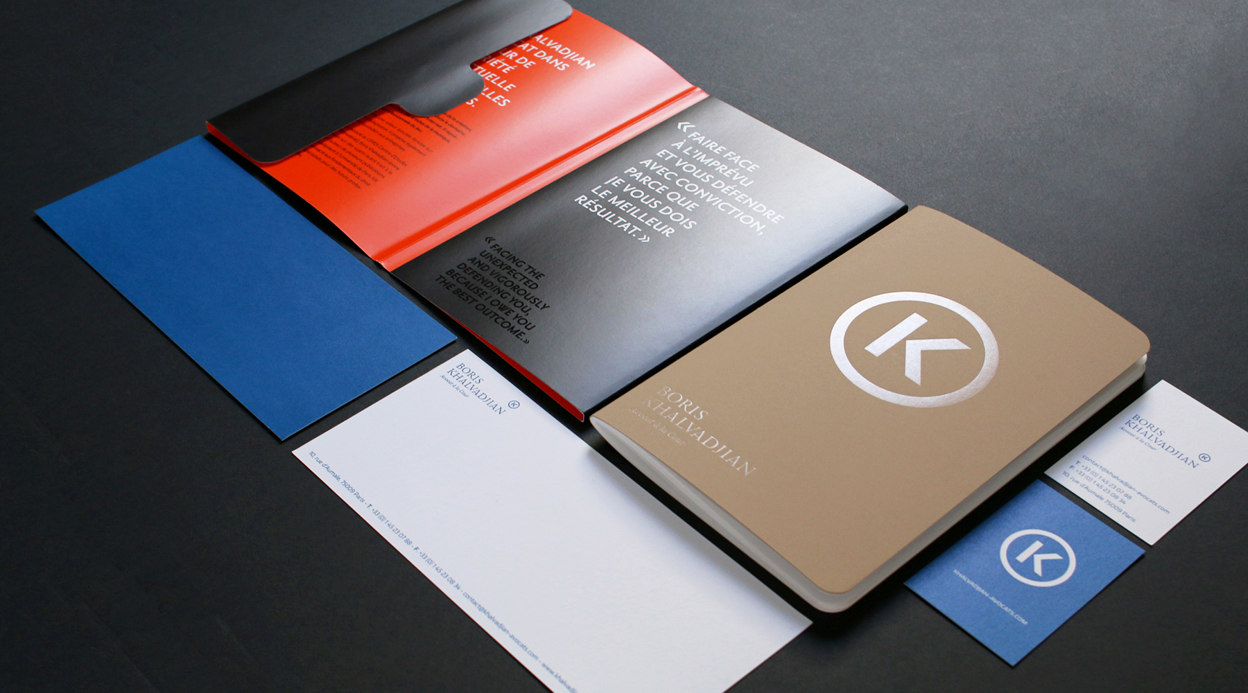 Notre réponse a donc pris la forme d’une plaquette qui est à la fois un support de communication et un objet « gift » qui va pouvoir accompagner les personnes au quotidien dans leur activité professionnelle. Le dépliant commercial est réalisé et monté comme une sur-couverture qui enveloppe un carnet de notes dont le rôle sera d’être le meilleur allié de son destinataire. Se glissant aisément dans une sacoche, et discrètement marqué du logotype monogramme « K » de Boris Khalvadjian ce carnet prolonge affectueusement la mission purement publicitaire du dépliant commercial. À noter que cet emblème ,et son bloc typographique, ont été réalisés avec talent par la DA Marie-Pierre Pastini.