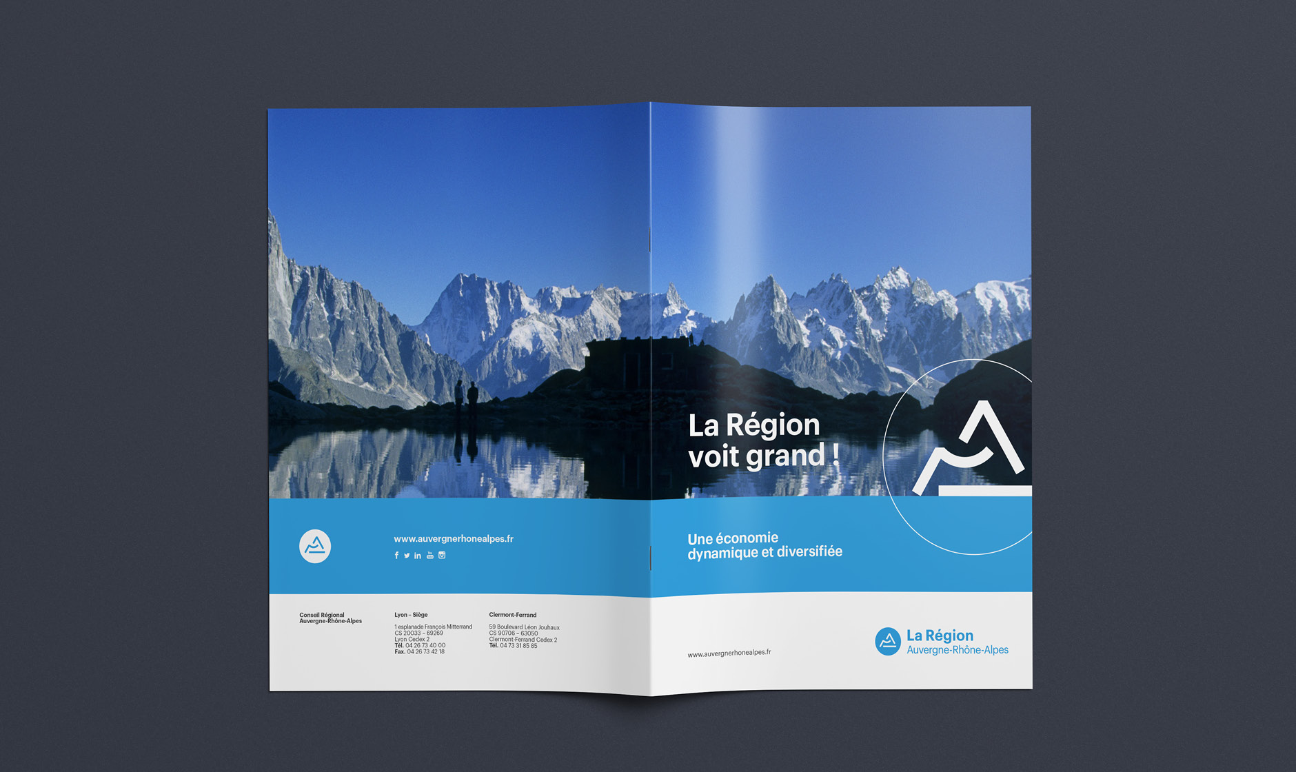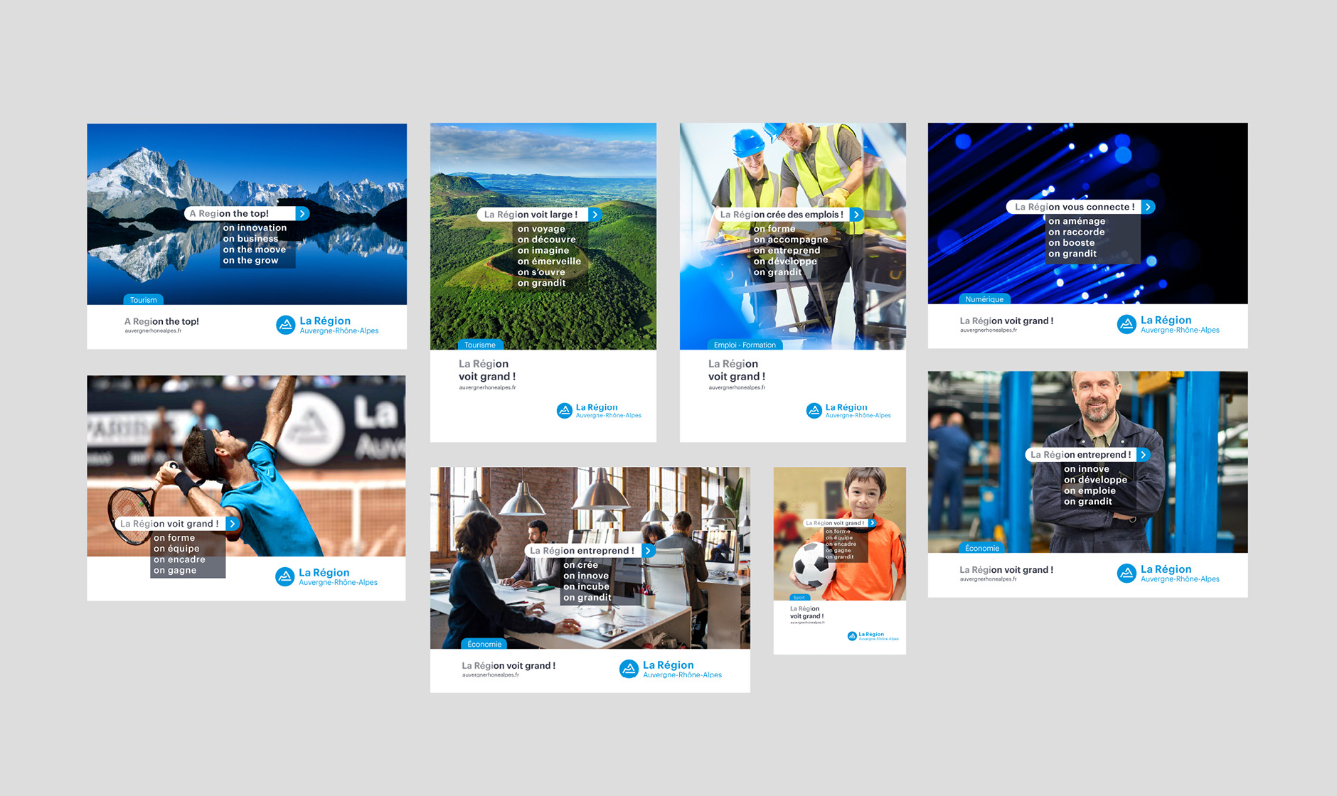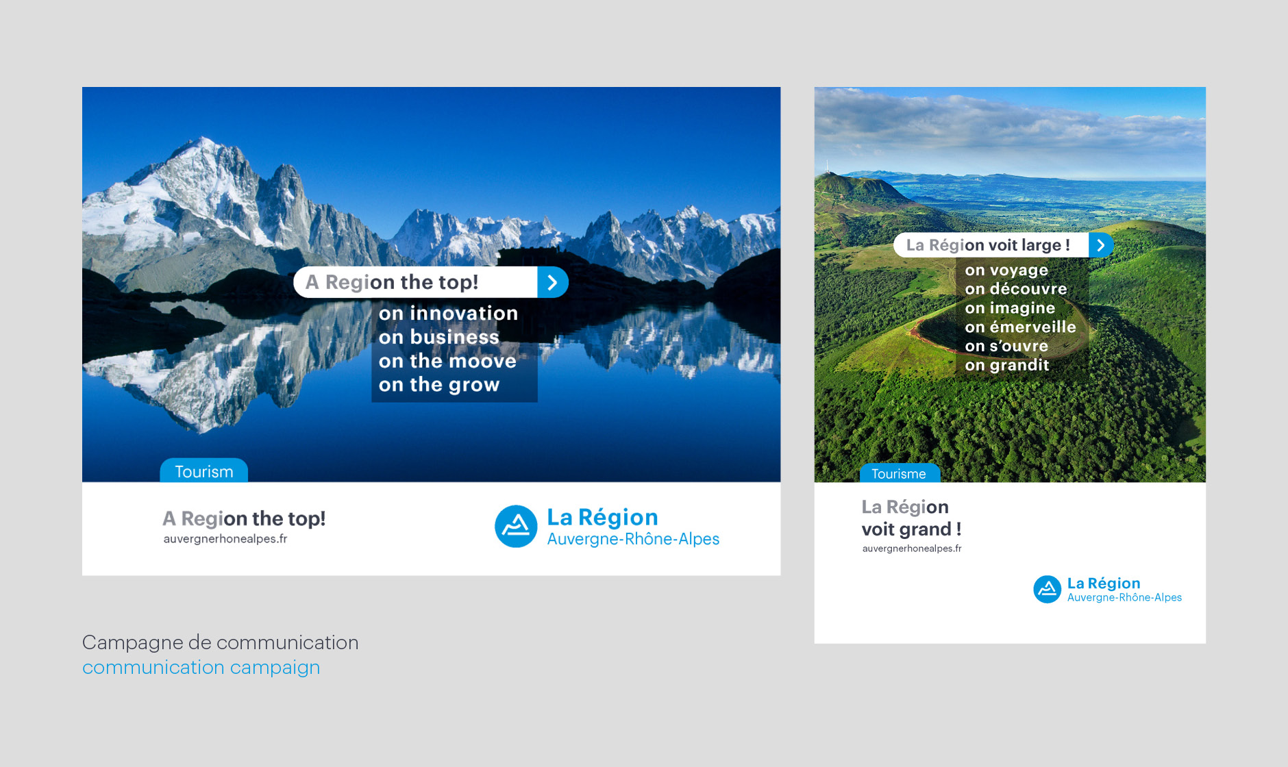 Par un jeu typographique induisant un double niveau de lecture, le mot Région se transforme en phrase d'action "On voit grand !". Quand "La Région voit grand", on voit tous grand.