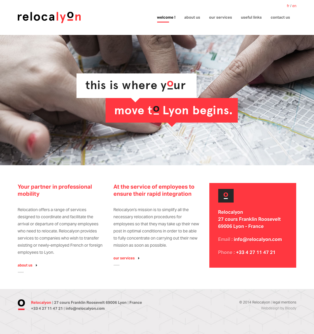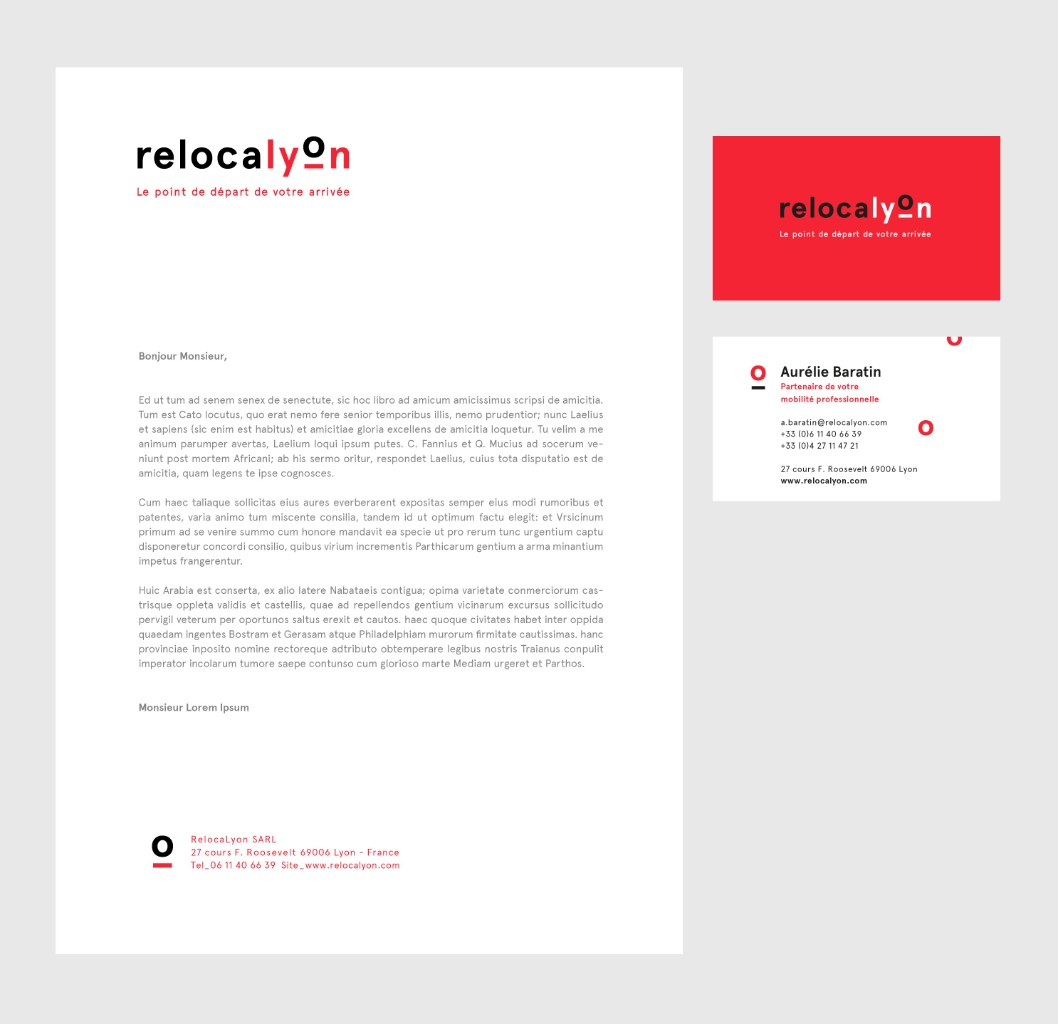 Nous avons conçu une identité visuelle tout en mouvement. Nous suggérons l'idée de "relocation" en mettant en avant le "o" du mot Lyon. Comme si cette lettre venait d'arriver dans le mot Lyon.