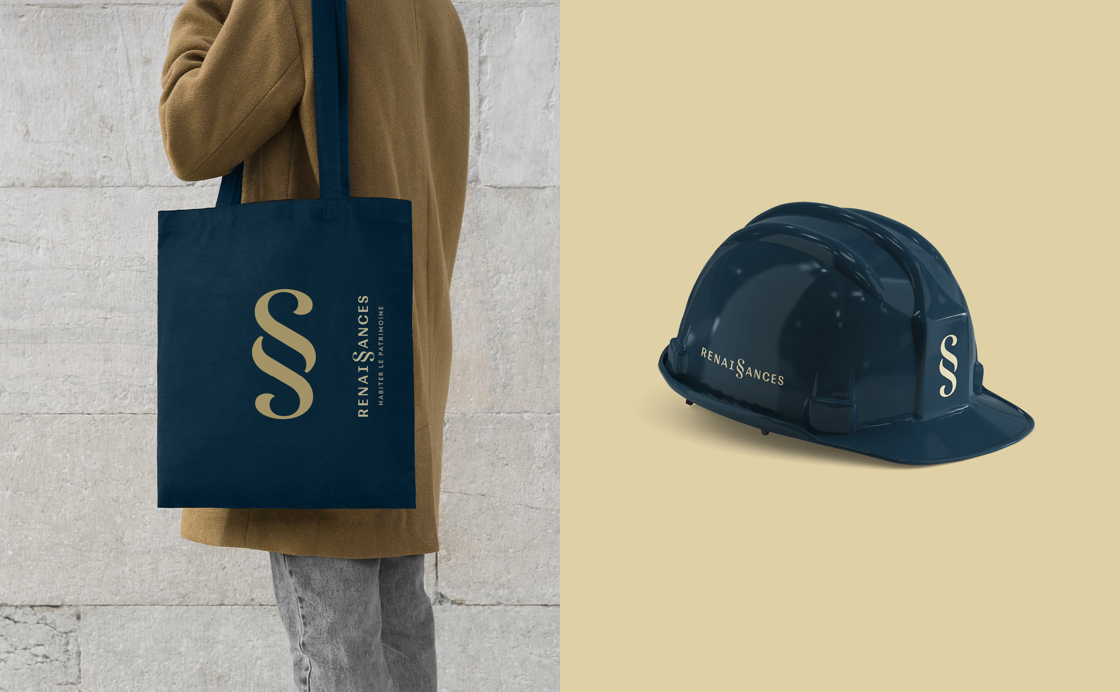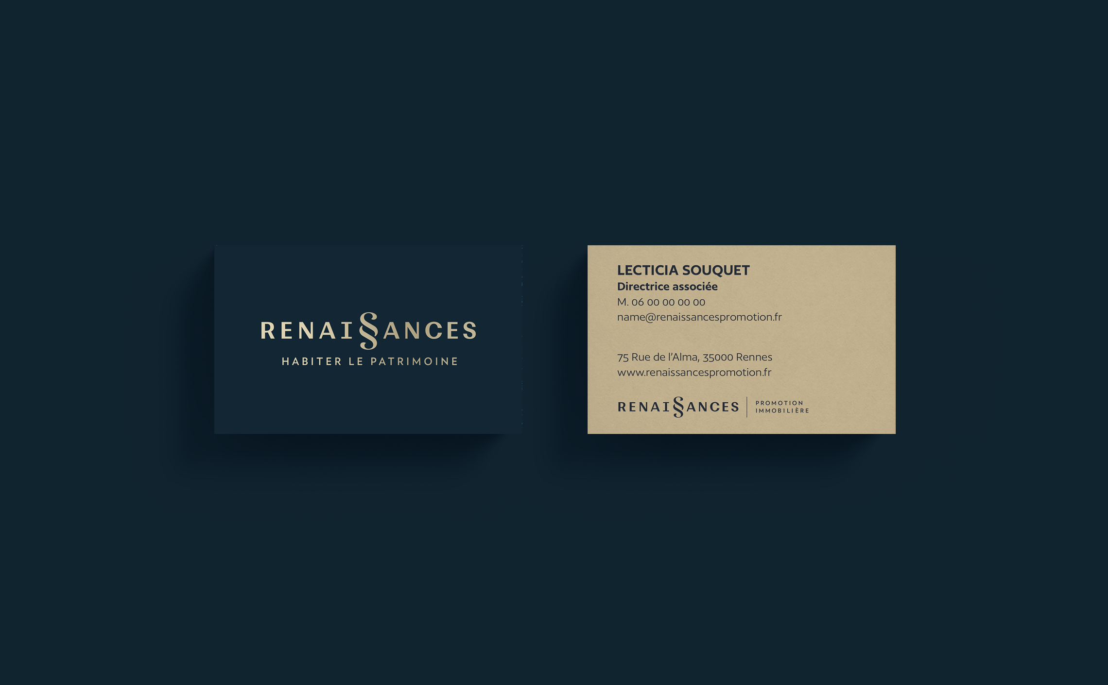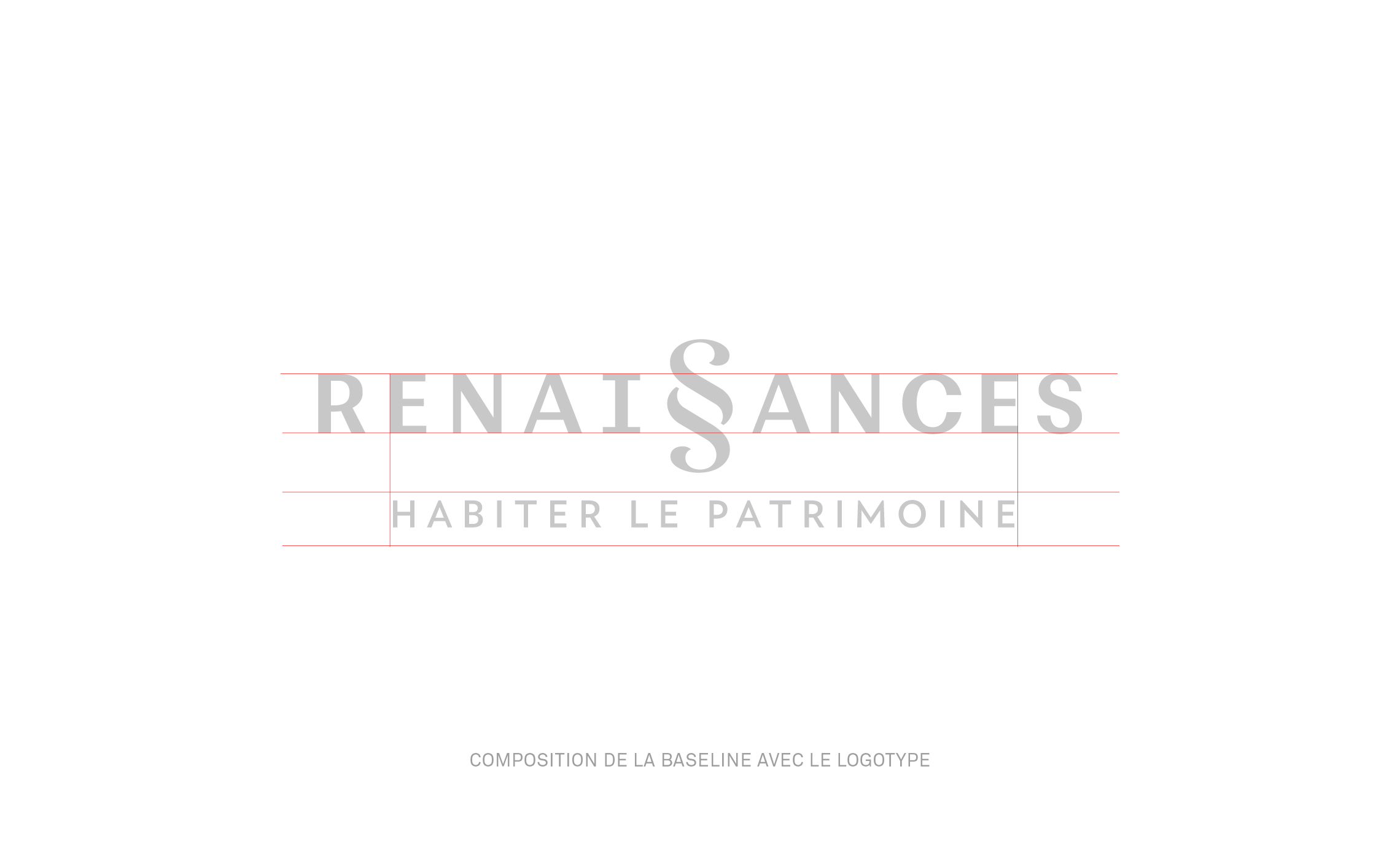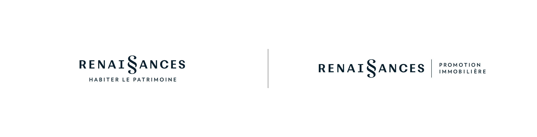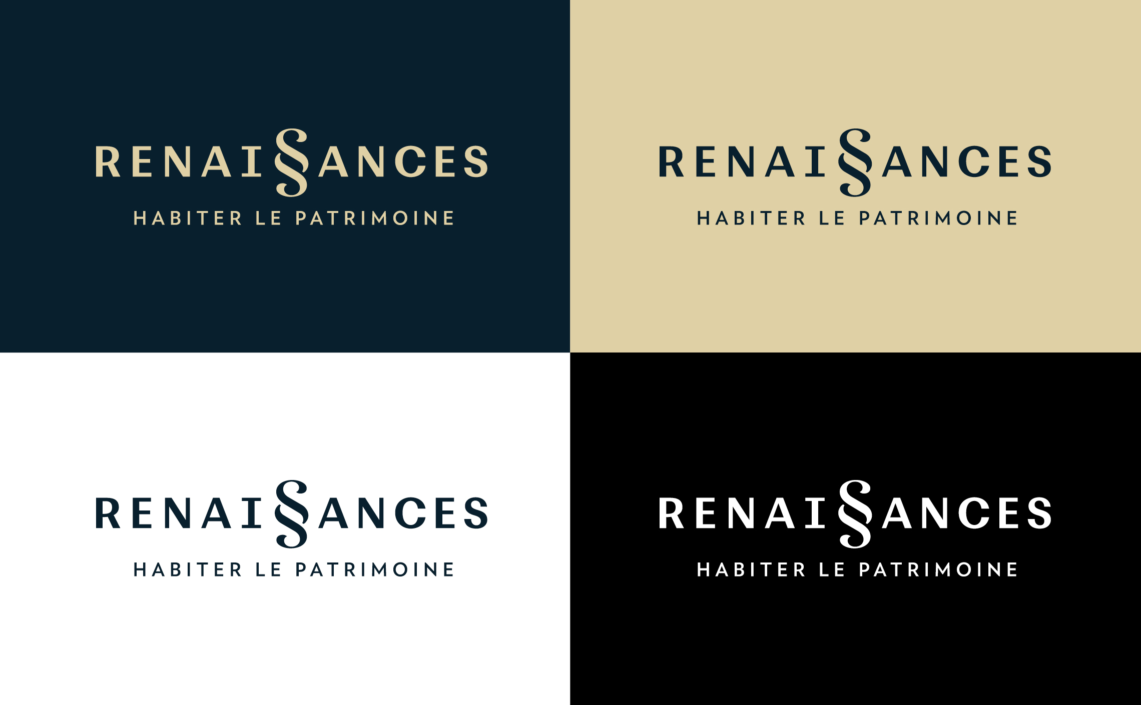 Il existe deux versions du logotype qui se distinguent par l’ajout d’un intitulé secondaire. Le logotype dit de «communication externe» utilise l’ajout d’un slogan «Habiter le patrimoine» composé centré sous le logotype. Le logotype dit «institutionnel» utilise quant à lui la baseline «Promotion immobilière» composée avec un filet vertical à droite du logotype Renaissances. Un code couleur très contrasté complète l’expression de la marque avec un bleu ardoise et un beige dorée. Tous deux évoquent des matériaux nobles du bâti.