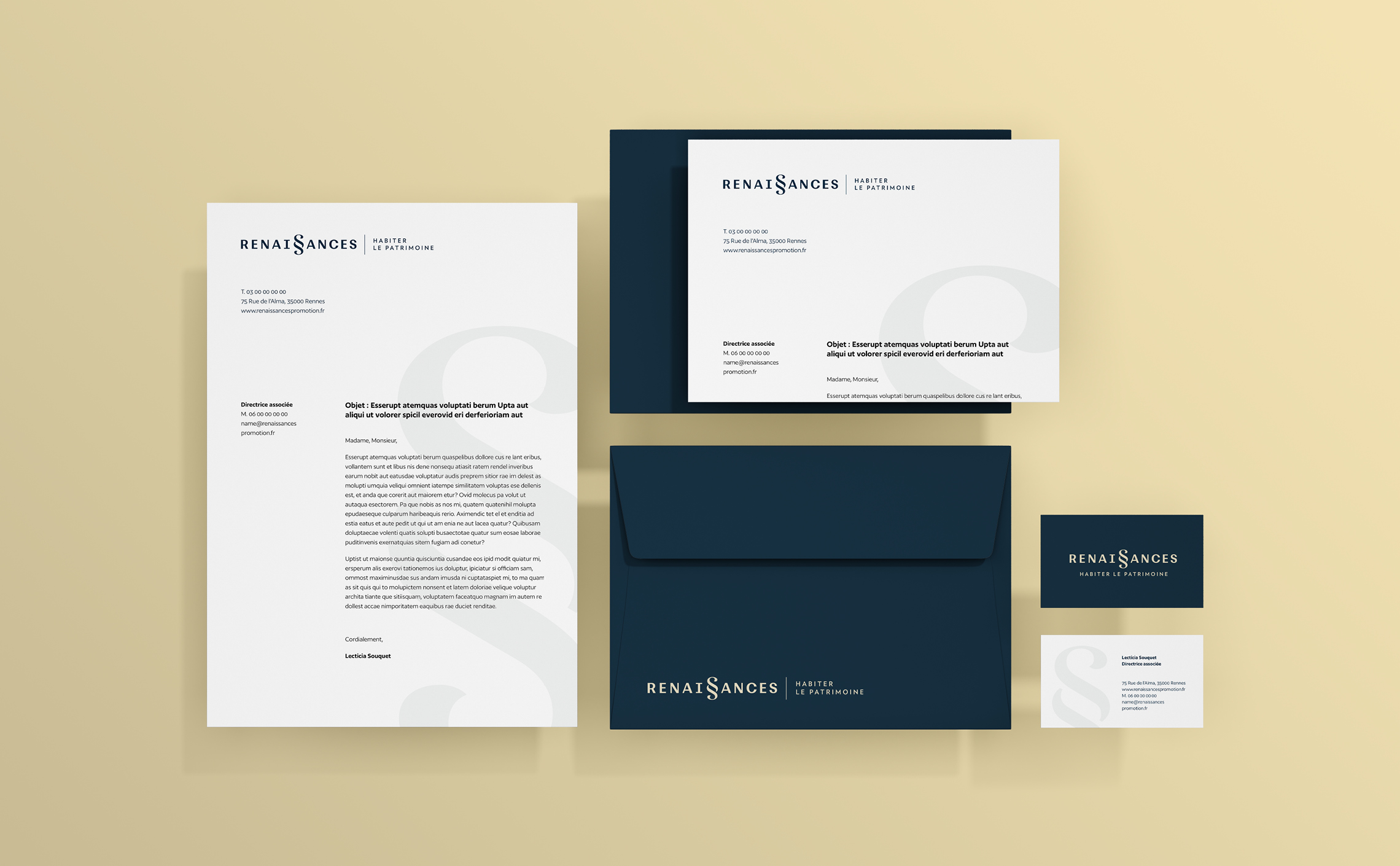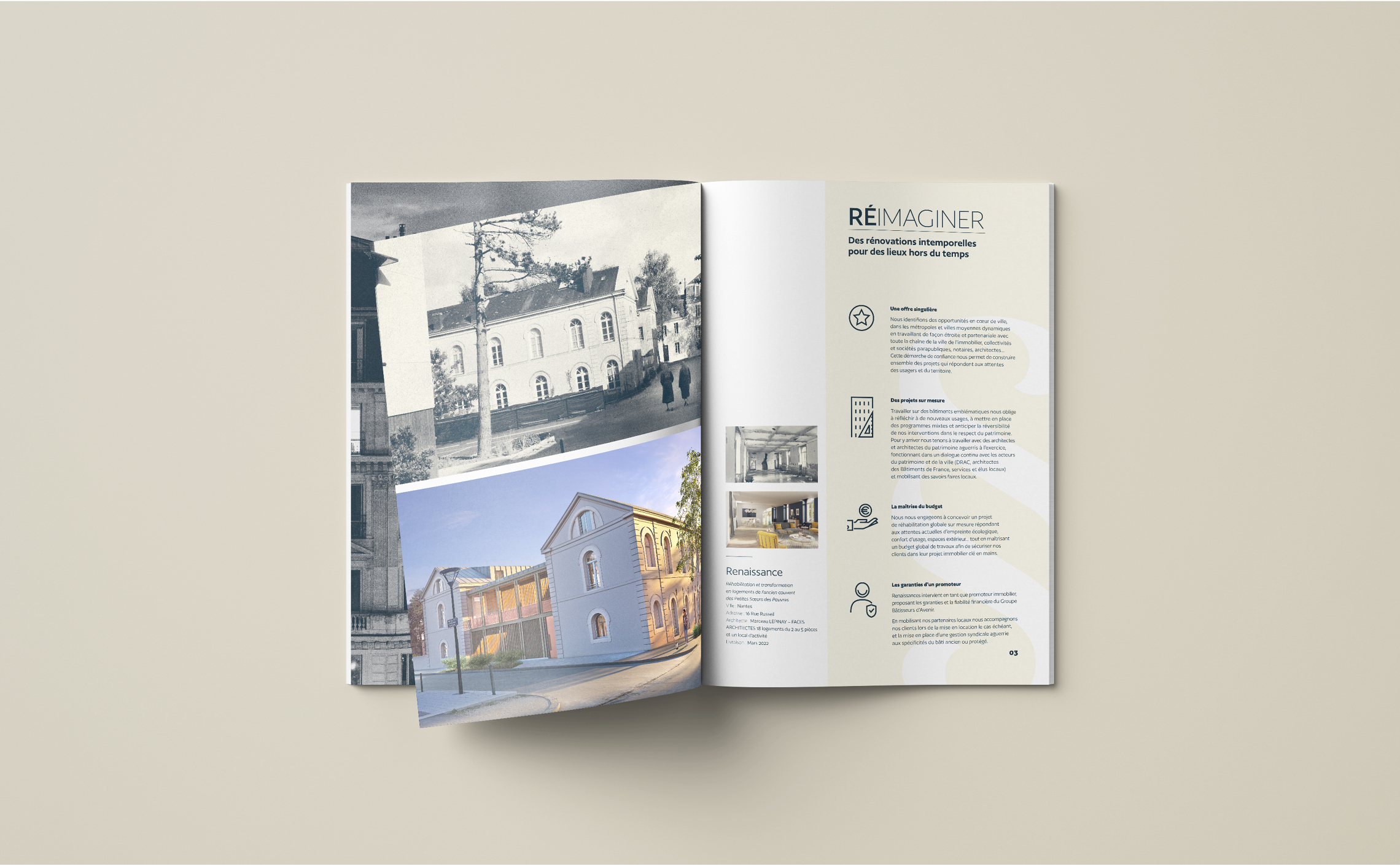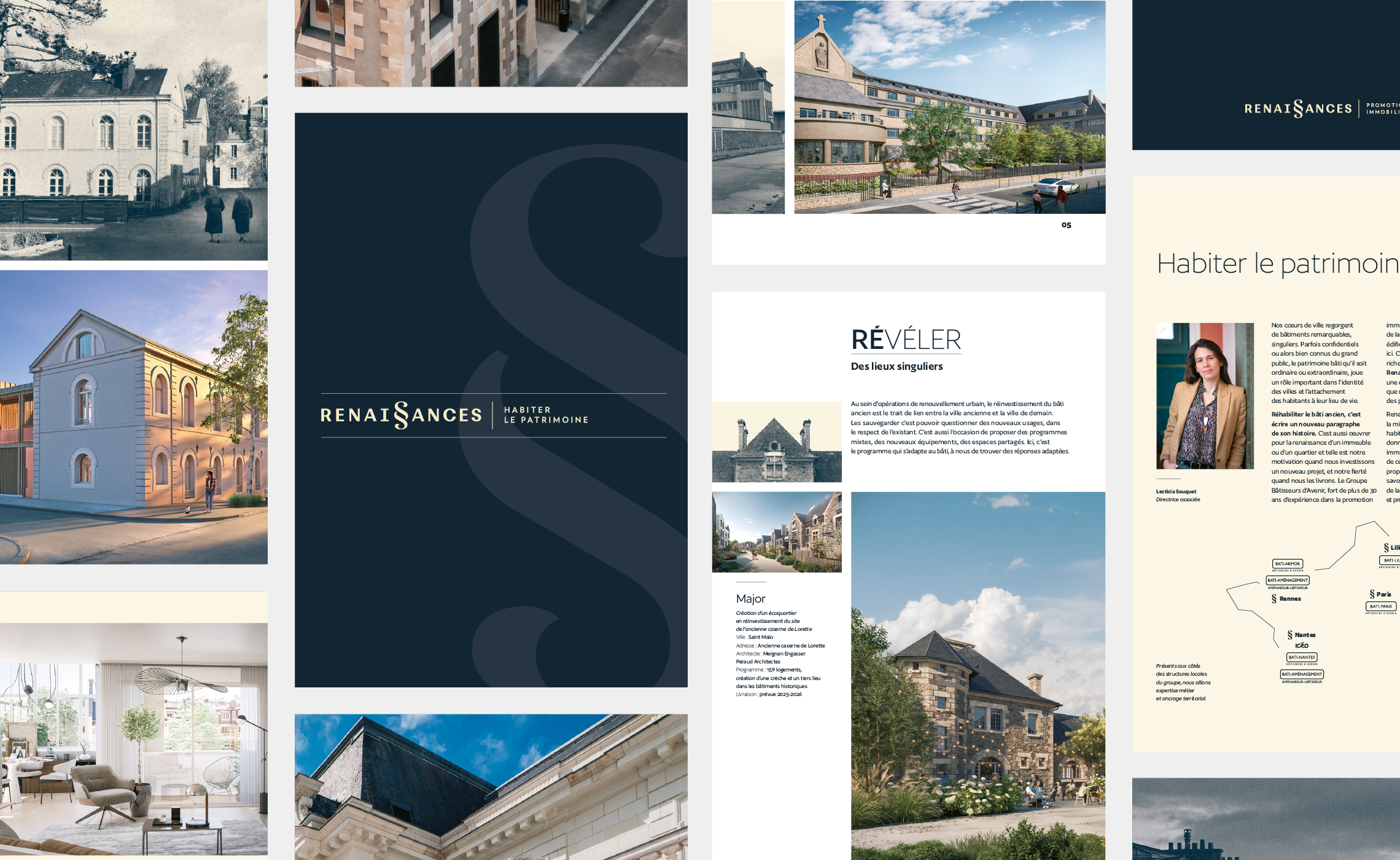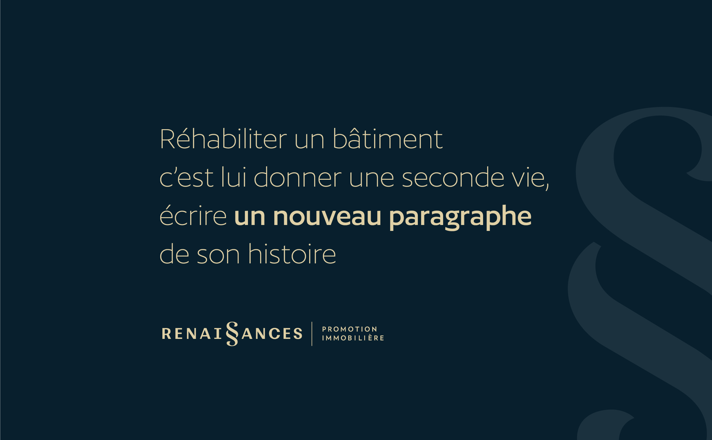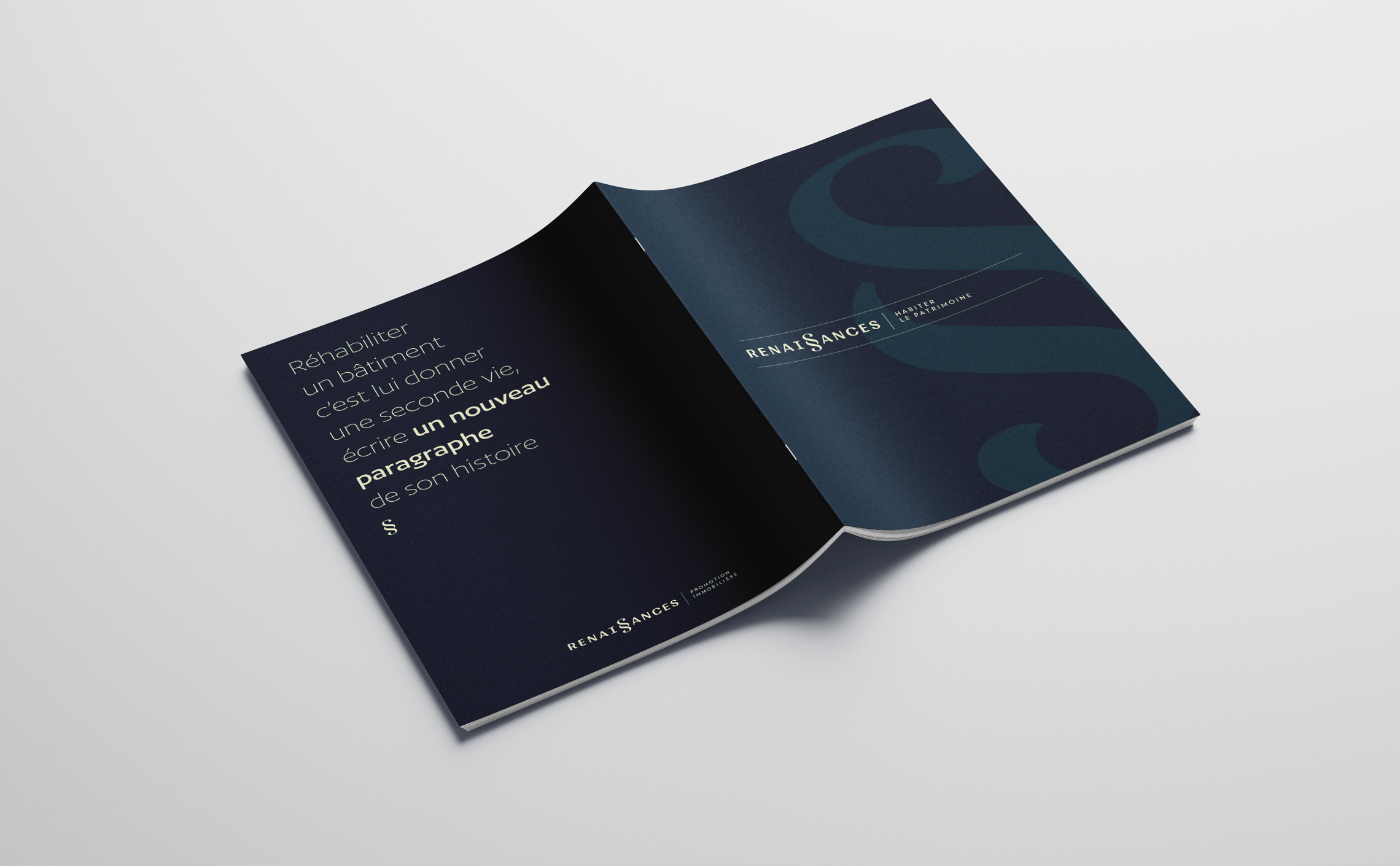 « Réhabiliter un bâtiment c’est lui donner une seconde vie, écrire un nouveau paragraphe de son histoire. C’est prolonger un lien fort entre les différentes étapes de son histoire pour créer du patrimoine vivant et habité. C’est promouvoir un patrimoine lieu de vie ». C’est avec la création de ce texte d’introduction qui pose la vocation de Renaissances que nous avons construit l’histoire de la marque. C’est également ce texte qui nous a conduit vers la création de son identité visuelle.