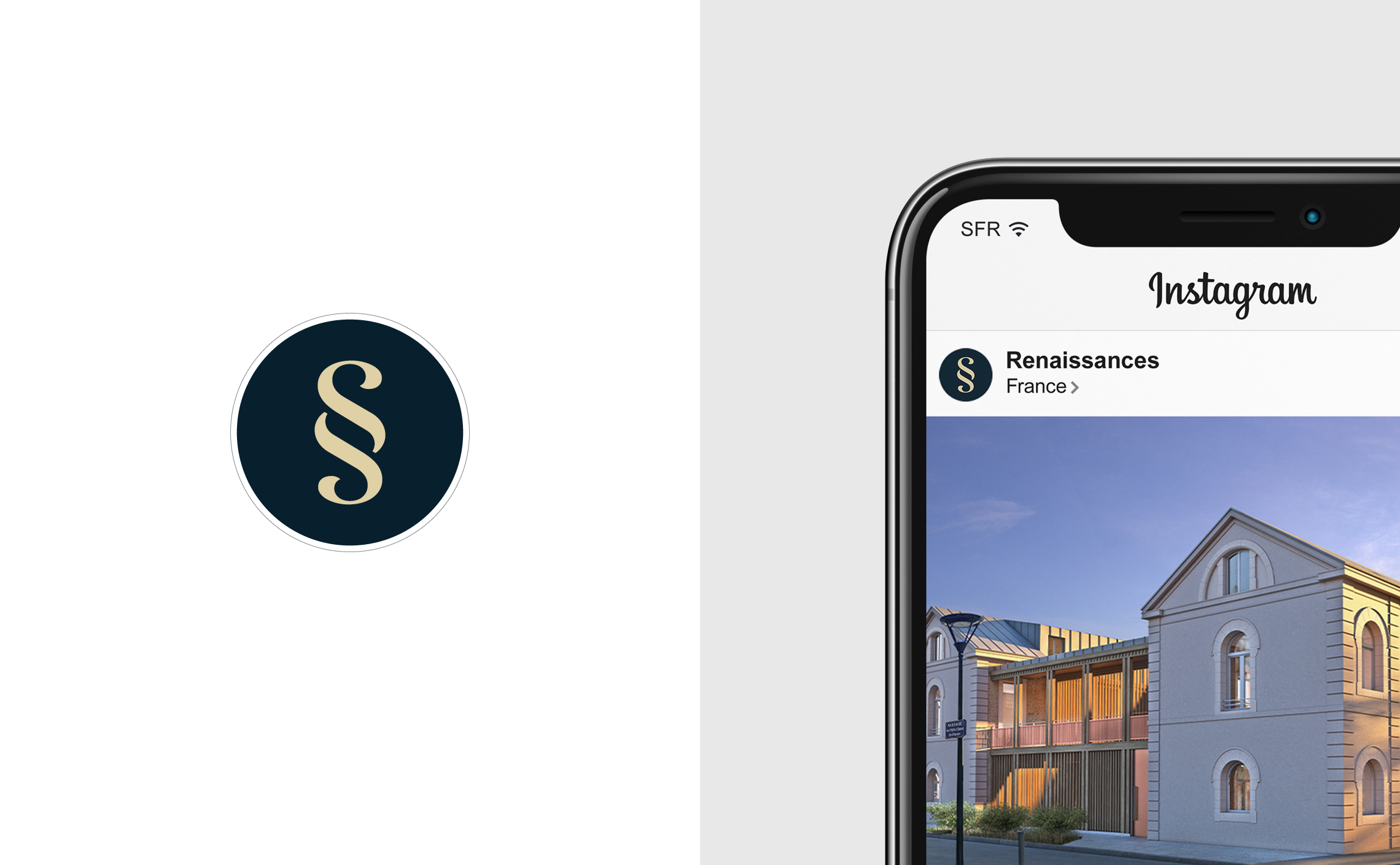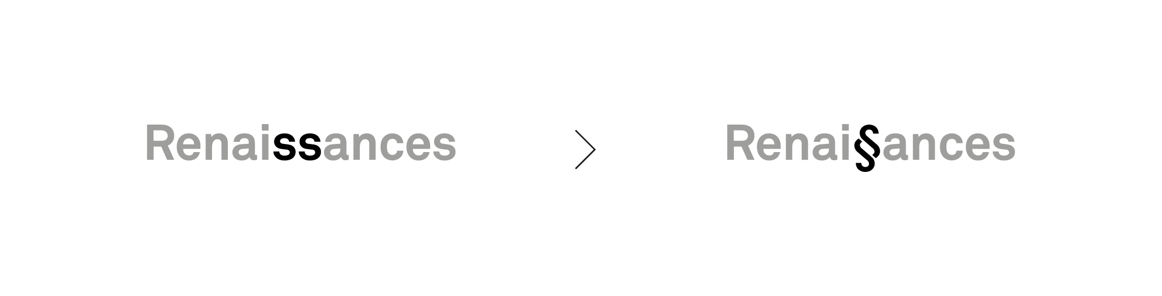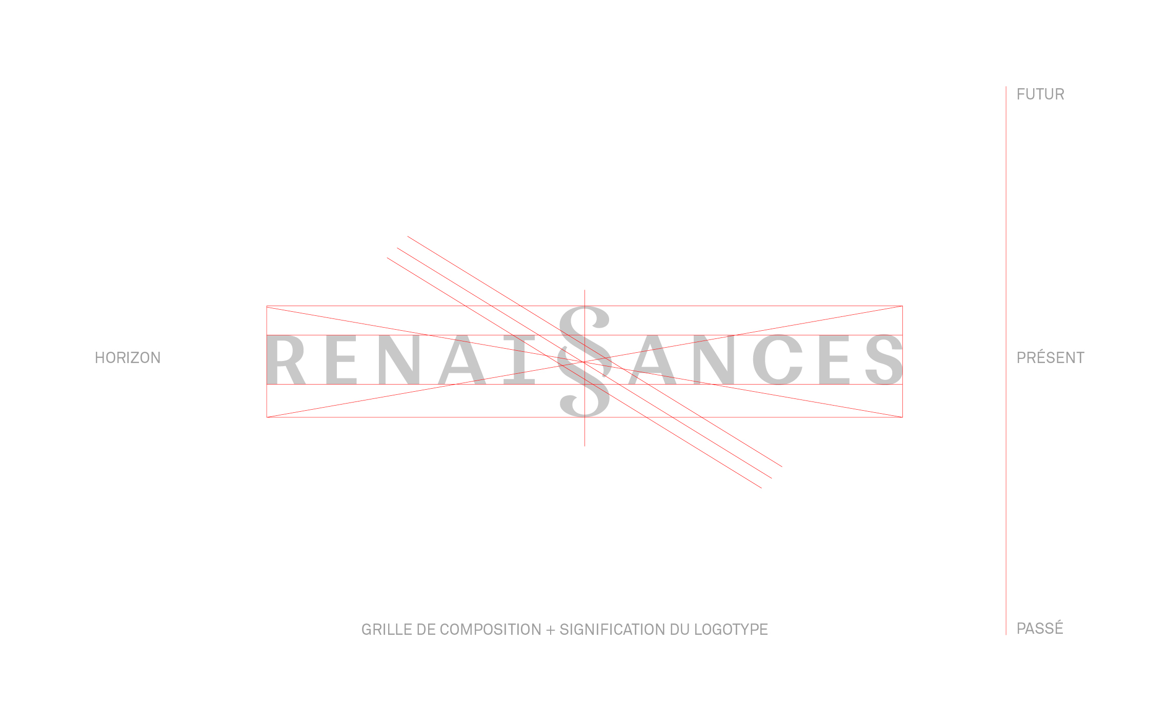 La création du logotype Renaissances est un dessin sur-mesure du lettrage Renaissances qui intègre un emblème au centre du mot. La répétition centrale des deux S de Renaissances devient une ligature typographique connue pour être le symbole paragraphe. Cet emblème raconte le projet entrepreneurial «Renaissances» de manière impactante et poétique. La graphie verticale et bouclée du symbole paragraphe communique aussi l’idée d’architecture et d’ornementation. Le doublement du S communique l’idée de renaissance, tout en créant un lien historique fort entre passé, présent et futur.