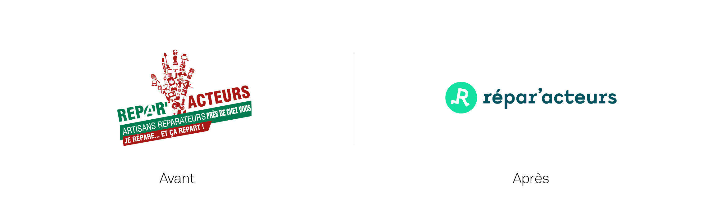 Le précédent logo était constitué du nom "Répar’acteurs" à l’intérieur duquel s’intercalait une main. Cette dernière était composée d’un ensemble de pictogrammes représentant divers objets pouvant être pris en charge par le réseau d’artisans. Le logotype ne rendait pas forcément compte de la démarche et de son esprit durable et social. En effet, cette main brandie à l’aspect presque décharné s’apparentait davantage au geste "STOP", plutôt qu’à une main tendue nous invitant à une consommation plus responsable.