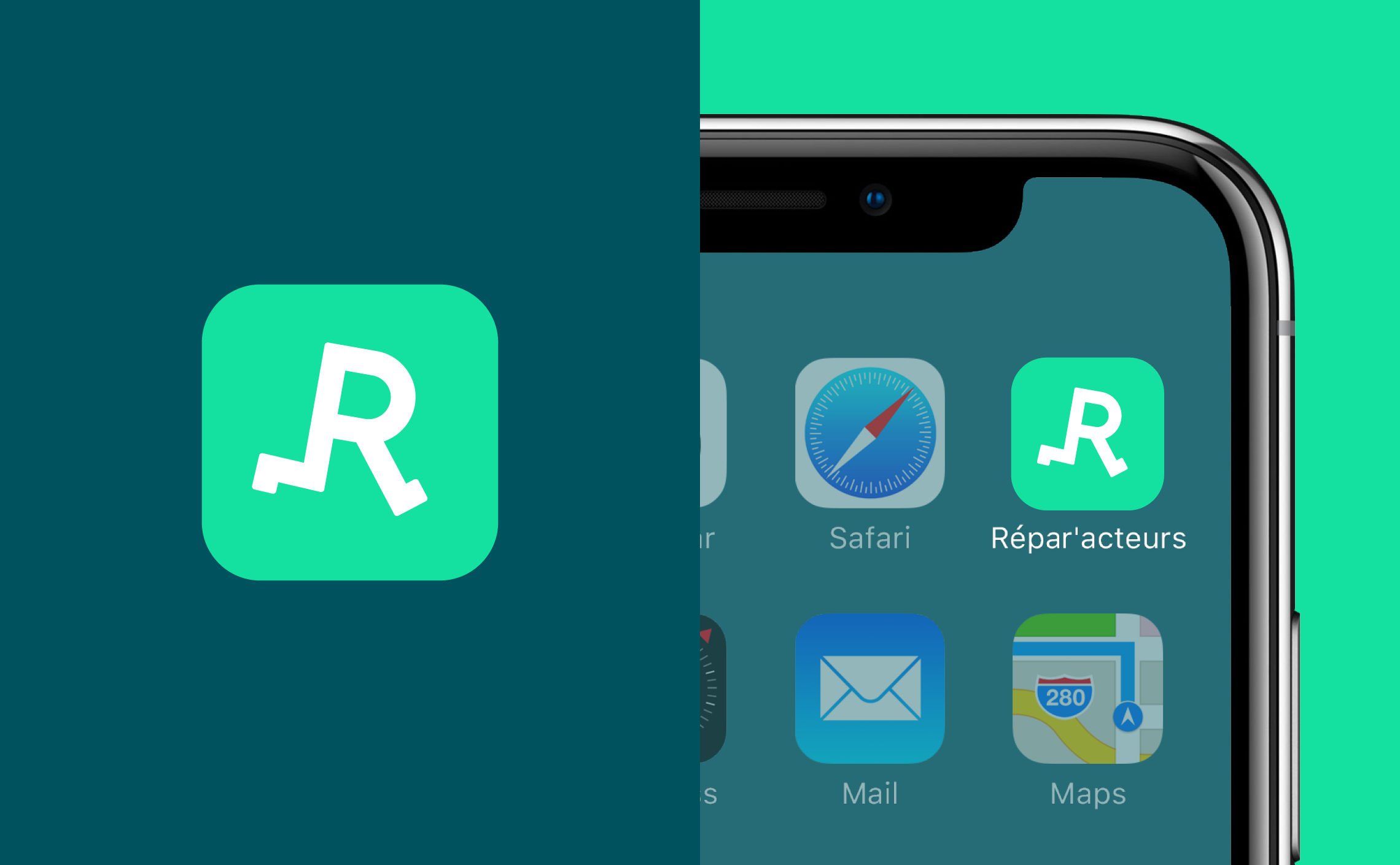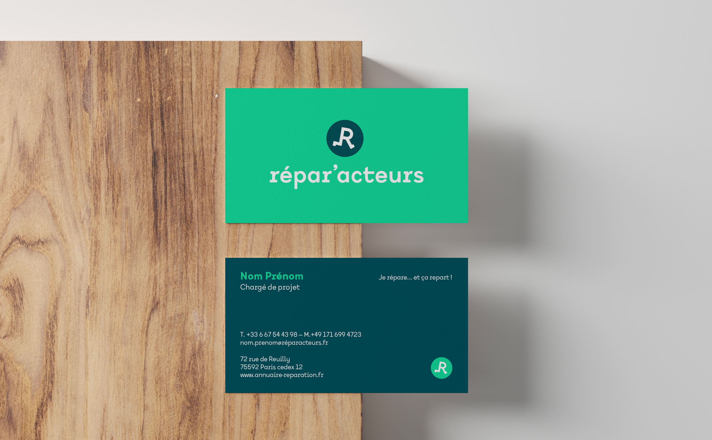 Les Répar’acteurs remettent sur pieds nos objets, c’est pourquoi nous avons décidé de faire de même avec leur logo. En effet, le logotype est ici la traduction visuelle de la baseline "Je répare... et ça repart". La lettre "R" est érigée en symbole, elle se voit greffée deux petits pieds et se met désormais à gambader ! Simple et accessible, ce logo invite à l'action !
