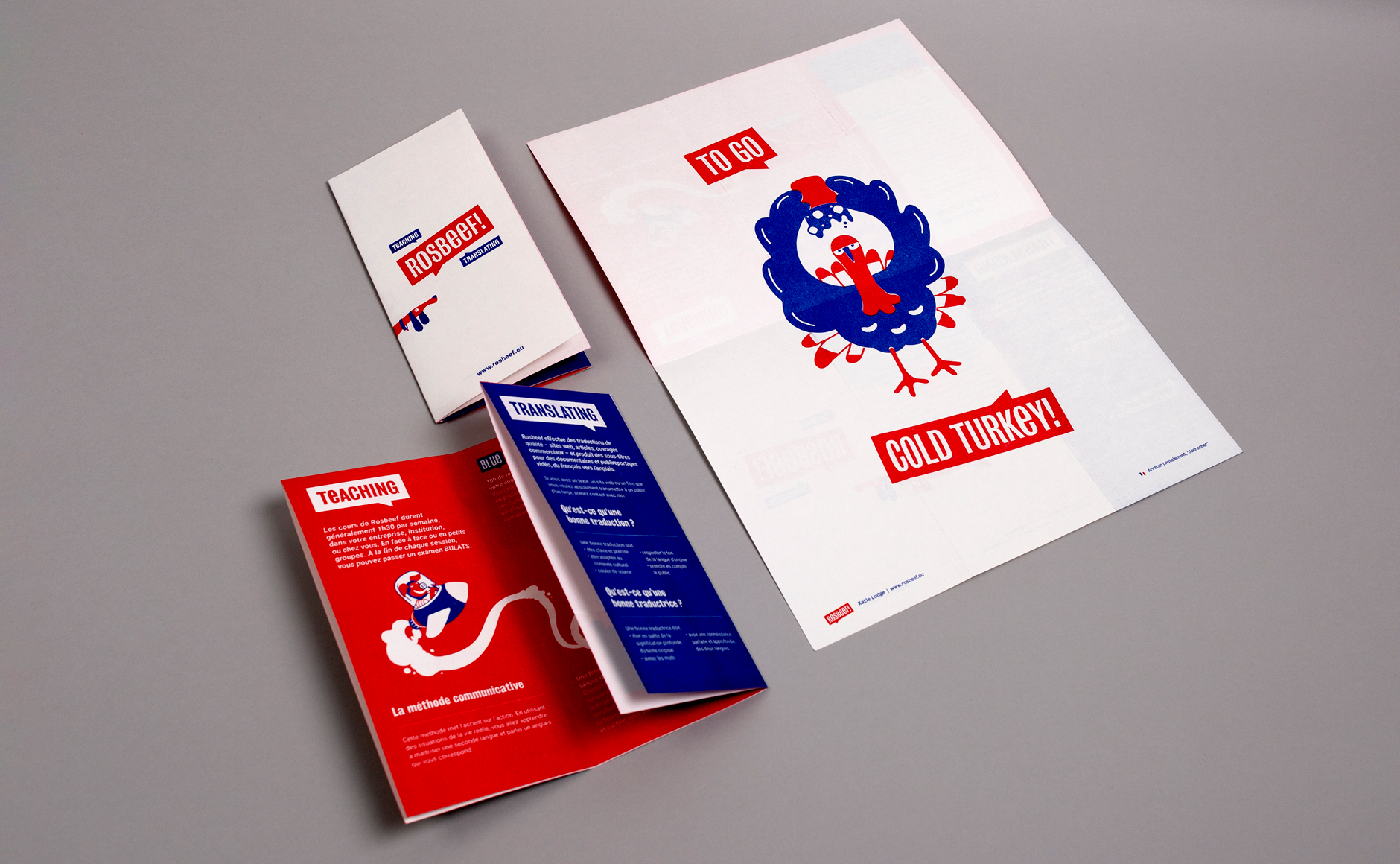 On retrouve les 8 illustrations au dos des dépliants, créant ainsi une petite série de posters Rosbeef.