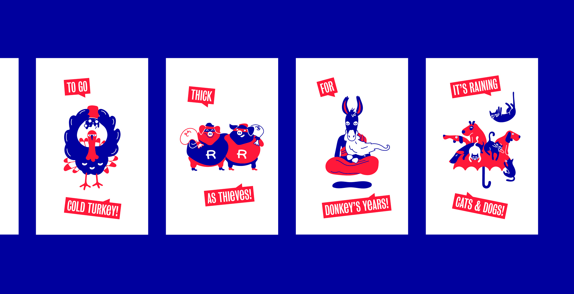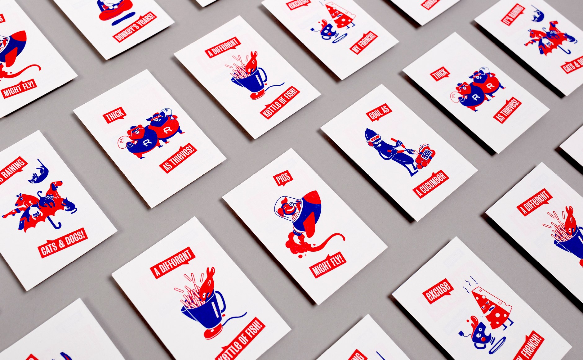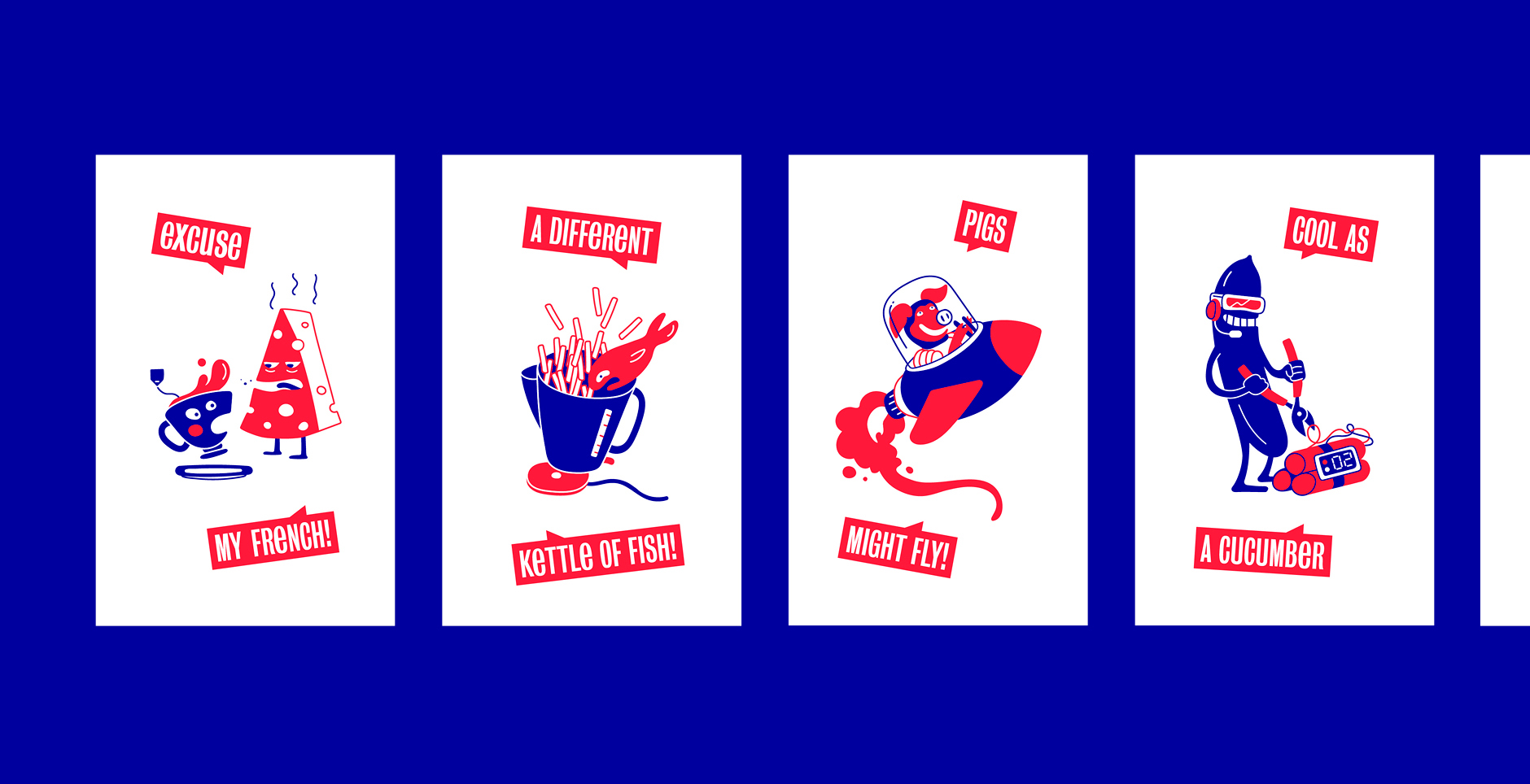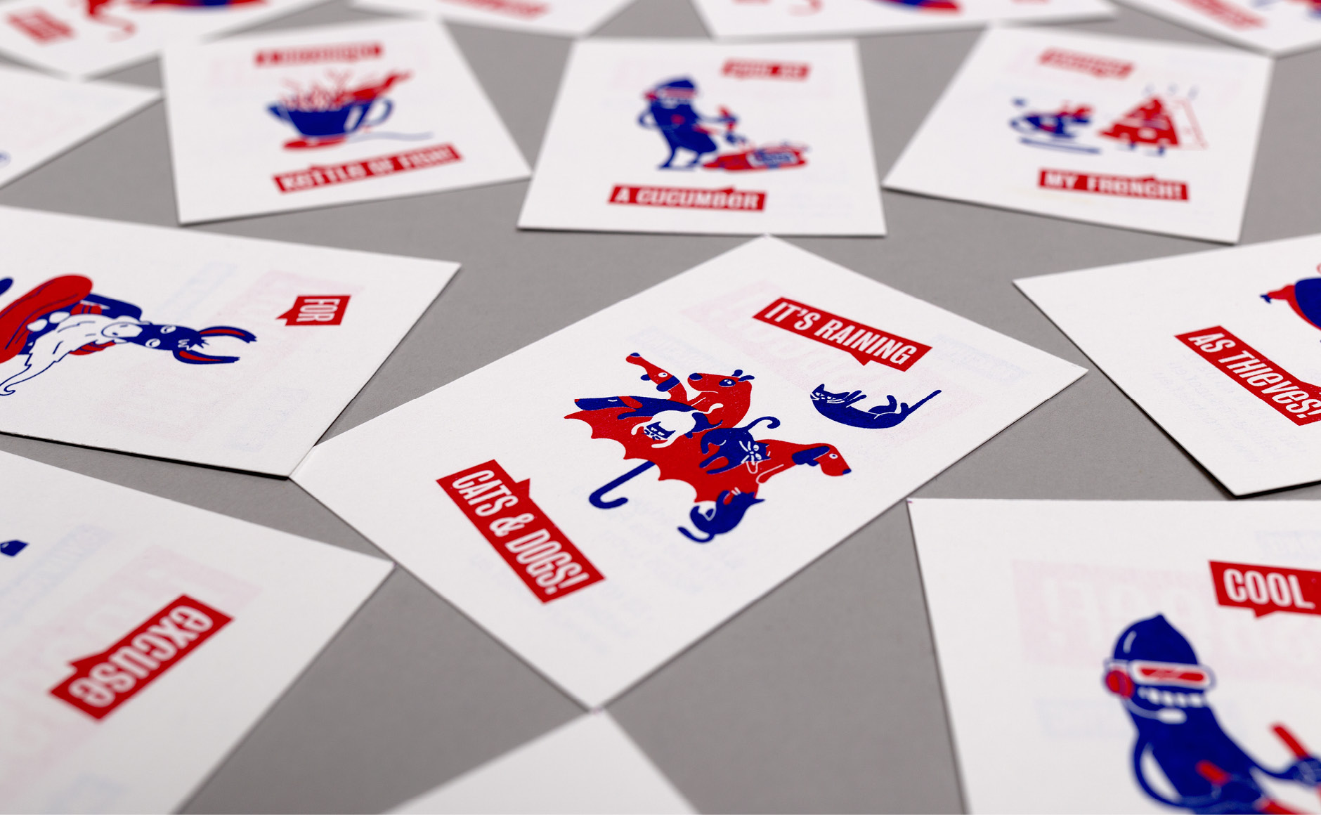 L'illustration constitue une part importante de cette identité visuelle. Il s'agissait d'illustrer ces célèbres expressions populaires intraduisibles (par exemple : "Il pleut comme vache qui pisse" devenant "it's raining cats and dogs") afin de créer un univers visuel ludique et poétique, propice à aborder la langue de Shakespeare de manière décontractée.