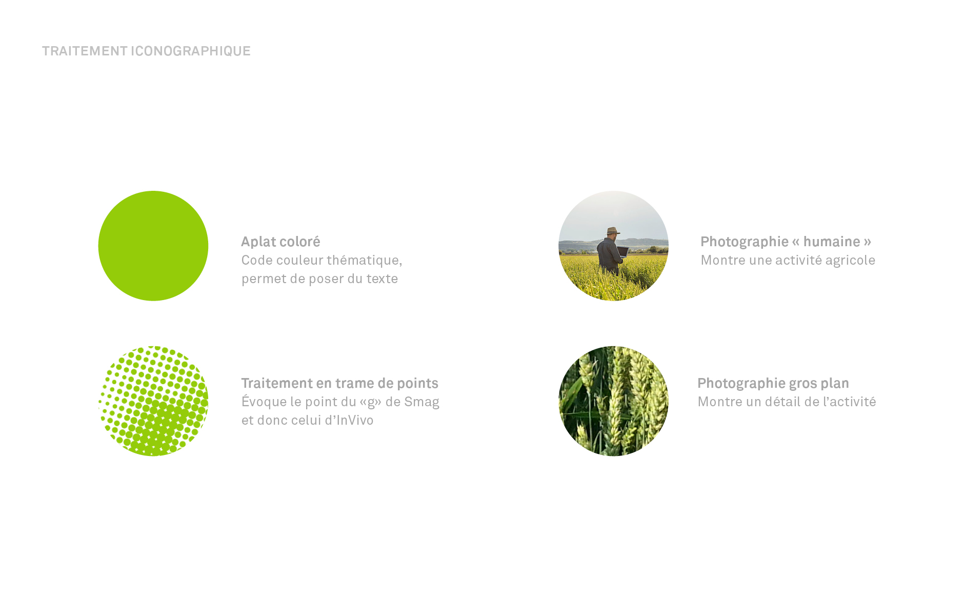 Ayant précédemment eu l'opportunité de créer les identités visuelles de Agrosolutions, agricultures, filières, territoires et Be Api, agriculture de précision, nous avons eu une préoccupation forte de ne pas réitérer les mêmes solutions graphiques et de trouver une réponse sur-mesure afin que SMAG puisse revendiquer une identité graphique singulière au sein du pôle agriculture de INVIVO.