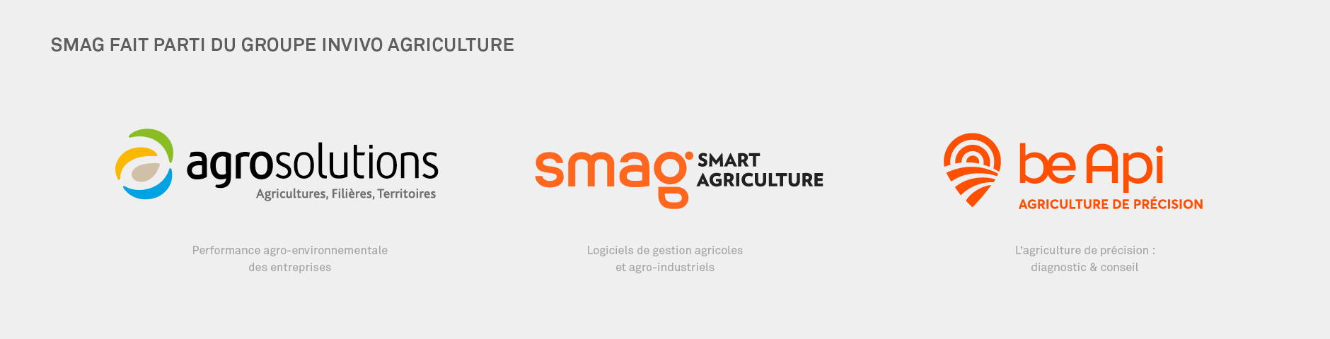 Née en 2012 lors du rapprochement des sociétés Maferme et Neotic, le groupe Maferme-Neotic est devenu SMAG (Smart Agriculture) en janvier 2015. La marque SMAG a depuis acquis une forte notoriété qui lui permet d’exister et d’être identifiée par le marché sans sa baseline. Elle ambitionne de devenir un leader du big data agricole en France et à l’international. Pour réaliser ce projet, SMAG a besoin d'accroitre la reconnaissance de son nom et d'affirmer sa différenciation par rapport à la concurrence, à savoir le développement de solution Cloud pour l’agriculture. L’Offre SMAG, comme Agrosolutions et Be Api, fait partie de l’écosystème de marques de INVIVO agriculture.