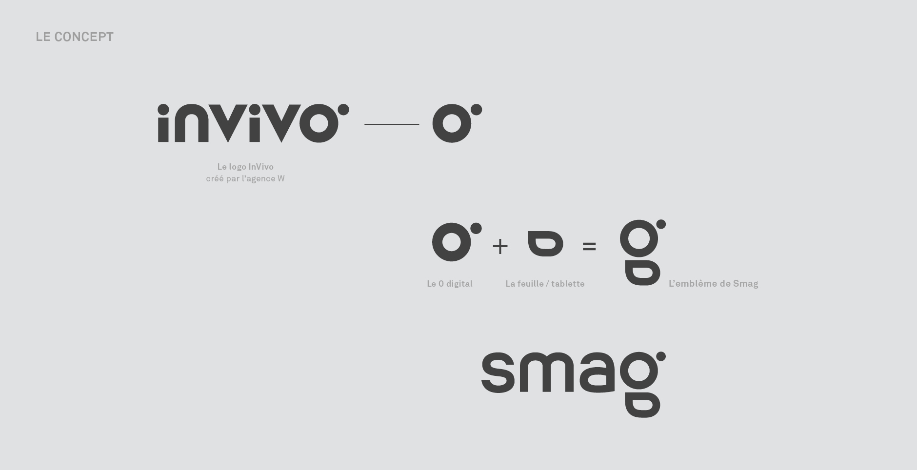 C'est cette ambition qui a motivée nos équipes dans la conception d'un nouvel emblème SMAG. Celui-ci a pour vocation de symboliser le digital et le monde agricole. En faisant un clin d'œil au graphisme du "O" issu du logo INVIVO et en y ajoutant le dessin d'une feuille stylisée qui représente le monde agricole et également une tablette, nous aboutissons à la création d'un "g", dernière lettre du nom SMAG. La connexion avec le logo INVIVO, actionnaire de SMAG, permet de garder une certaine cohérence et de rassembler les utilisateurs en une même communauté. Contrairement aux logotypes de Agrosolutions et Be Api, l'emblème de SMAG est directement intégré dans son bloc typographique.