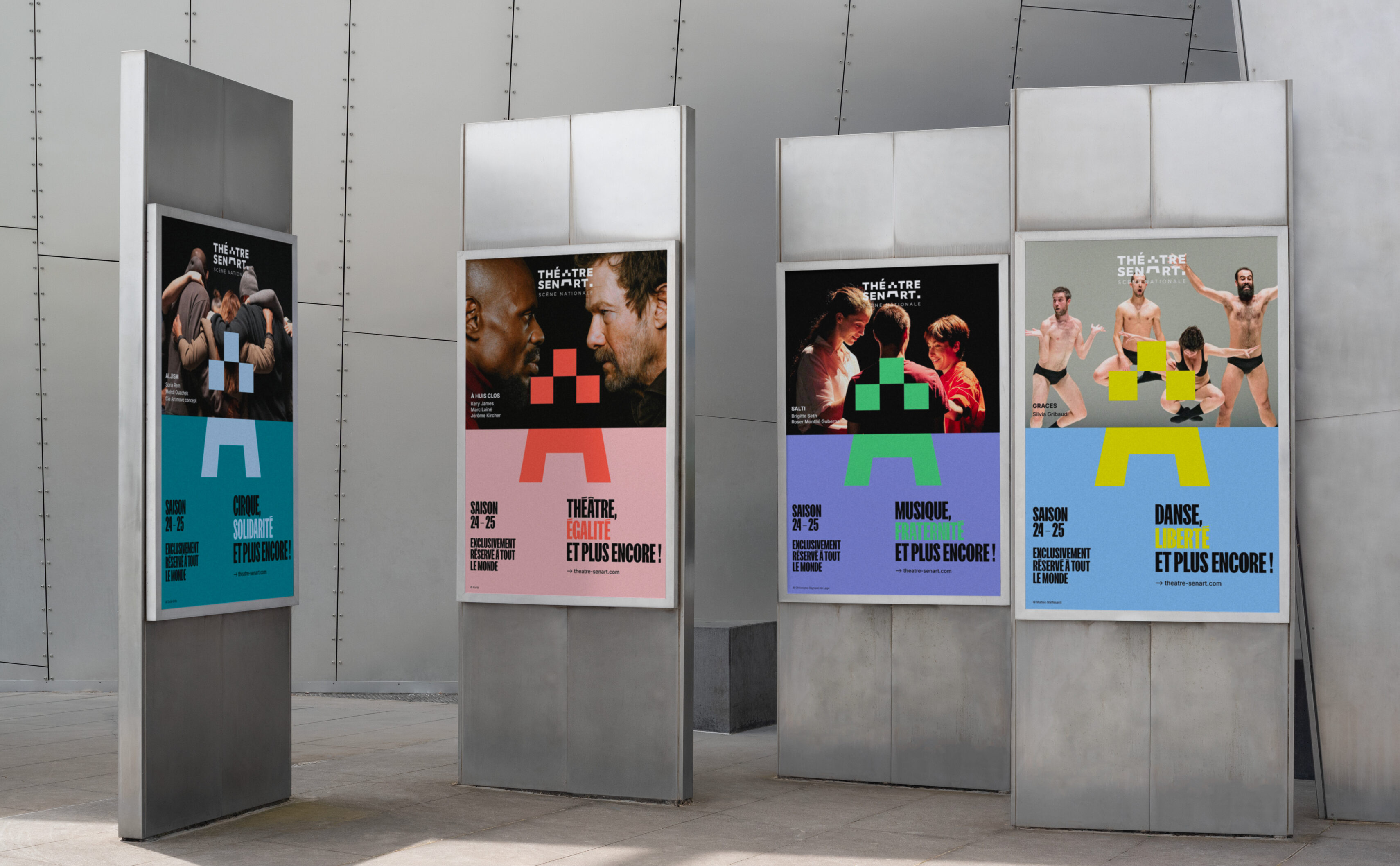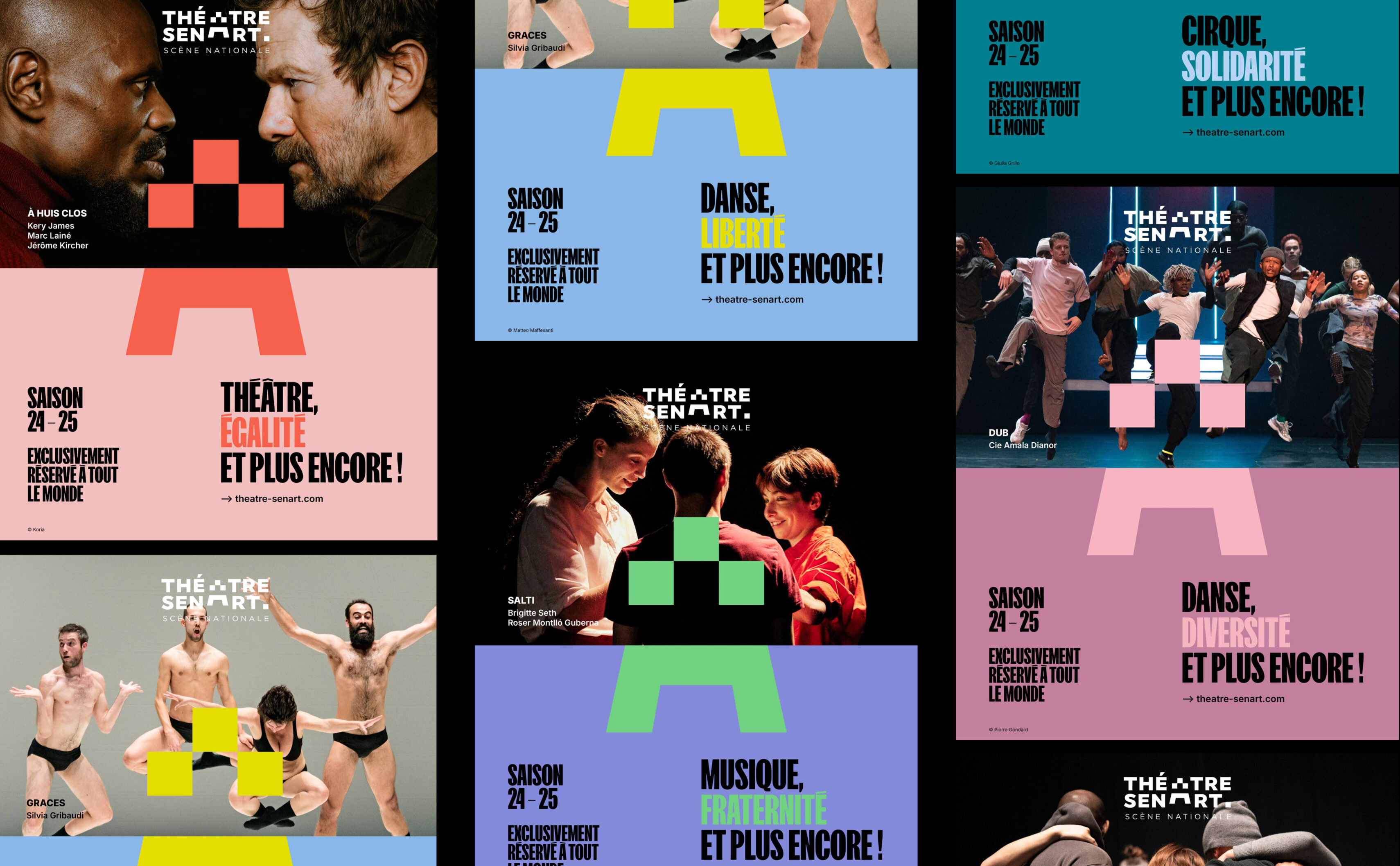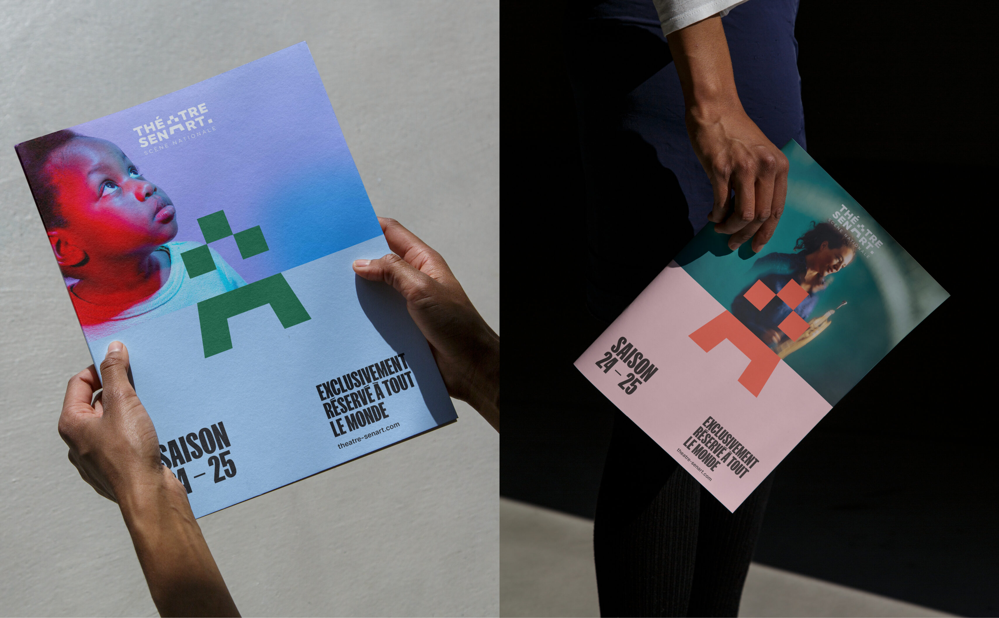 Déjà présent dans la communication du théâtre mais très peu mis en avant, le slogan « Exclusivement réservé à tout le monde » devient un élément central dans l’identité. Composé avec le caractère FK Skreamer, l’intitulé prend une force notable et s’impose comme le manifeste du Théâtre-Sénart.