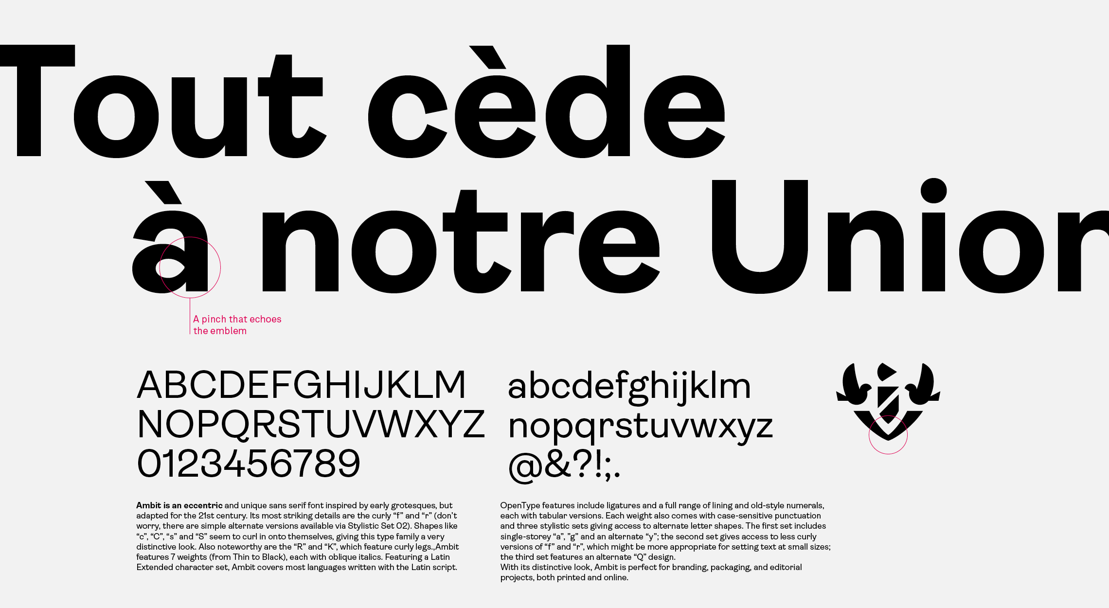 Trois typographies composent la charte graphique. La typographie principale de la nouvelle identité est Ambit distribué par la fonderie CoType. Ambit fait directement écho au graphisme de l'emblème avec ses courbes et jonctions de lettres. C’est un caractère à la rondeur chaleureuse et hospitalière, parfaitement en adéquation avec des valeurs de la ville. Les caractères Basier Narrow et PT Serif viennent enrichir la charte. Fonctionnels, ils permettent un complément éditorial et une bonne lisibilité signalétique.